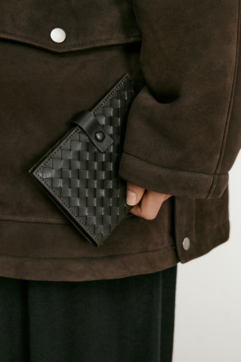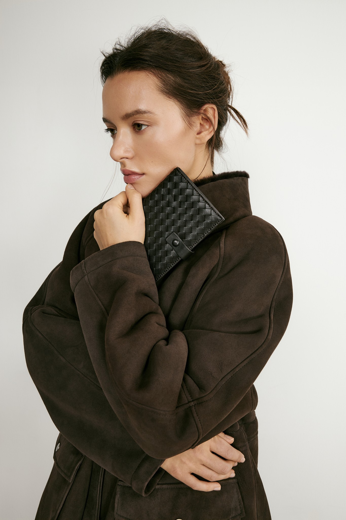 1. Выполнено из натуральной кожи с плетеной фактурой и дополнено удобной застежкой на клапан с кнопкой.