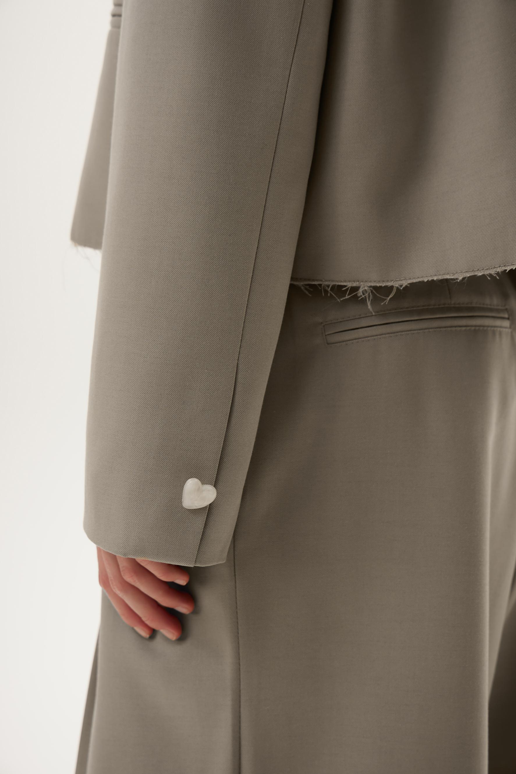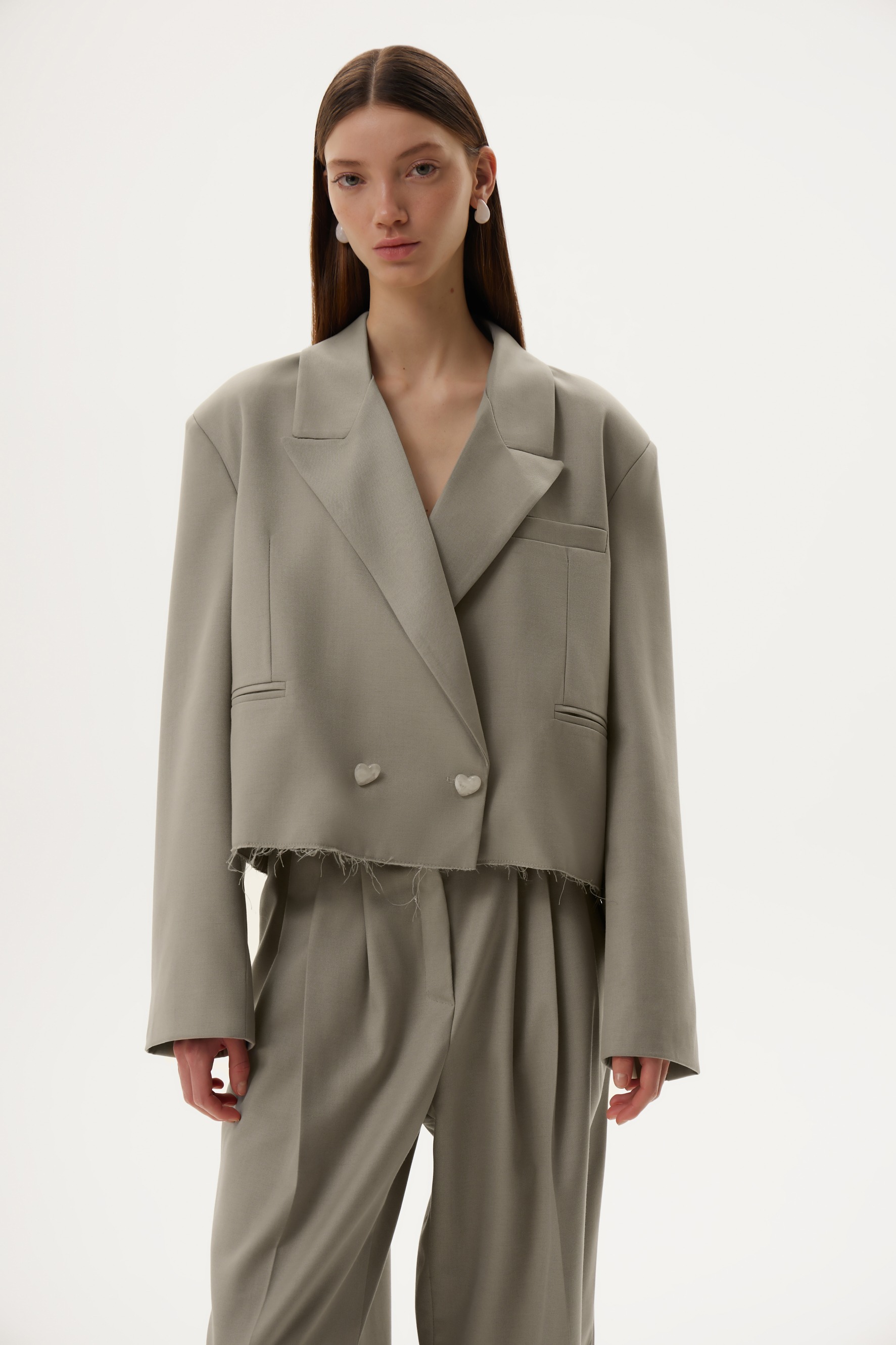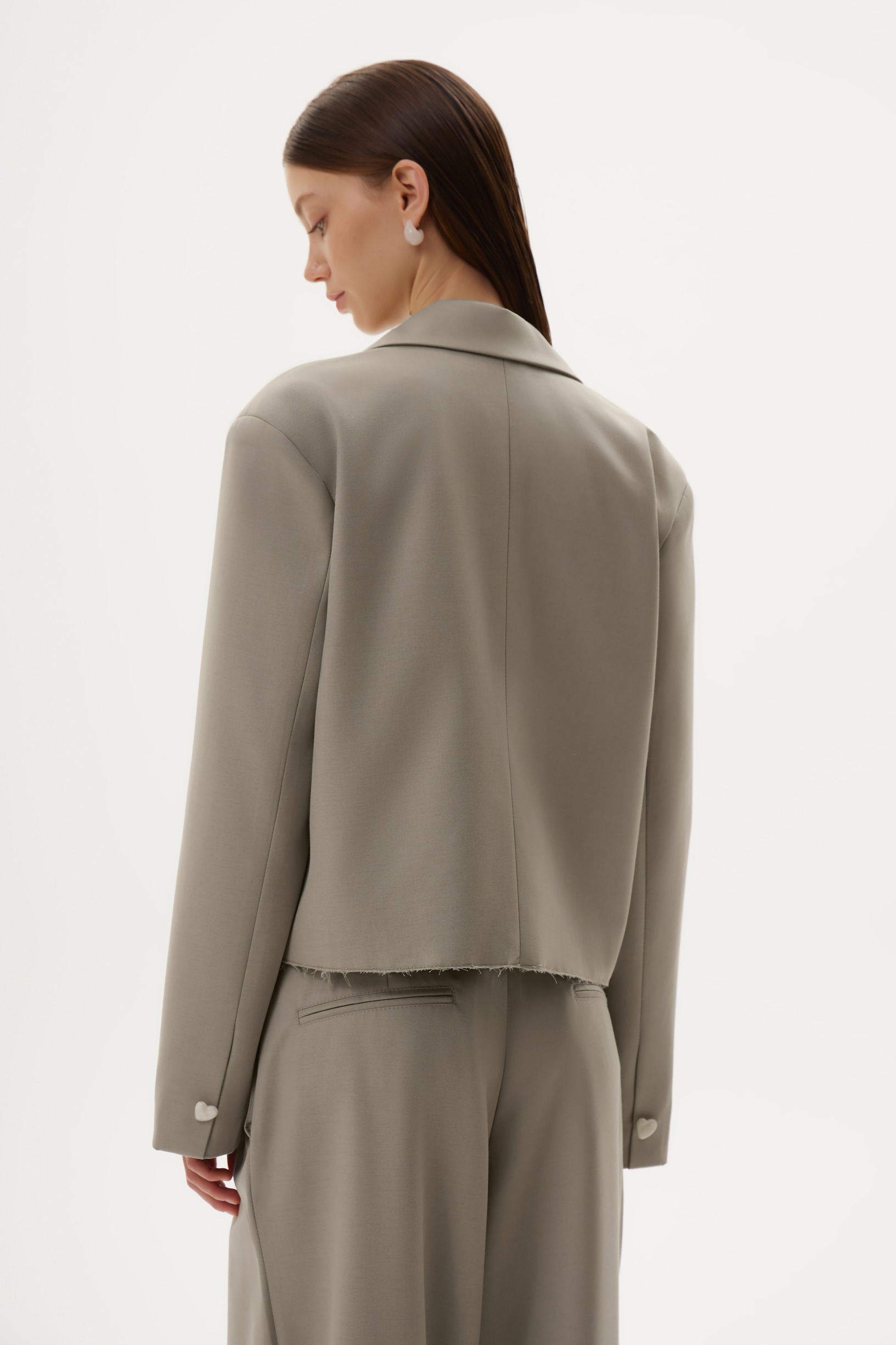 Эту модель отличает нетривиальный крой: укороченная длина, широкое плечо, большой лацкан. Необработанный край придает расслабленный вид, а перламутровые пуговицы в форме сердца подчеркивают оригинальный характер изделия.