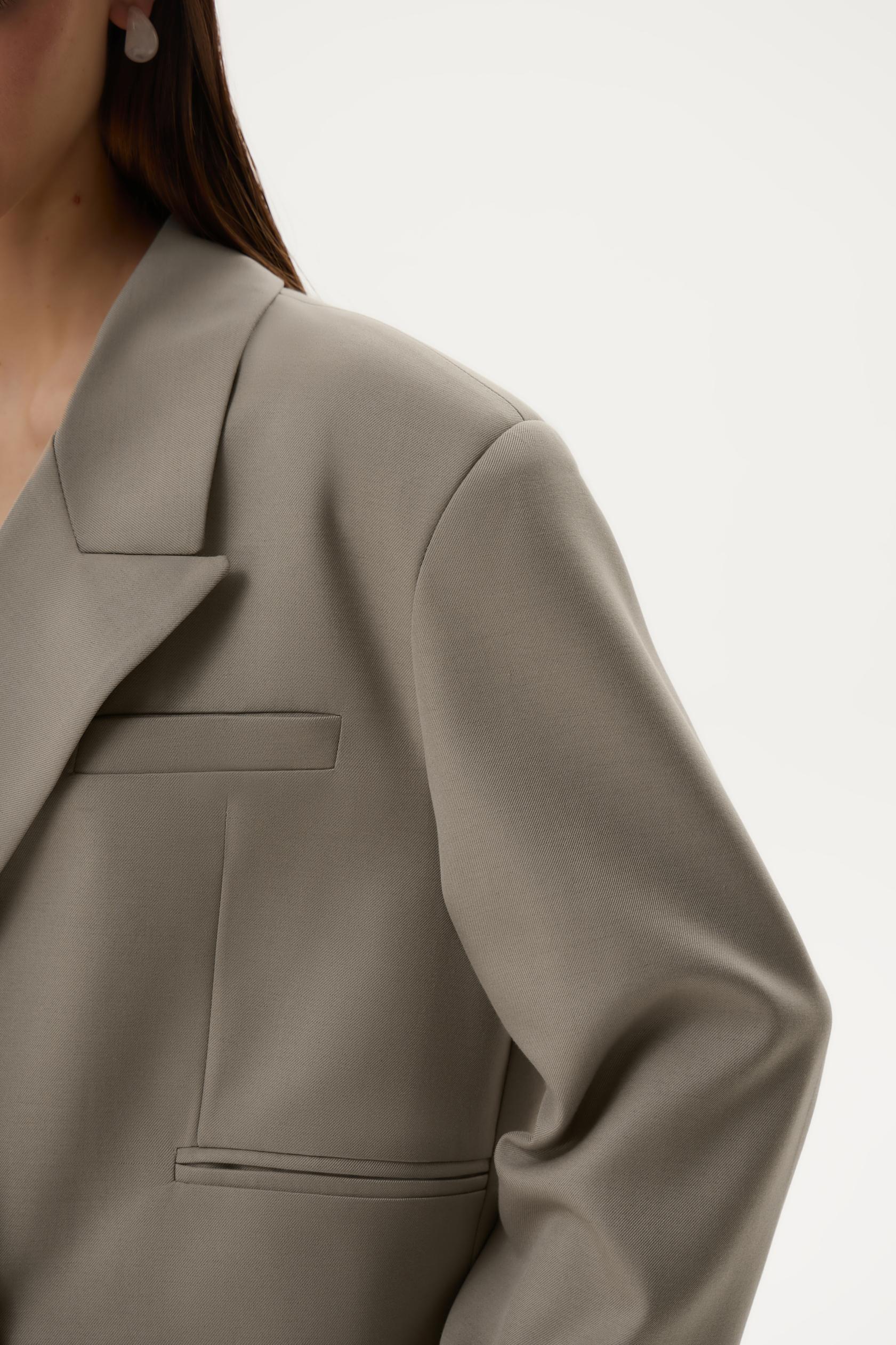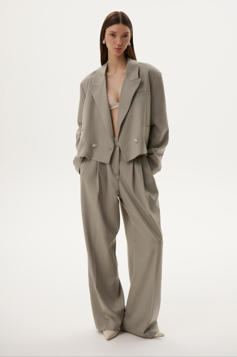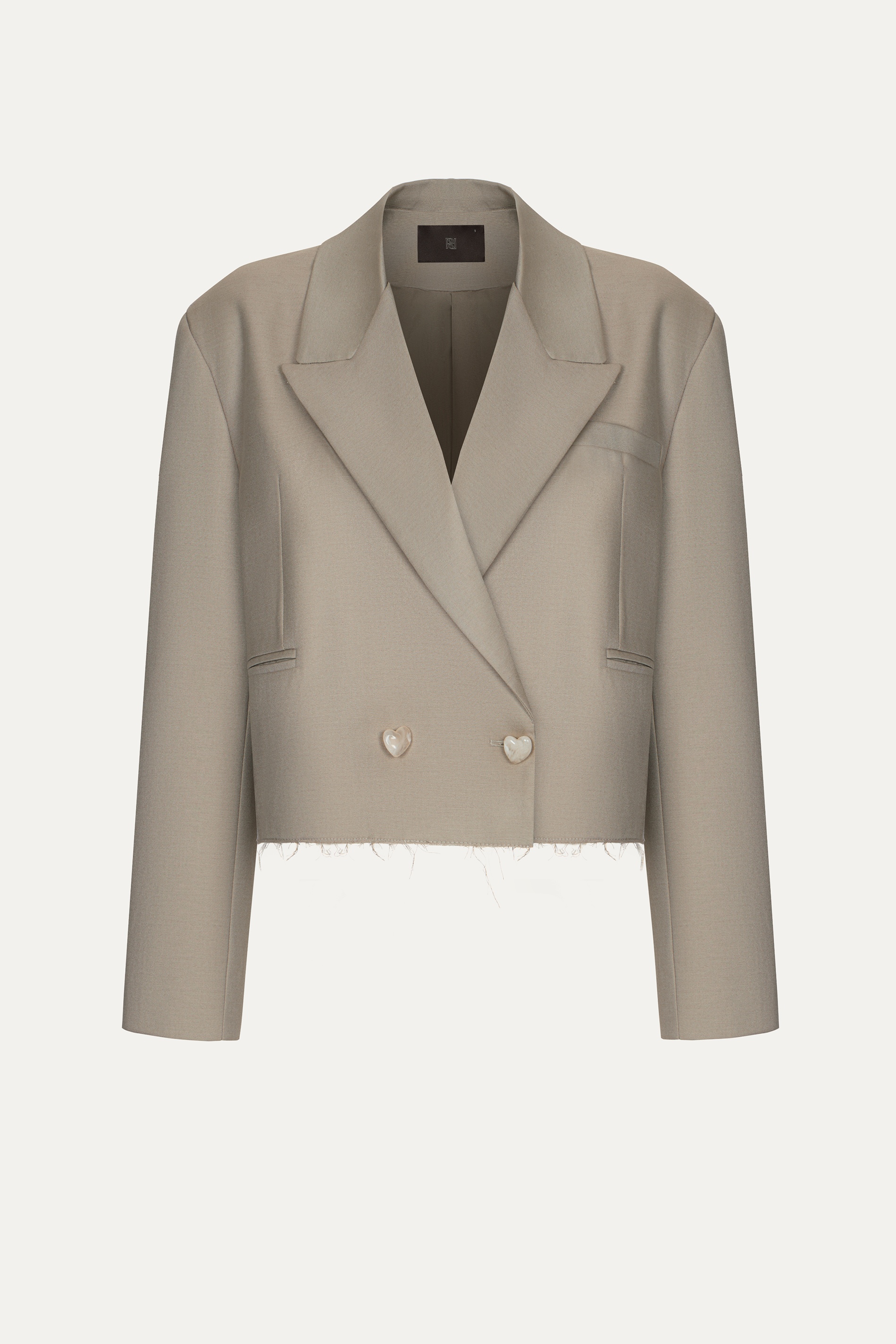 Эту модель отличает нетривиальный крой: укороченная длина, широкое плечо, большой лацкан. Необработанный край придает расслабленный вид, а перламутровые пуговицы в форме сердца подчеркивают оригинальный характер изделия.