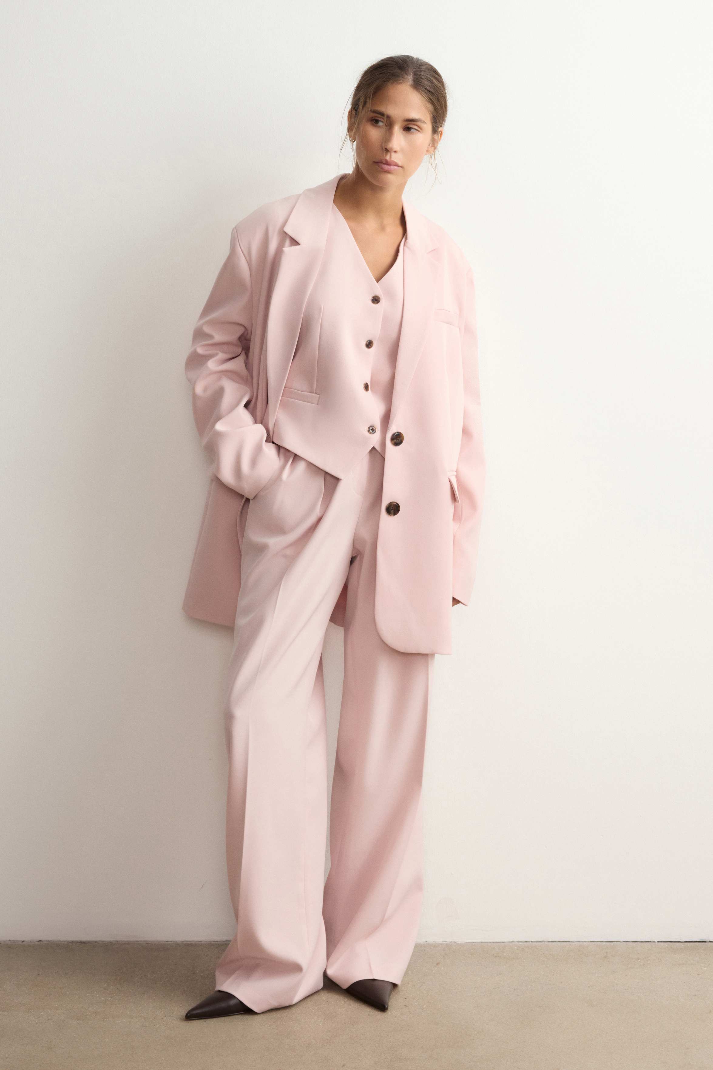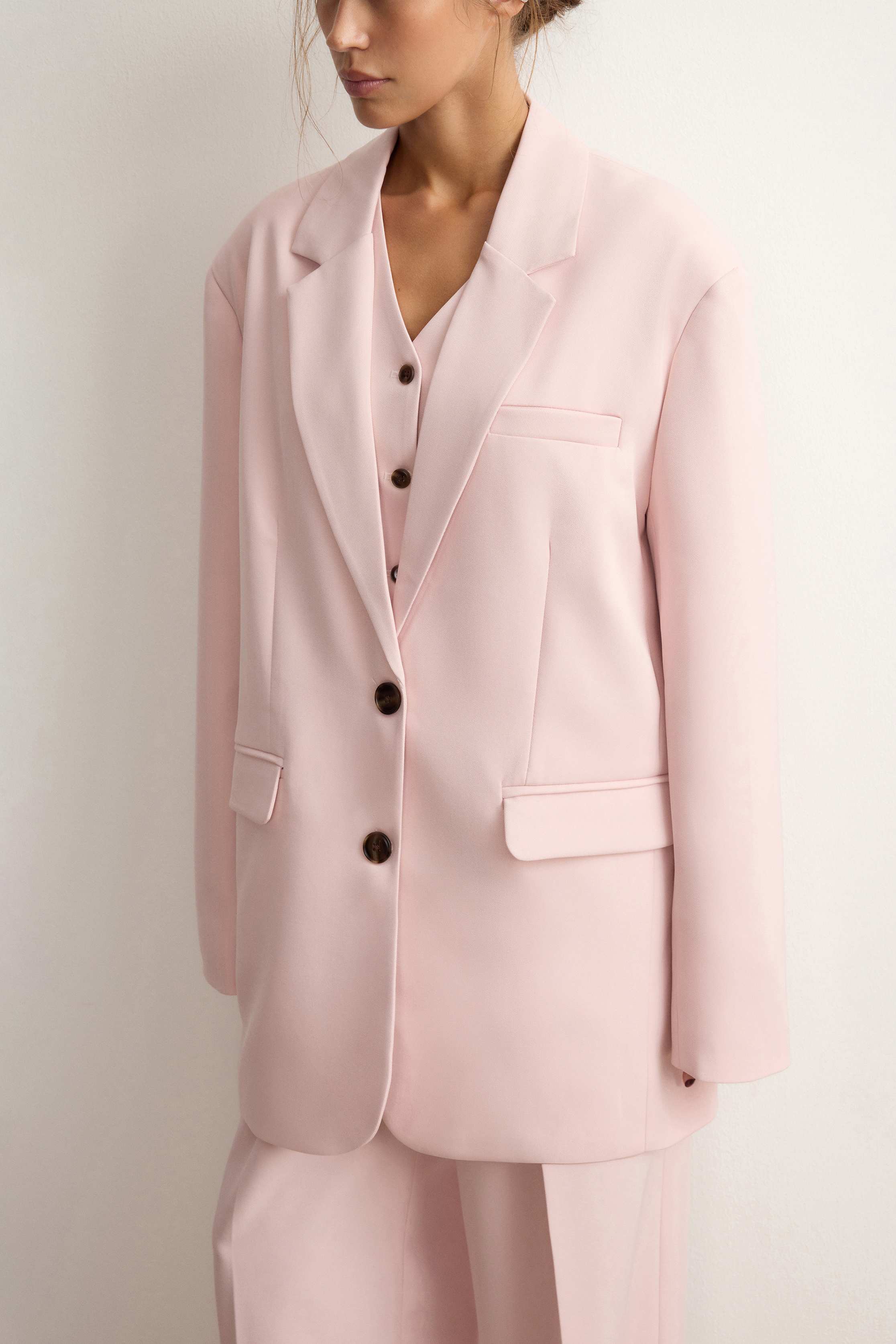 Однобортный жакет с широкими прямоугольными лацканами — классика, помноженная на функциональность и комфорт. Разработали жакет таким образом, чтобы он идеально сочетался с юбками и платьями длины мини и заканчивался на линии подола. Модель со шлицей, нагрудным карманом и боковыми клапанами застегивается роговыми пуговицами. Выполнен из костюмной ткани на основе шелковистой вискозы с мягким хлопковым подкладом.