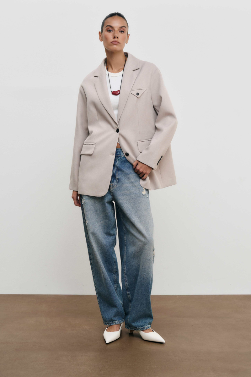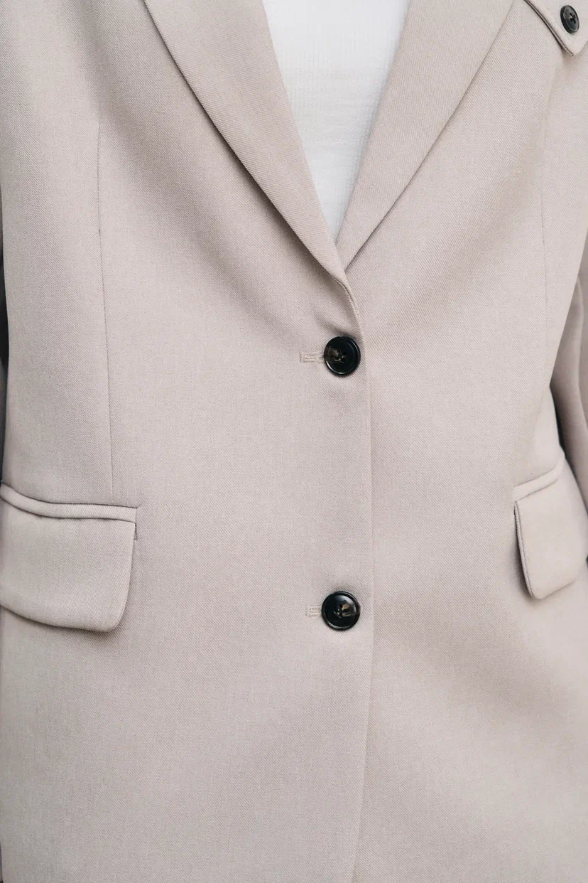Жакет идеально воплощает наш взгляд на классику: прямой силуэт, заостренные лацканы, пара боковых карманов с клапанами.