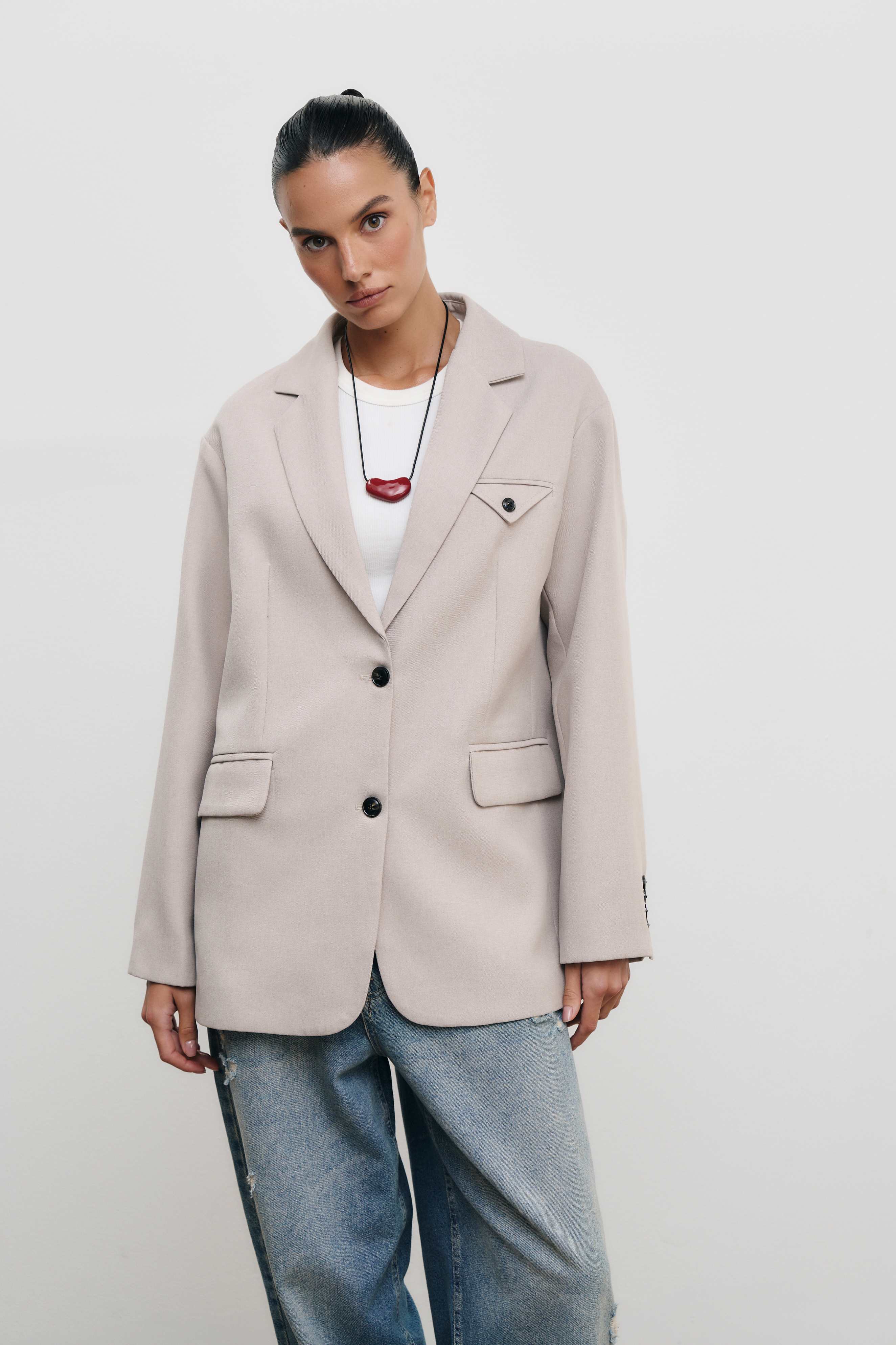 Однобортный жакет прямого кроя — лаконичная модель для деловых и вечерних образов.