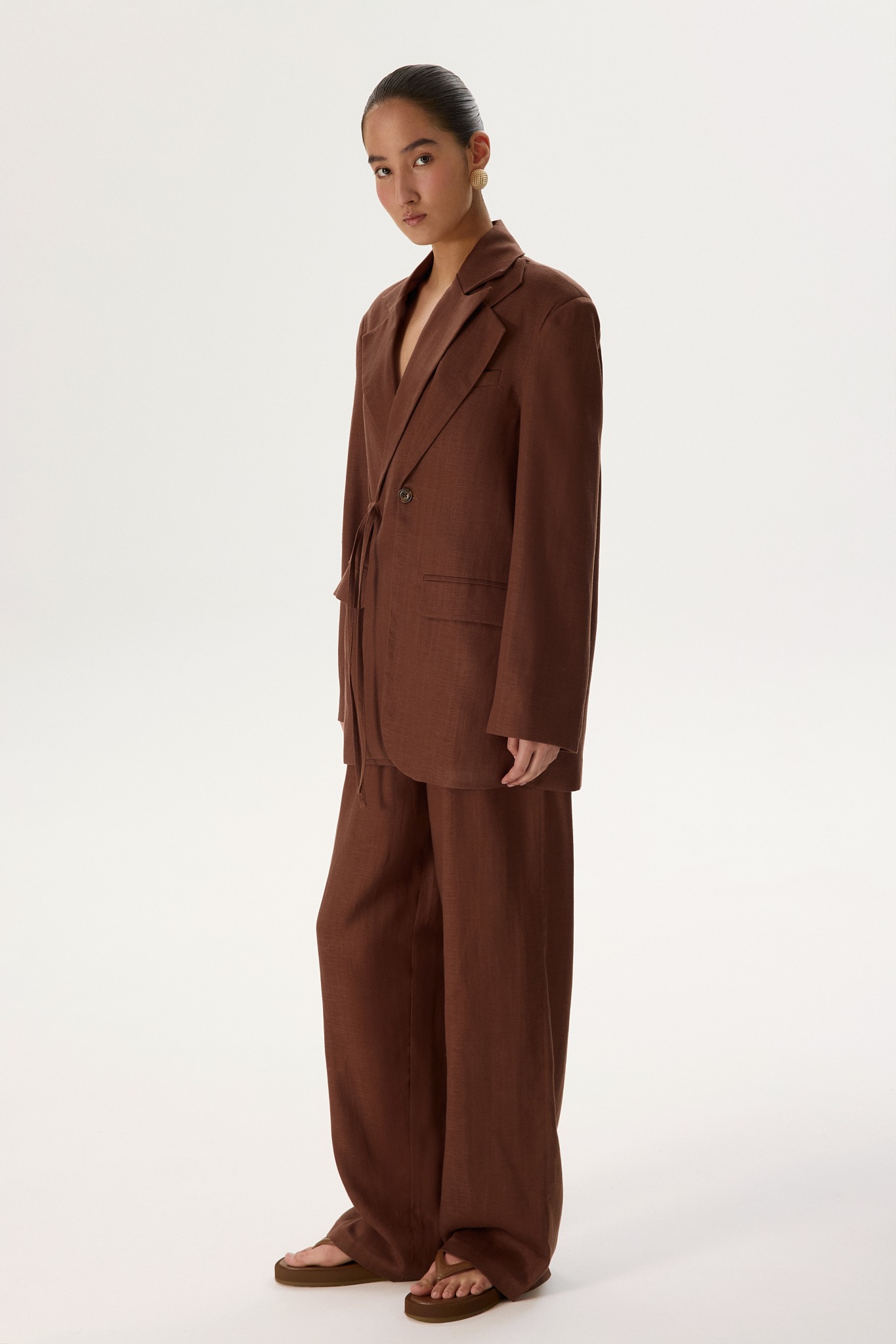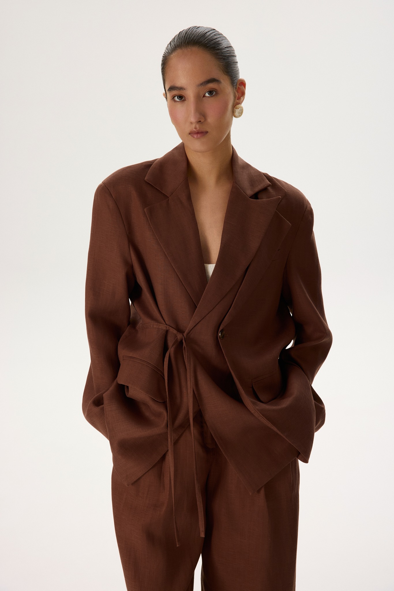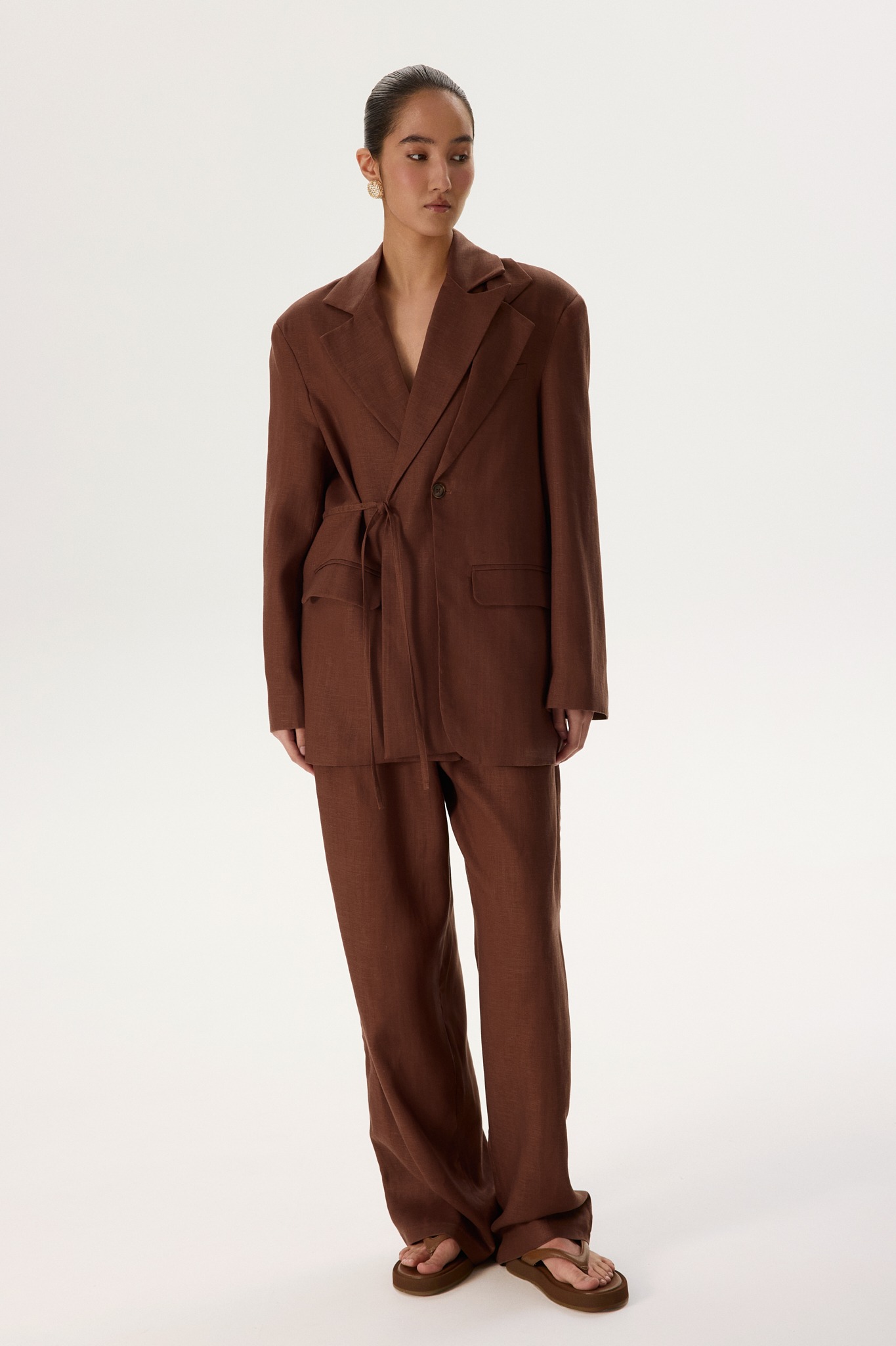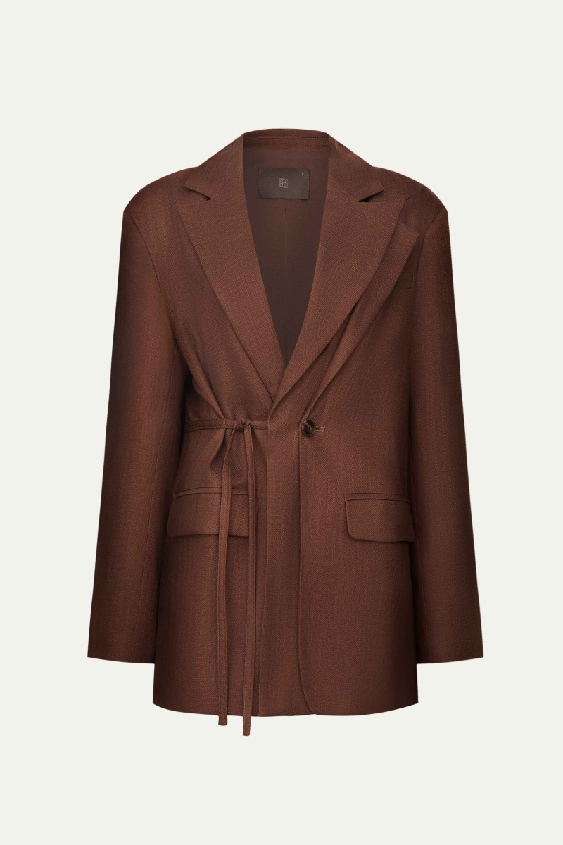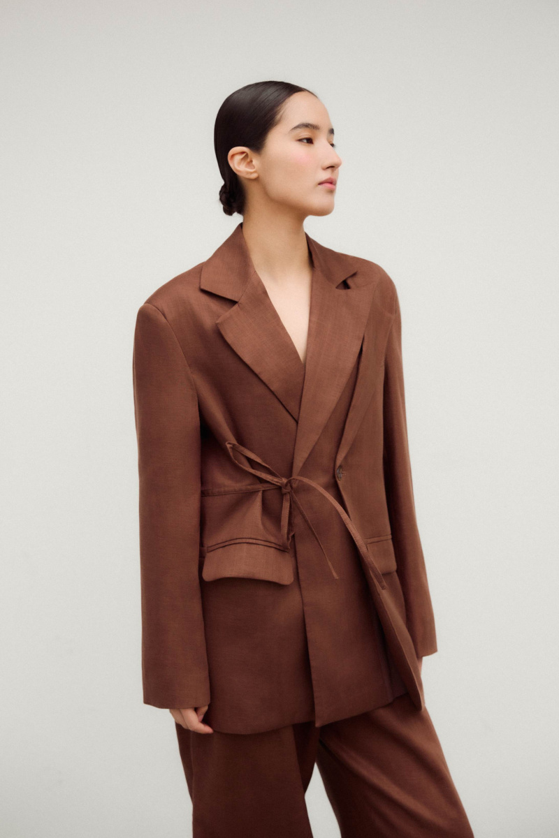 Новинка выполнена изо льна с фактурой «елочка» — такой материал отлично пропускает воздух и отводит влагу, а также ощущается на теле приятной прохладой. Для подкладки был выбран 100% натуральный хлопок, чтобы обеспечить дополнительную мягкость и комфорт.