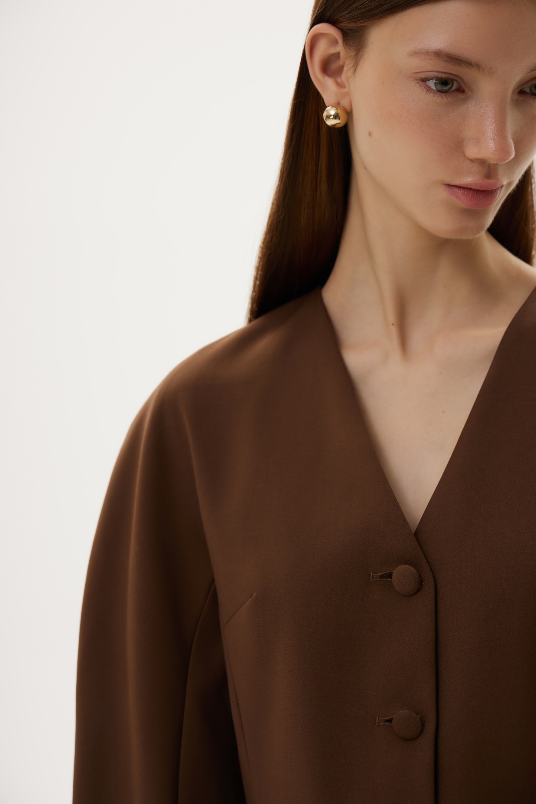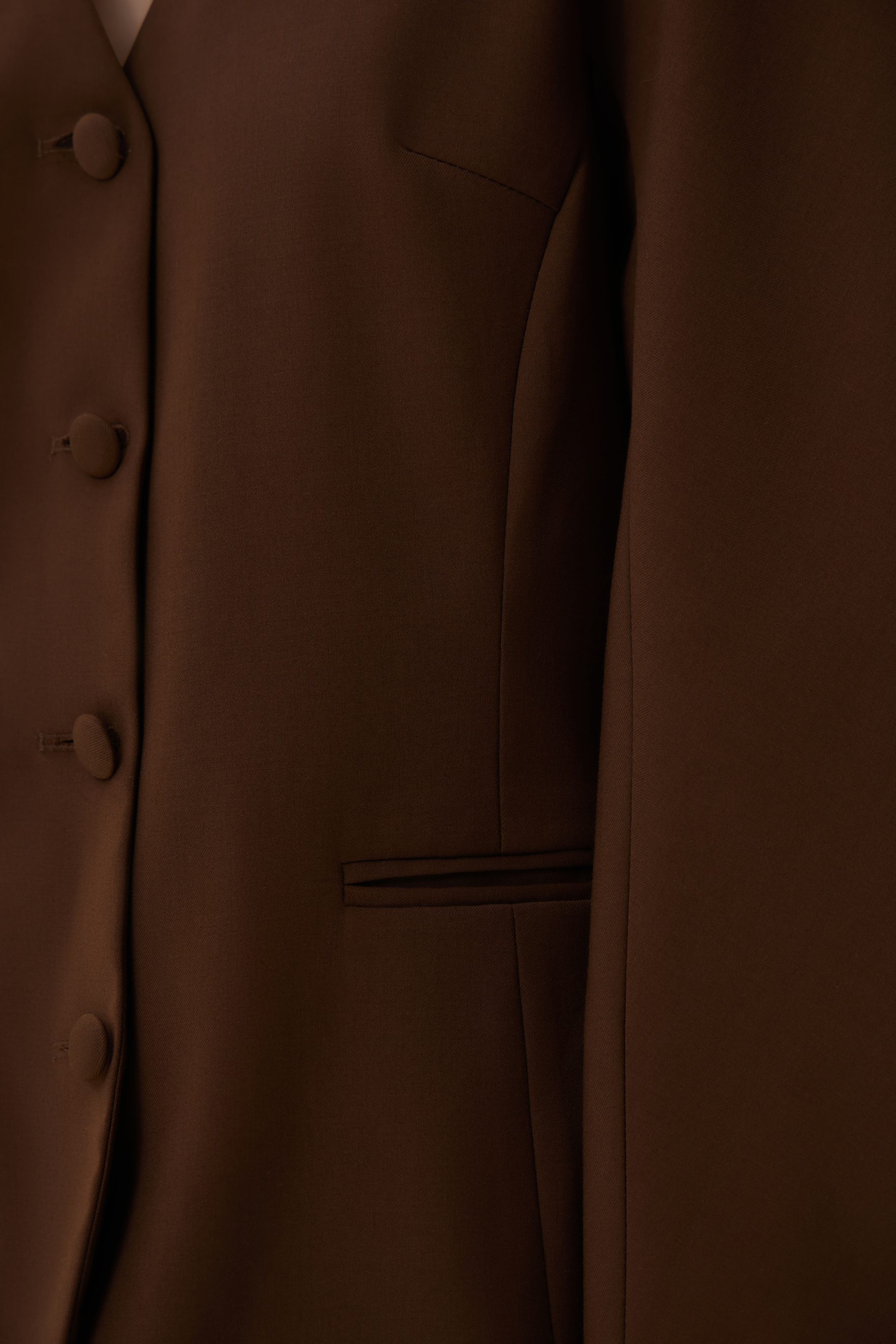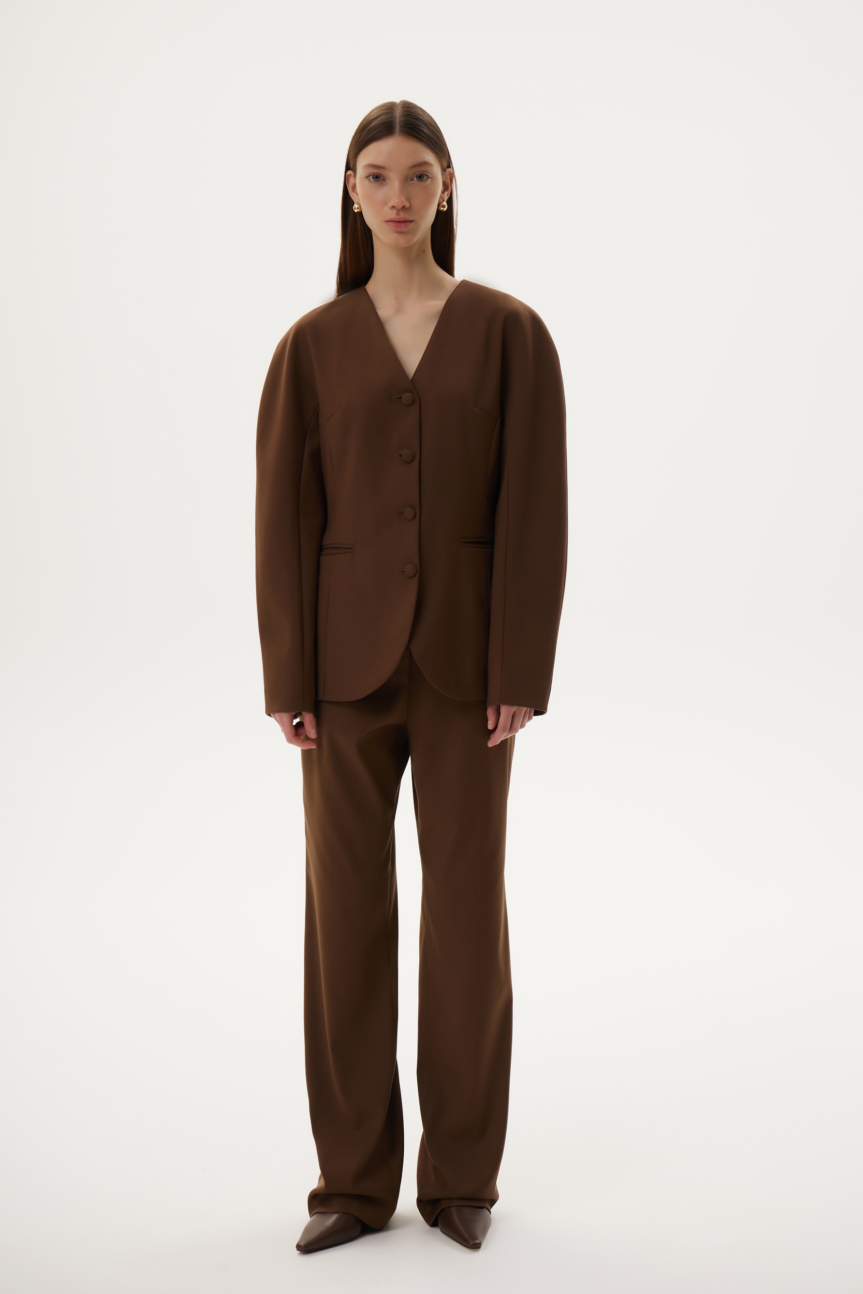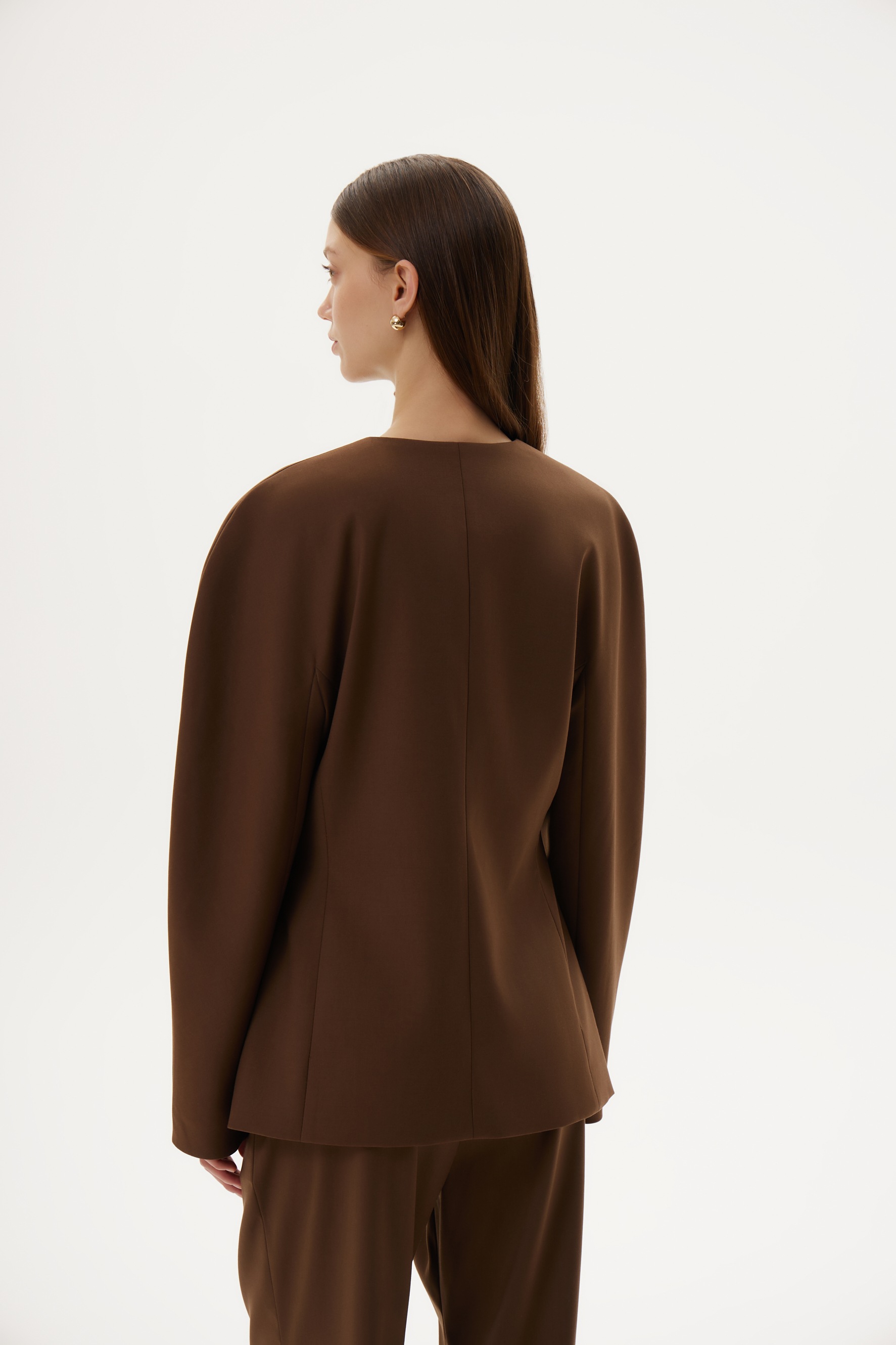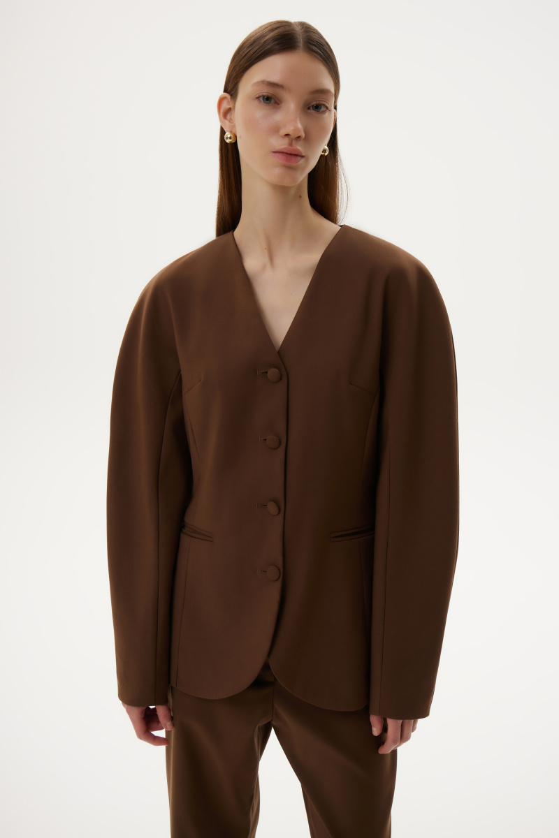 Новинка выполнена из гладкой костюмной ткани шоколадного цвета с подкладкой из шелковистой вискозы в тон.