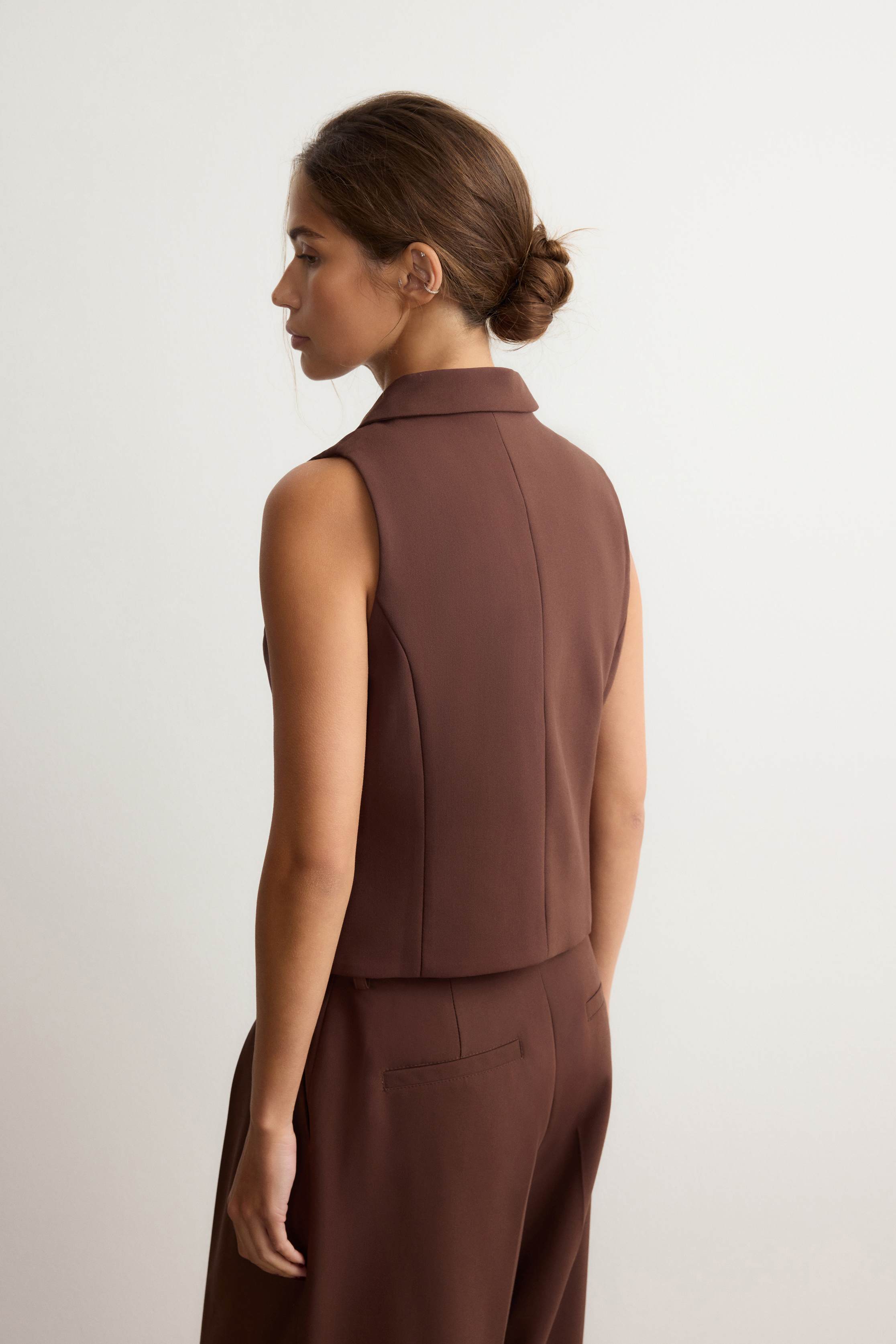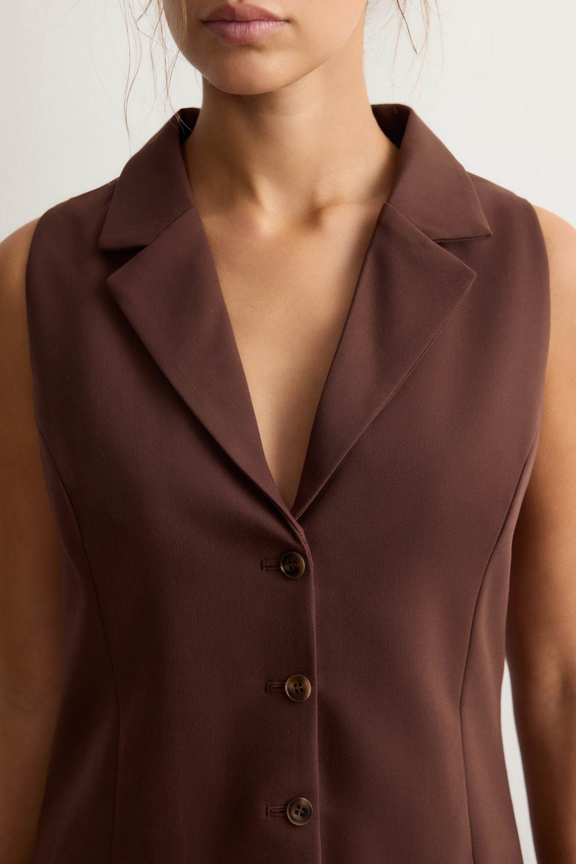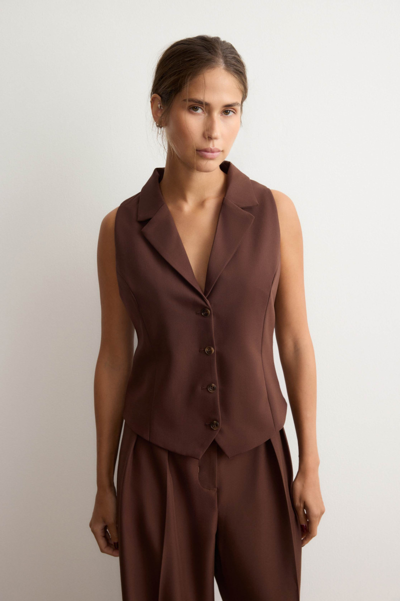 Альтернатива базовым жилетам в коллекции ROSI — модель с аккуратными лацканами. Подчеркнет фигуру с помощью приталенного кроя и рельефных швов, визуально вытягивающих силуэт, и соберет все взгляды. Выполнен из костюмной ткани на основе шелковистой вискозы с мягким хлопковым подкладом.