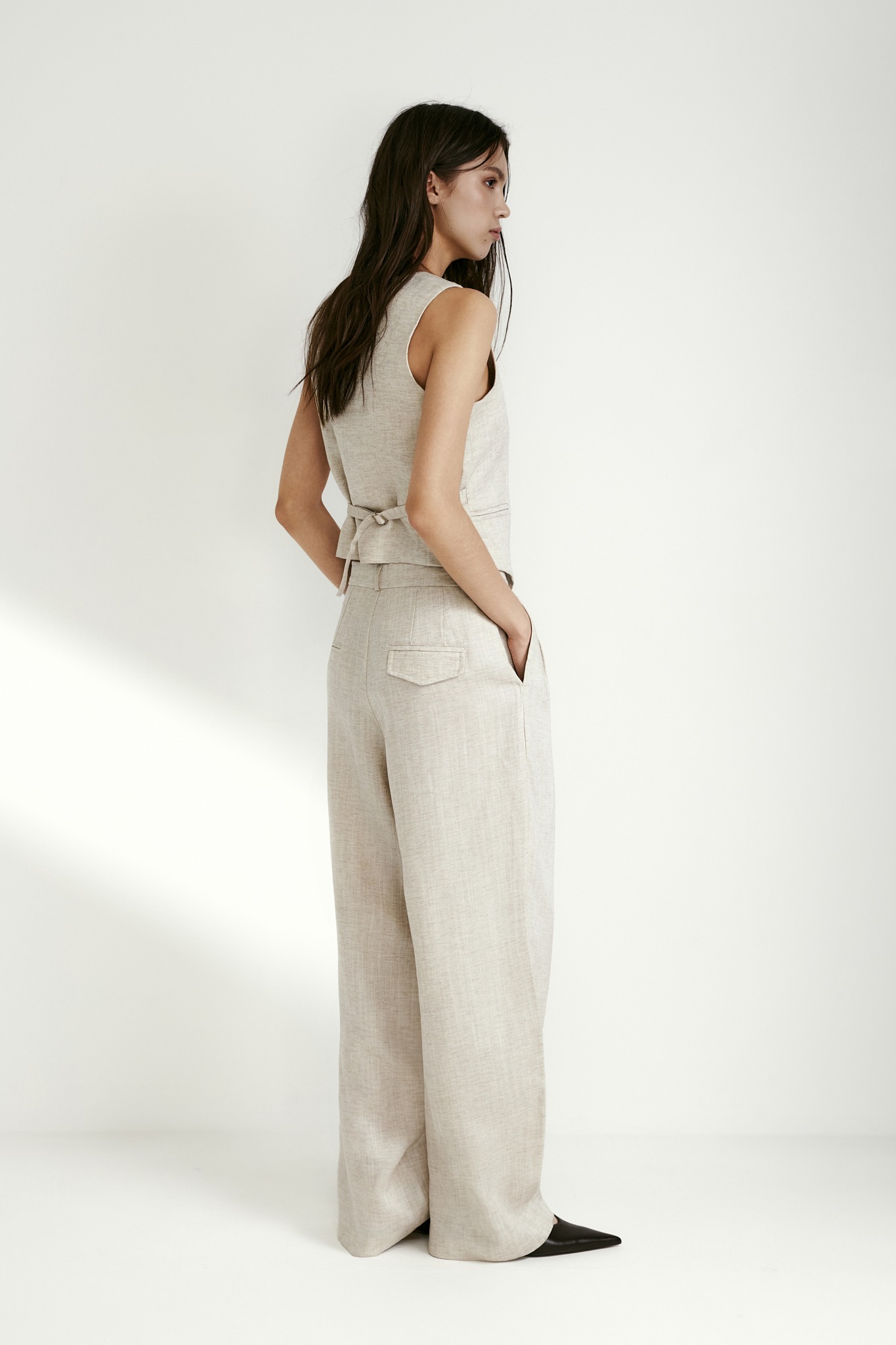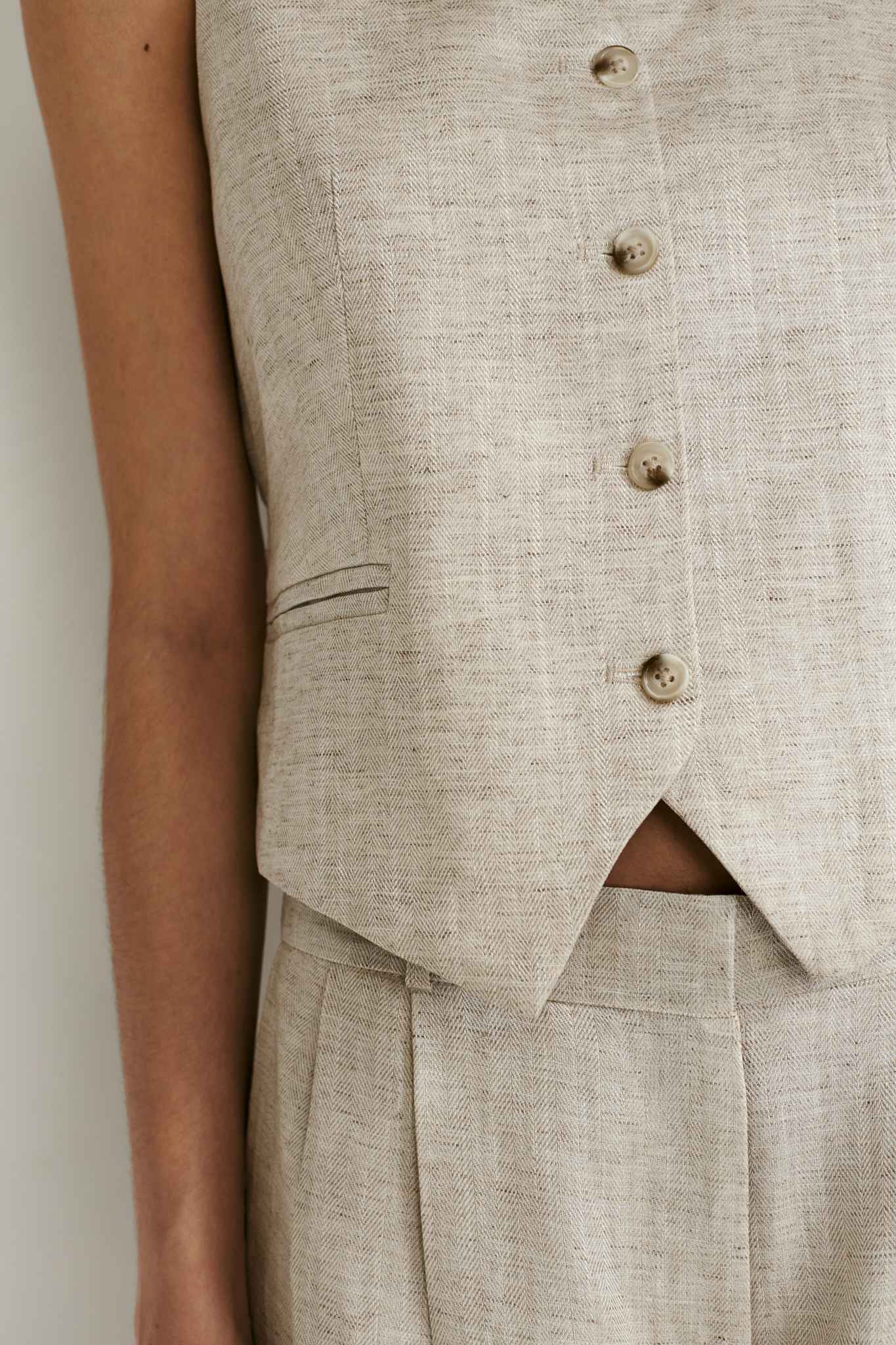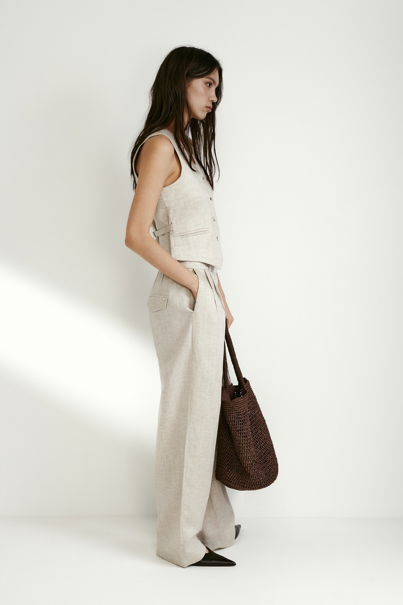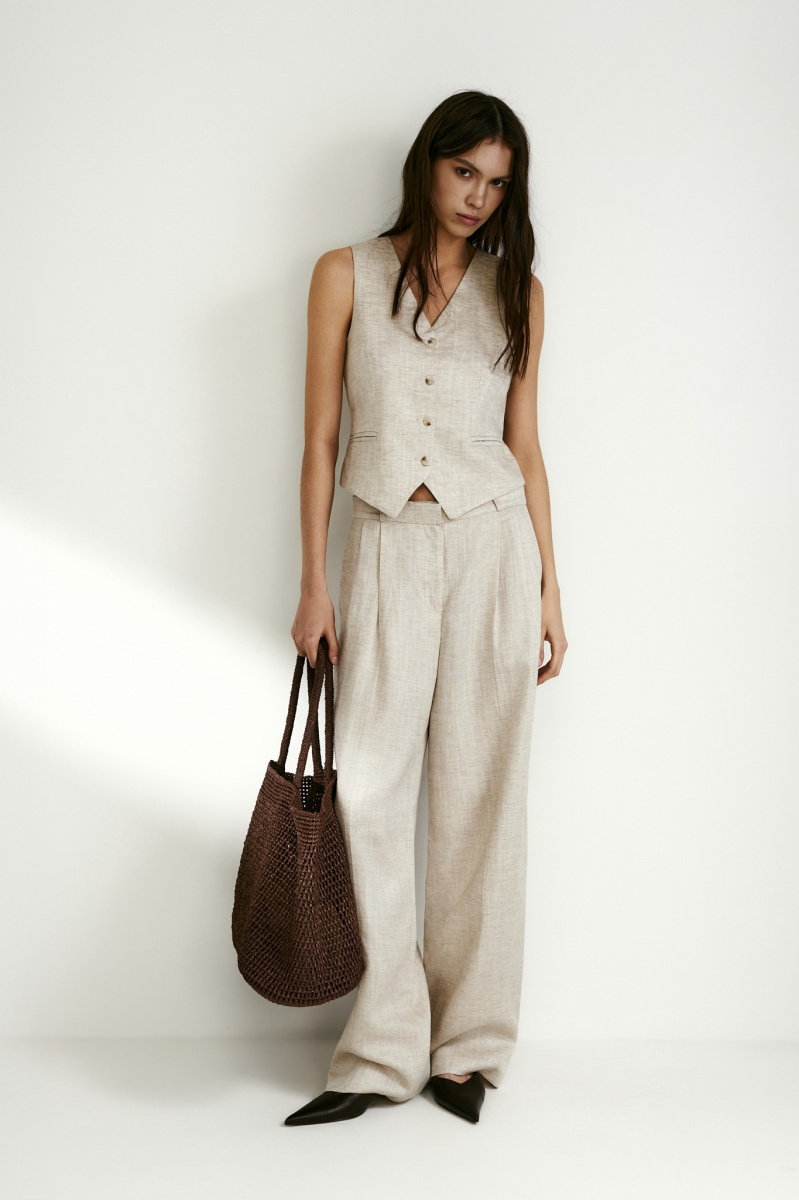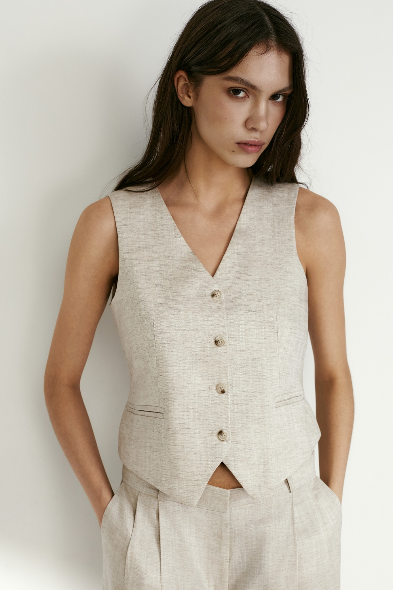 Название жилета Priroda отсылает к натуральному цвету льна — ставшему культовым в коллекции ROSI оттенку экрю, иными словами, мягкому серо-бежевому тону.