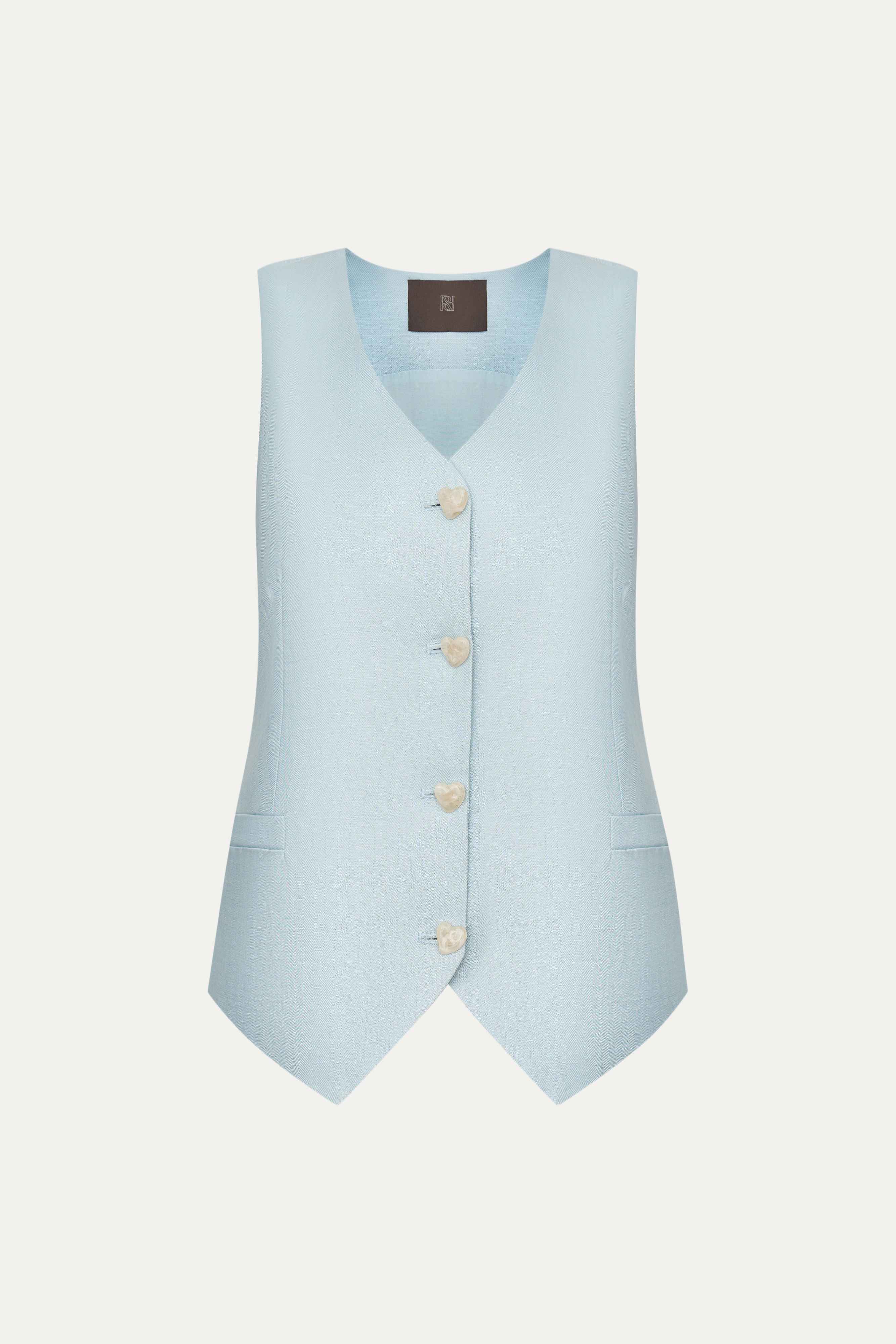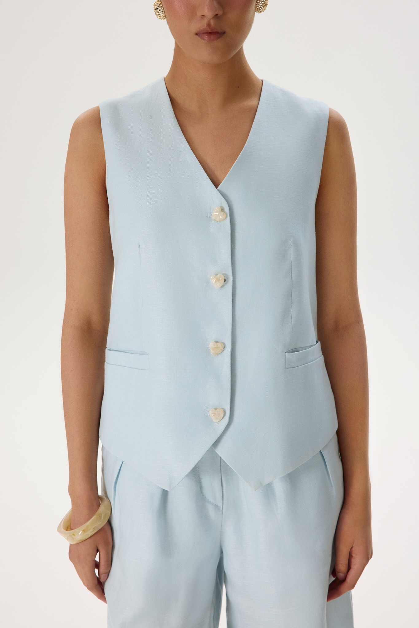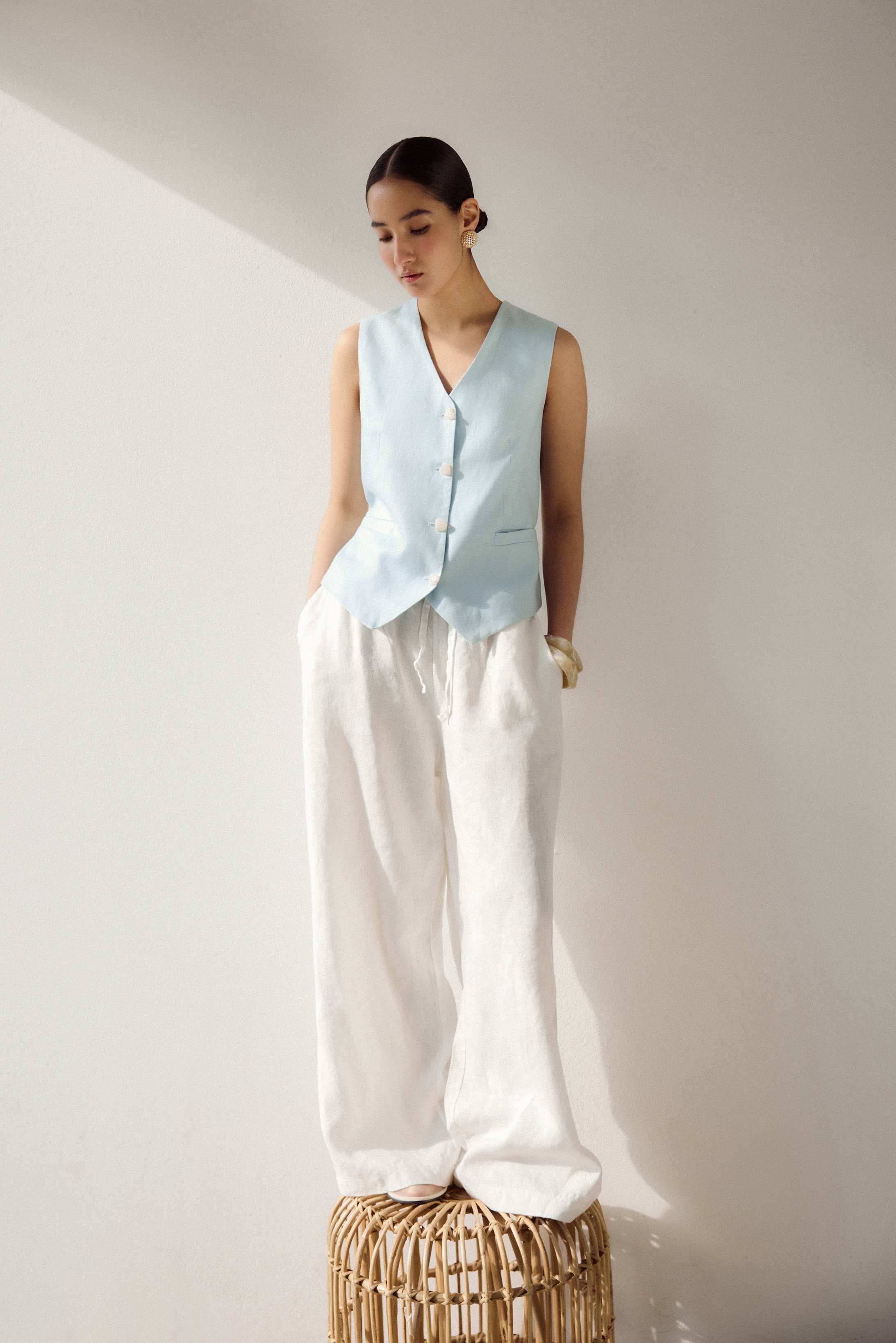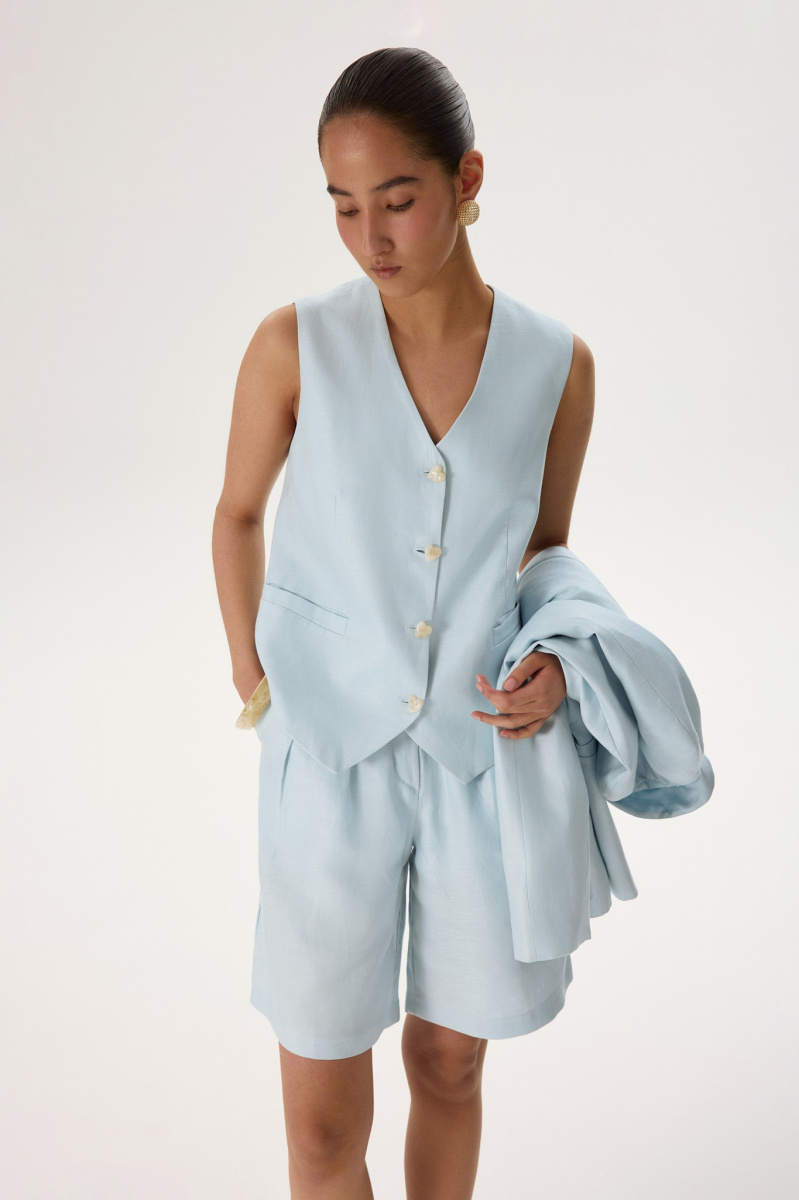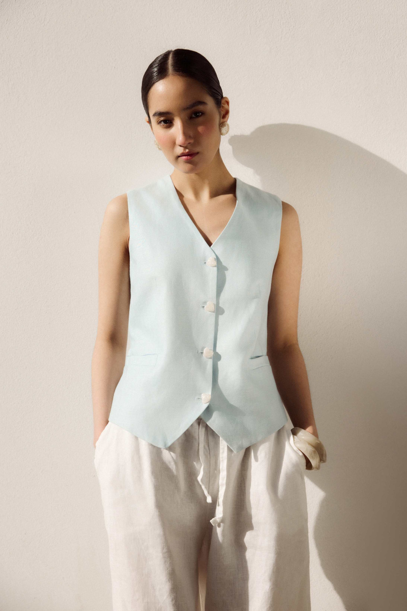 Названия изделий в коллекции «Лен. Создано в России» вызывают теплые ассоциации с летом из детства. Жилет Rosa напоминает о каплях летней утренней росы, в которых отражается безоблачное голубое небо.