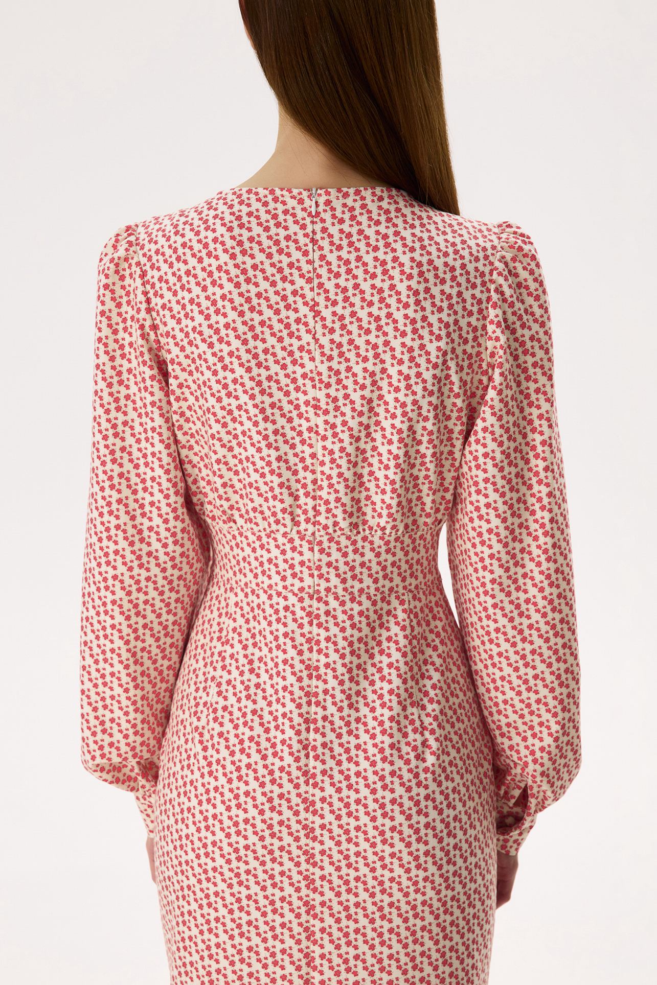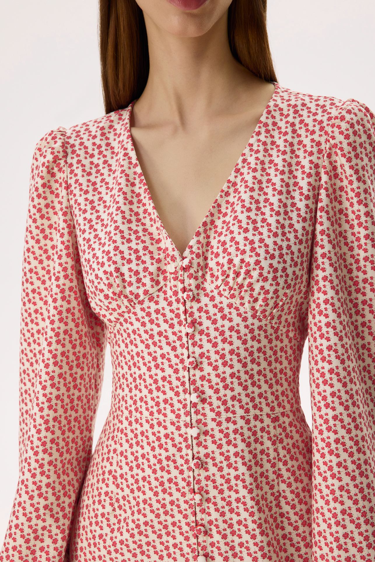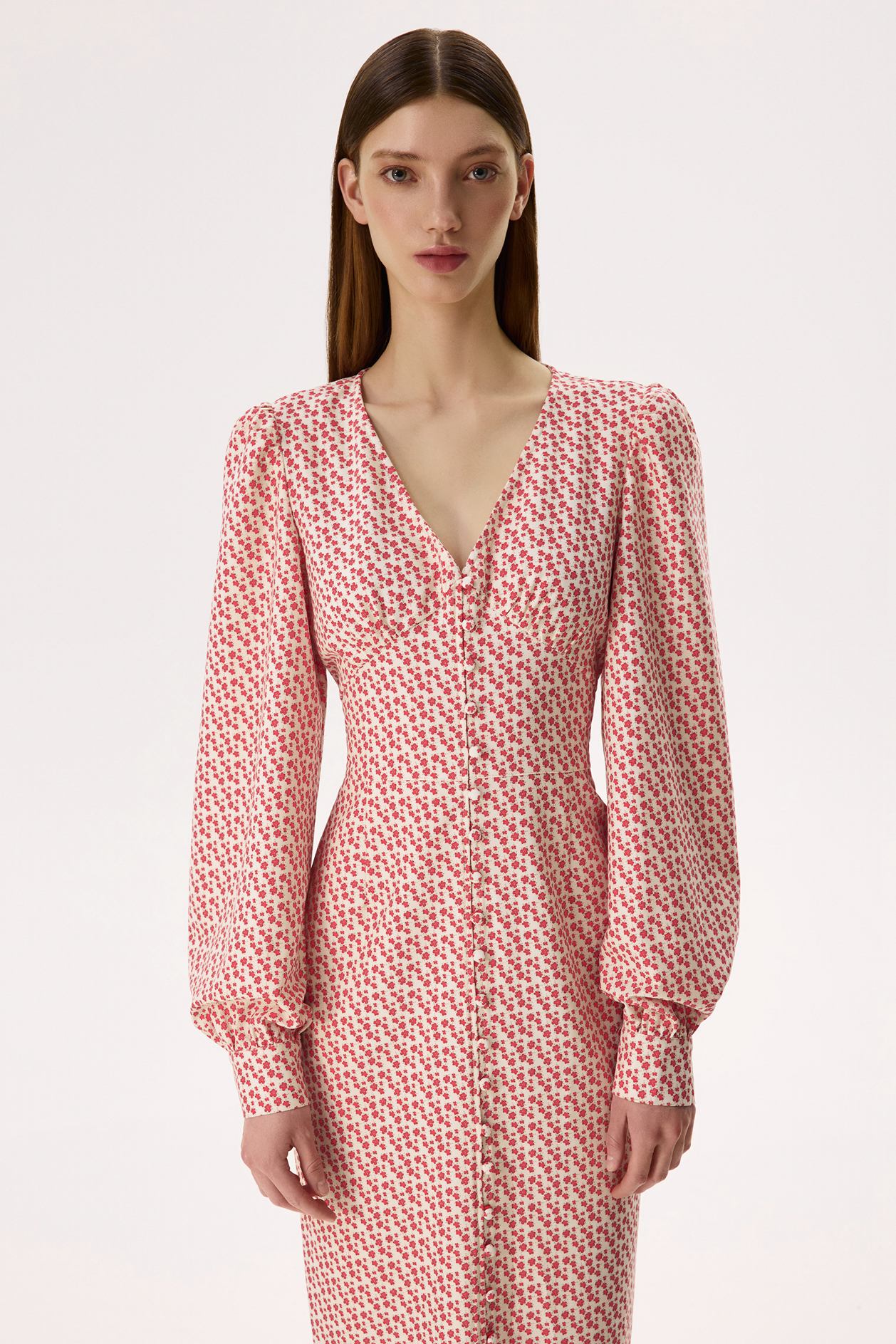 Объемные рукава, V-образный крой, застежка на обтяжные пуговицы — такое платье подойдет как для повседневных выходов, так и для особых случаев. Аккуратный принт в виде полевых цветов навевает романтичное настроение, а небольшая сборка под грудью и акцент на талии подчеркивают силуэт.