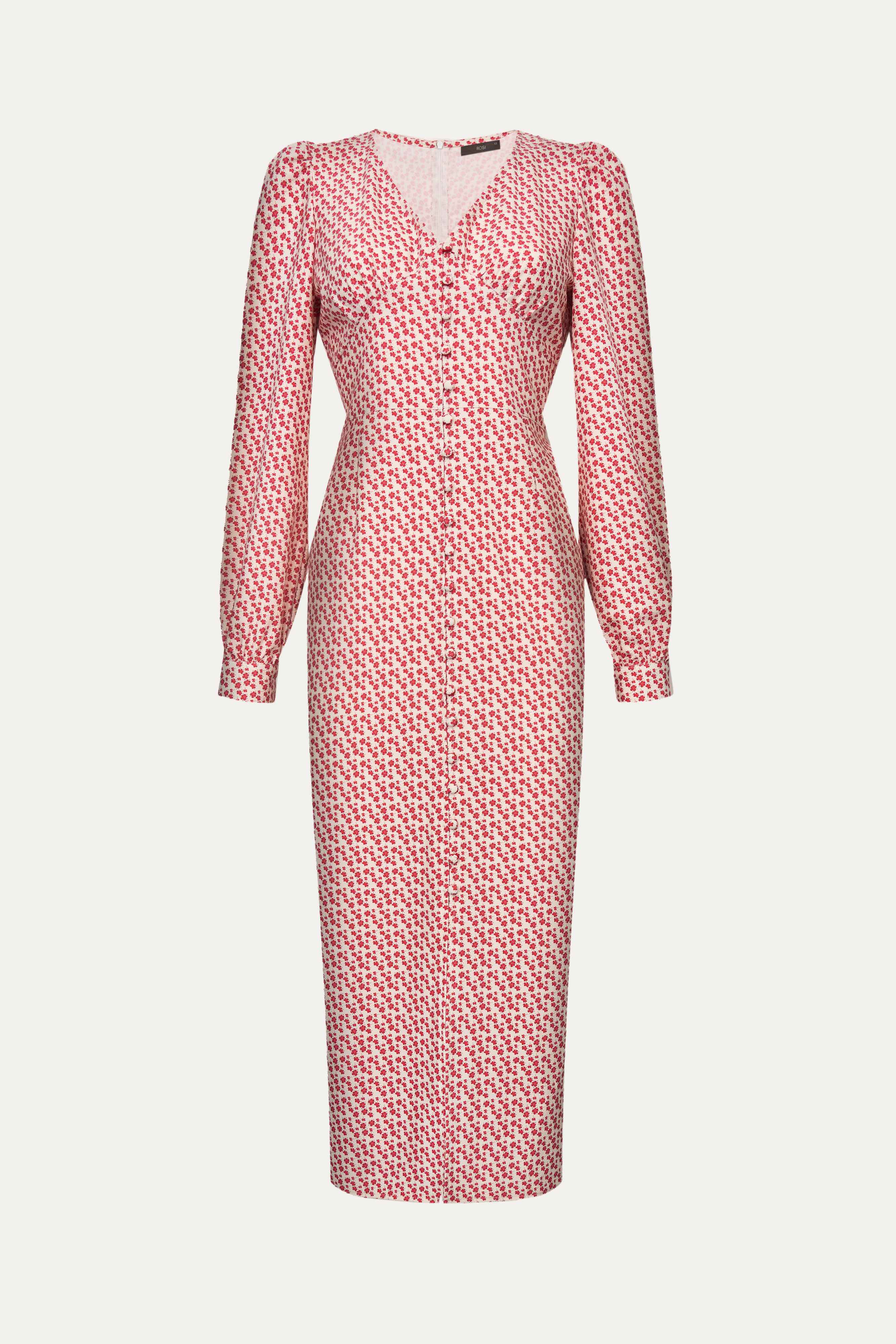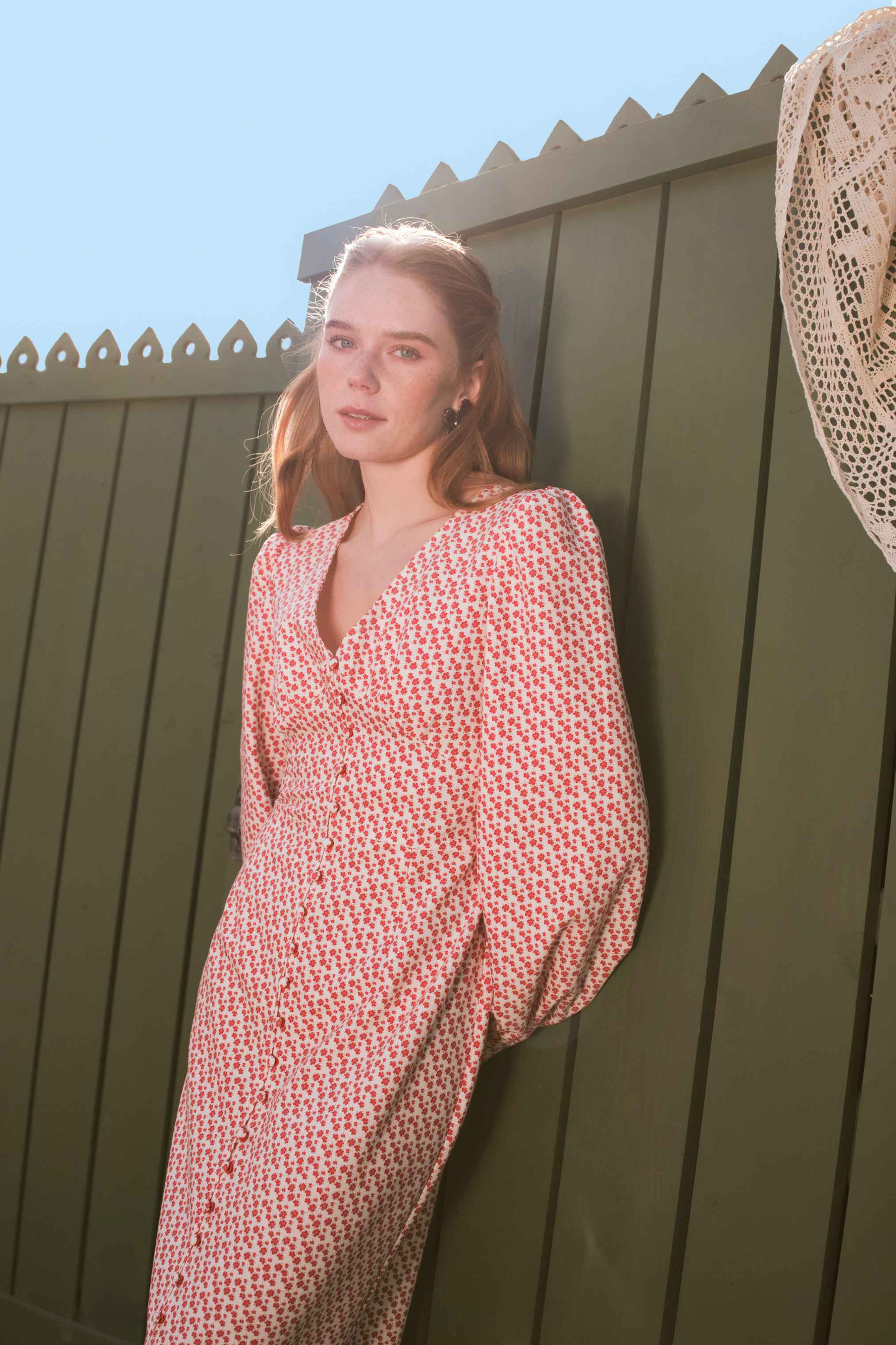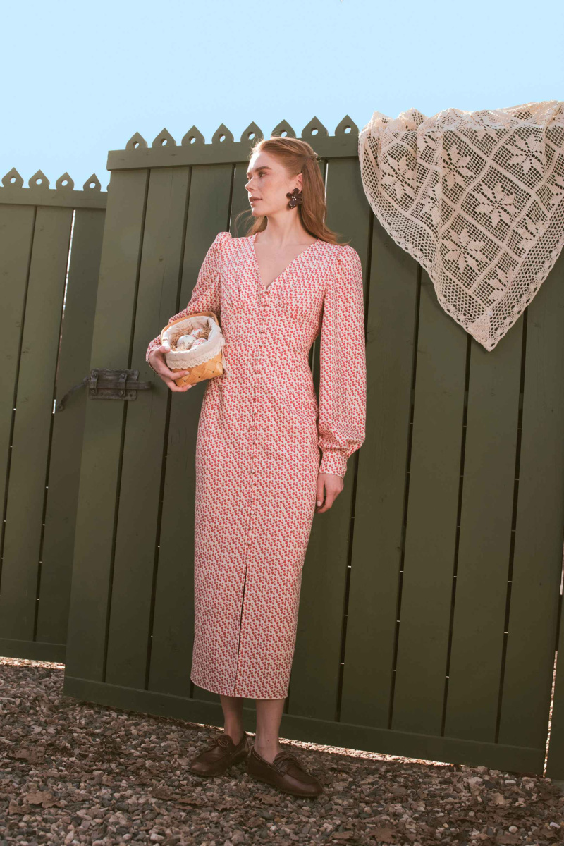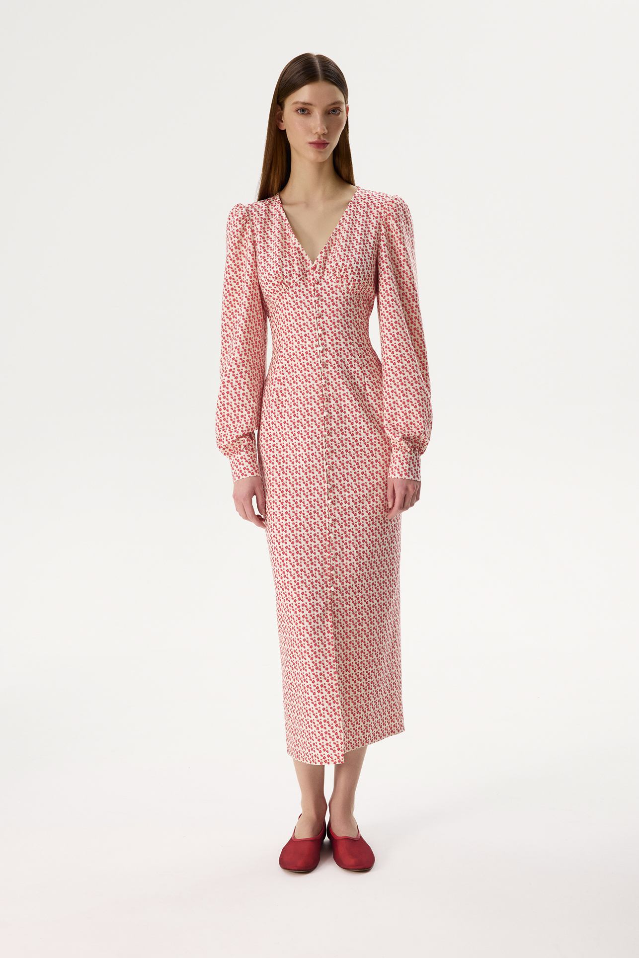Объемные рукава, V-образный крой, застежка на обтяжные пуговицы — такое платье подойдет как для повседневных выходов, так и для особых случаев. Аккуратный принт в виде полевых цветов навевает романтичное настроение, а небольшая сборка под грудью и акцент на талии подчеркивают силуэт.
