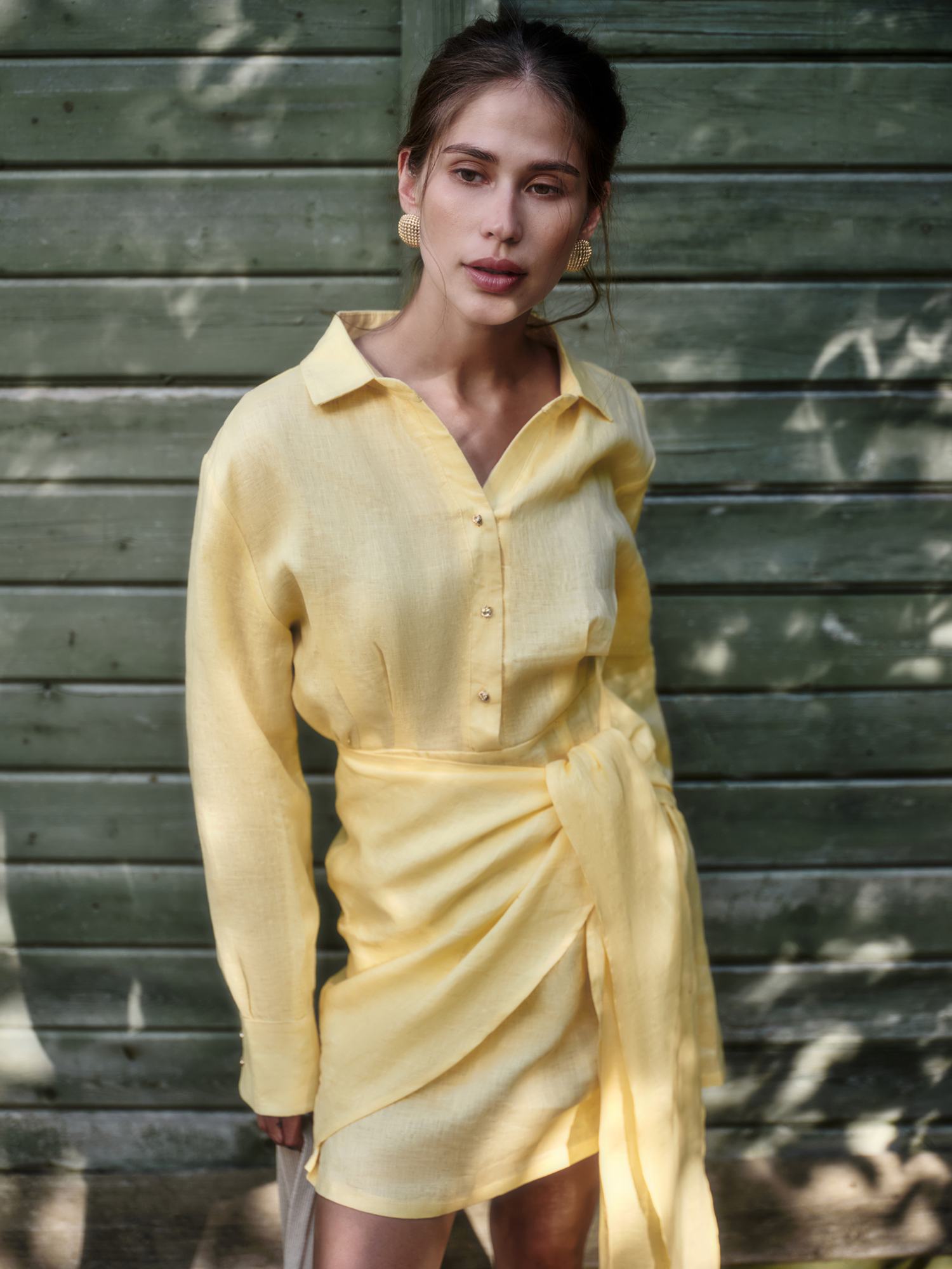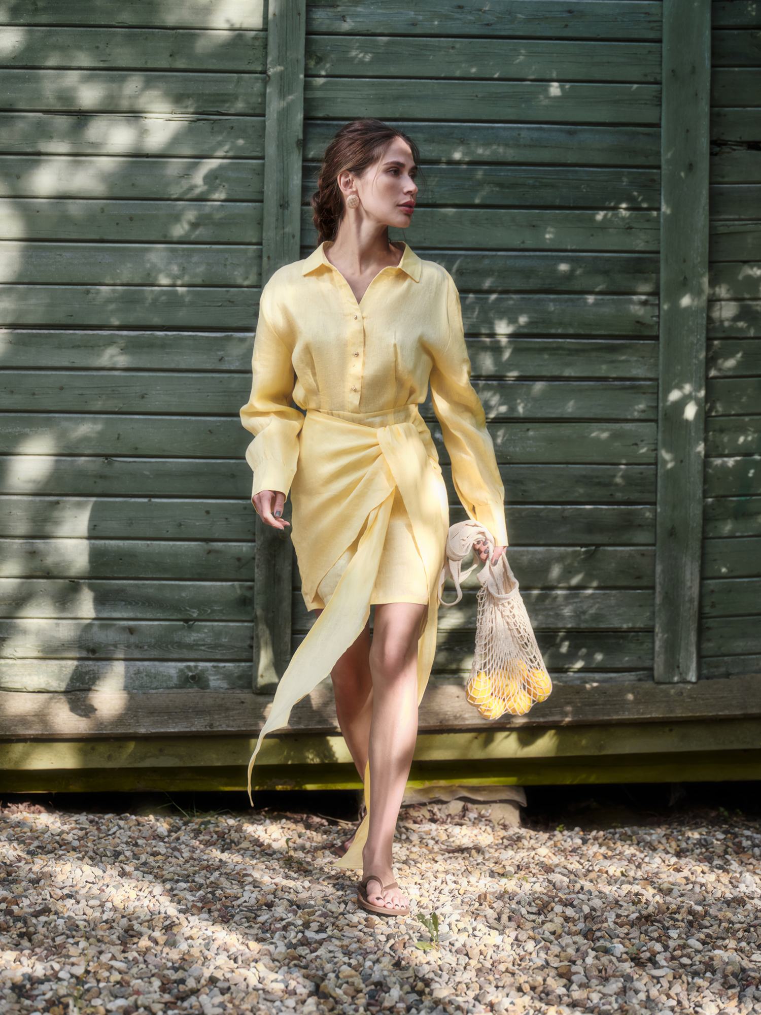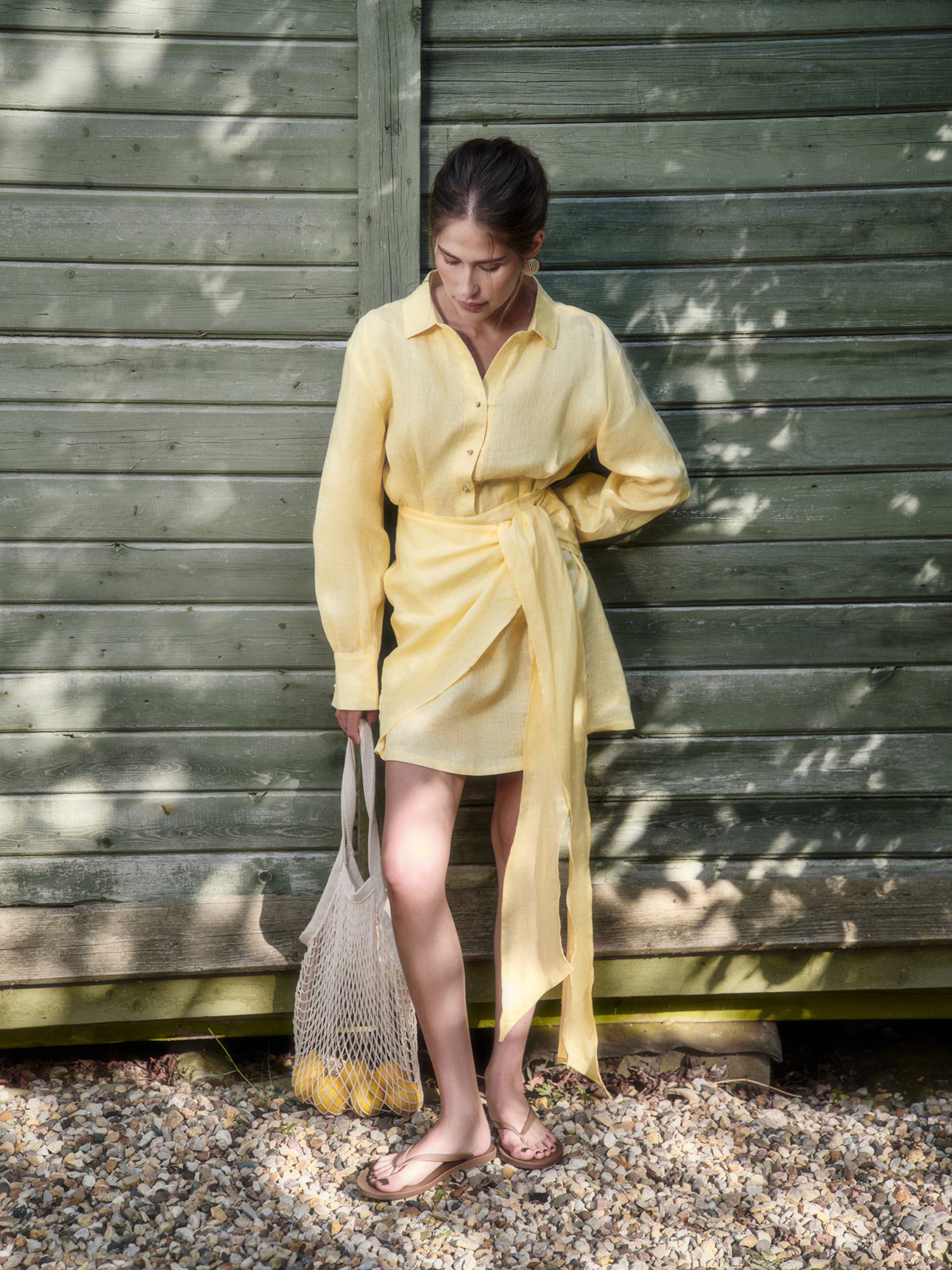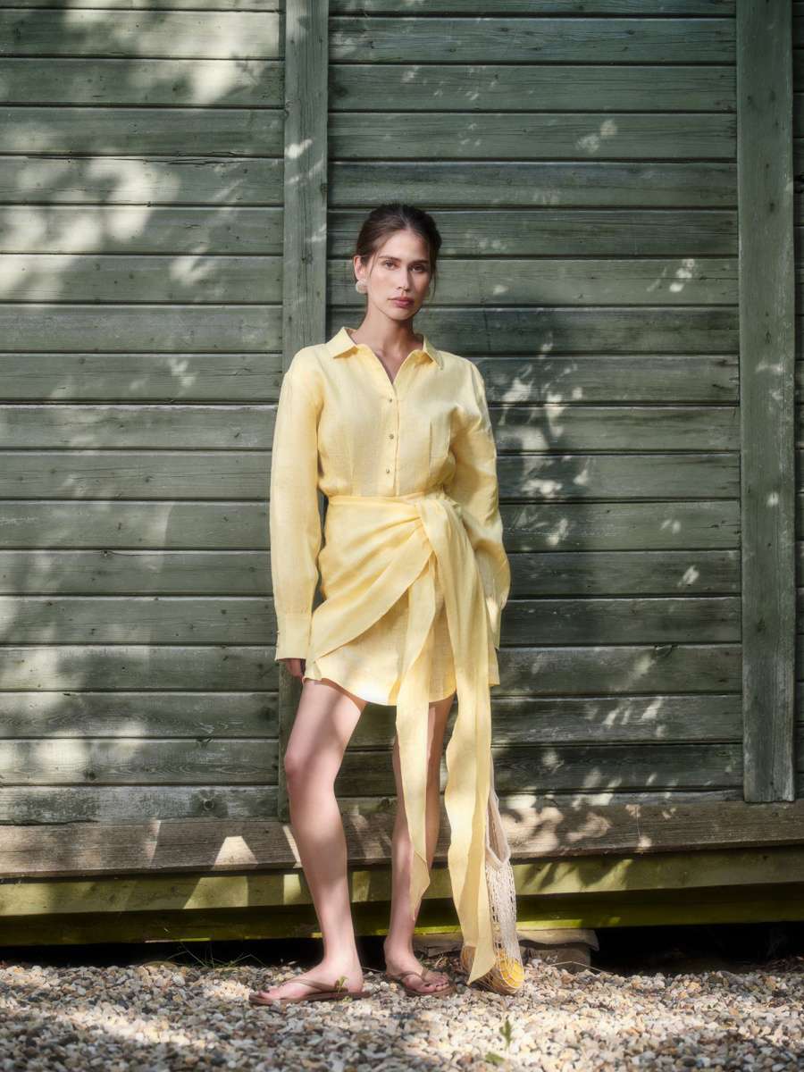 Новая интерпретация знакомого каждой платья-рубашки. Оно подойдет для встреч на веранде и свиданий с городом, скрасит будни в офисе и выручит в особых случаях — приталенный крой с узлом на талии превращает базовую модель в акцентную, а спущенное плечо и удлиненные манжеты создают хрупкий и утонченный силуэт. Выполнено изо льна, прохладного на ощупь и полного воздуха, в двух актуальных оттенках — лимонный сорбет и клубника со сливками.