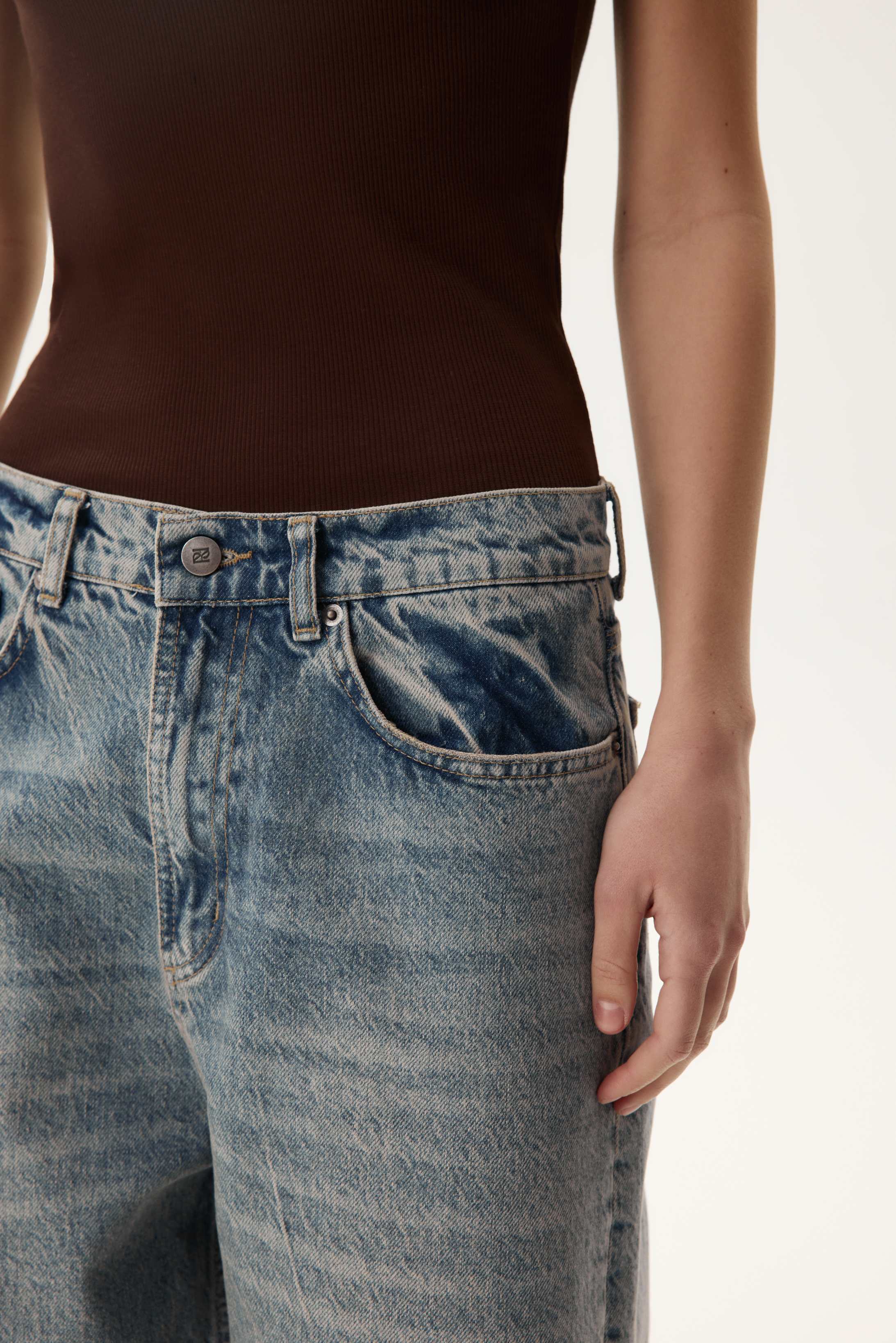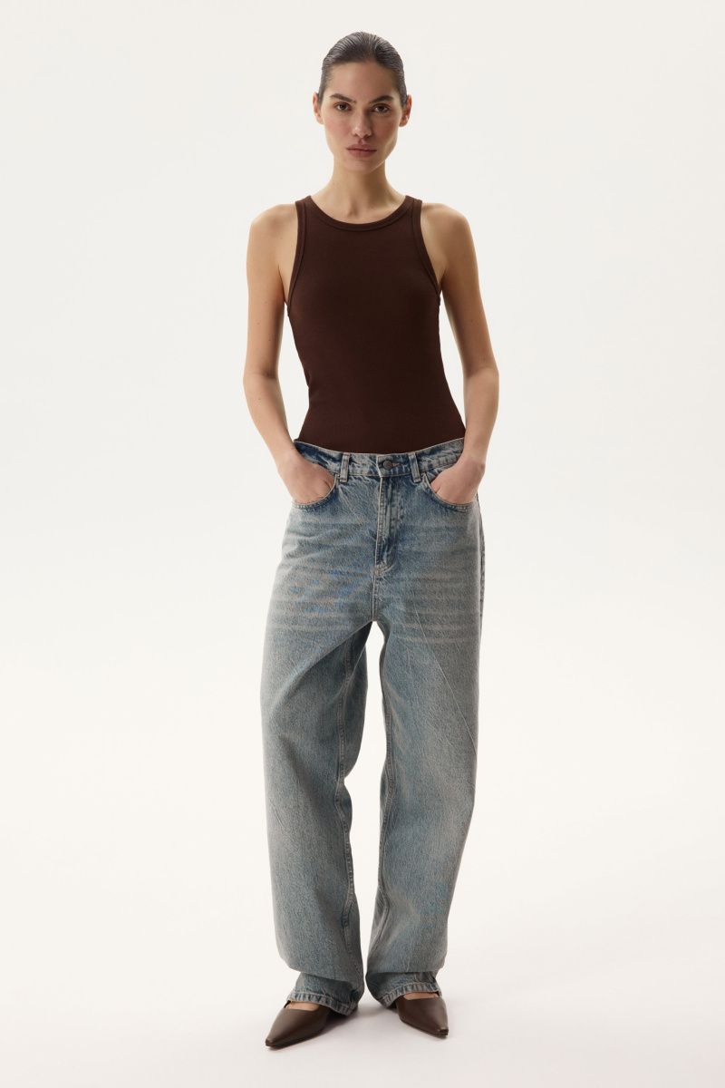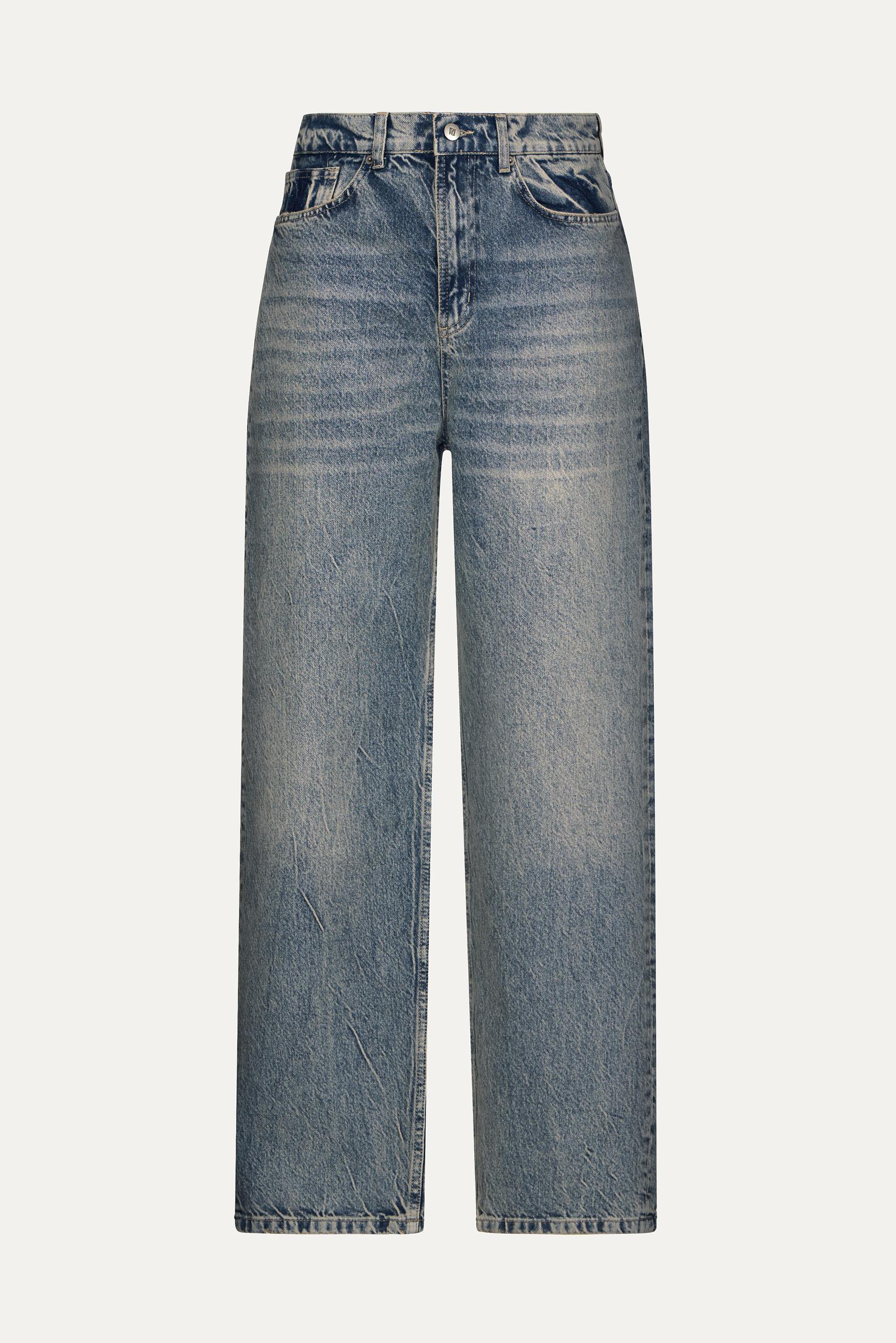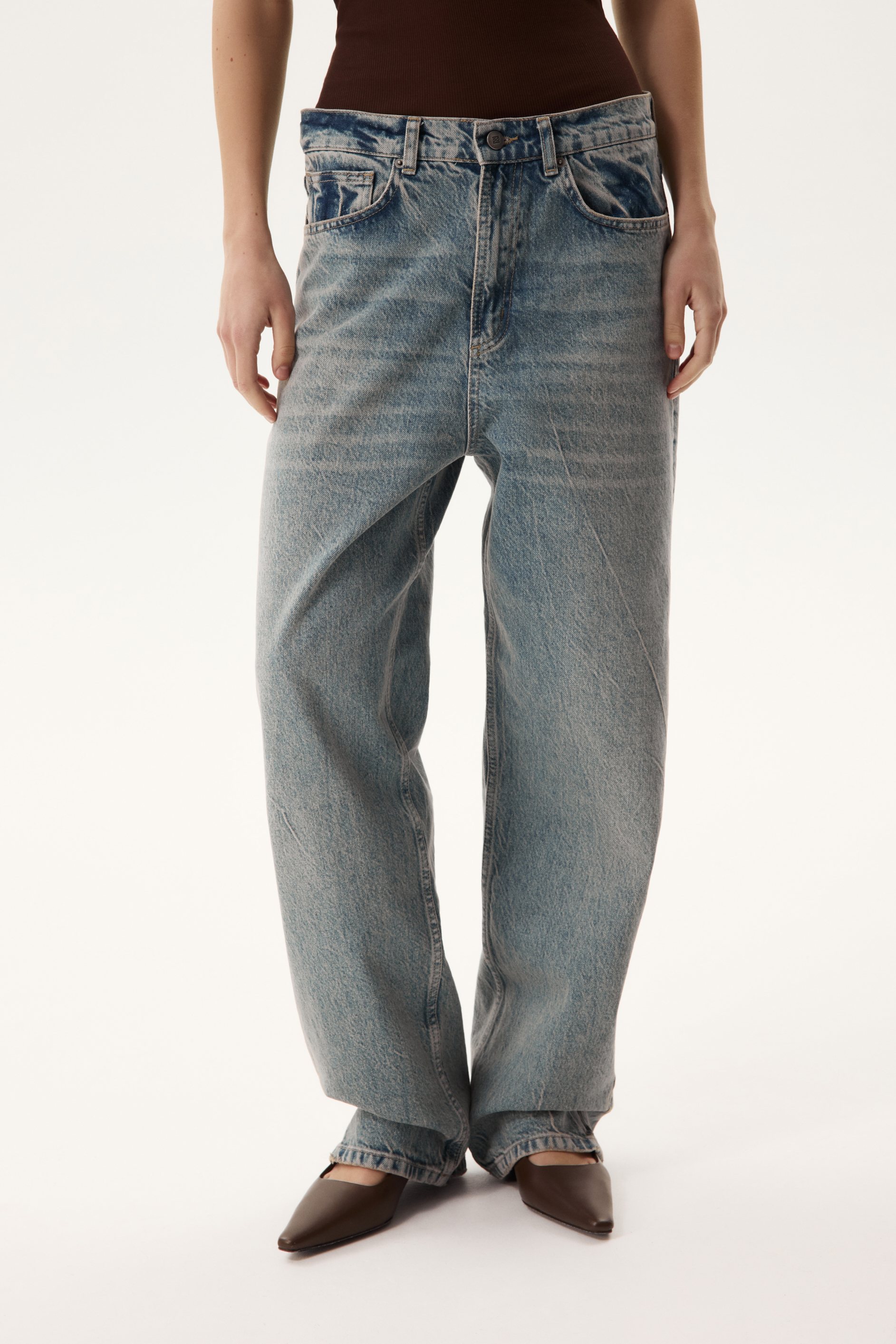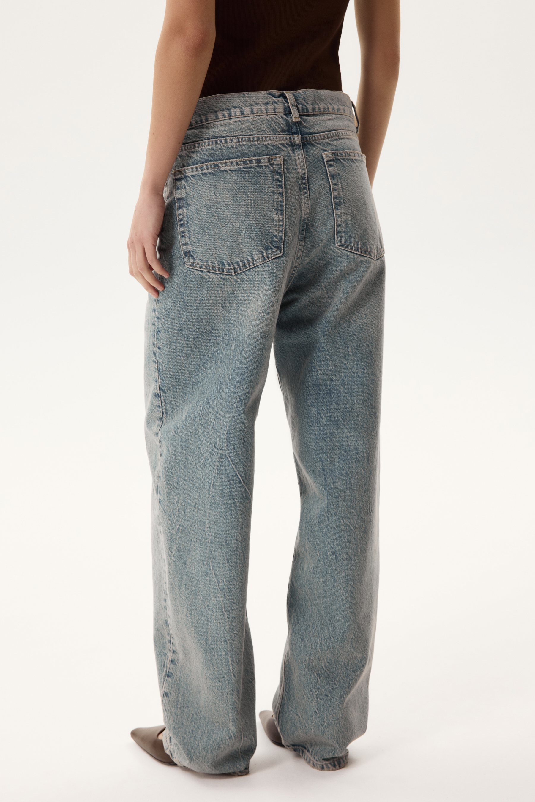 Эта пара вобрала в себя все, за что мы так любим силуэт Boyfriend: комфортную низкую посадку, свободный крой, полную длину. Главной изюминкой пары стал легкий эффект делаве — винтажная варка и потертости.