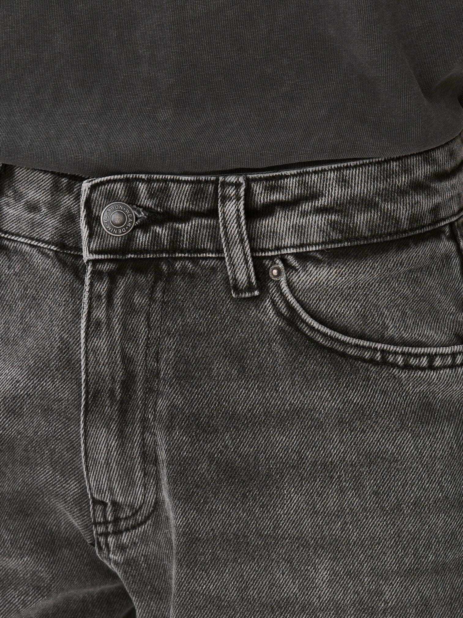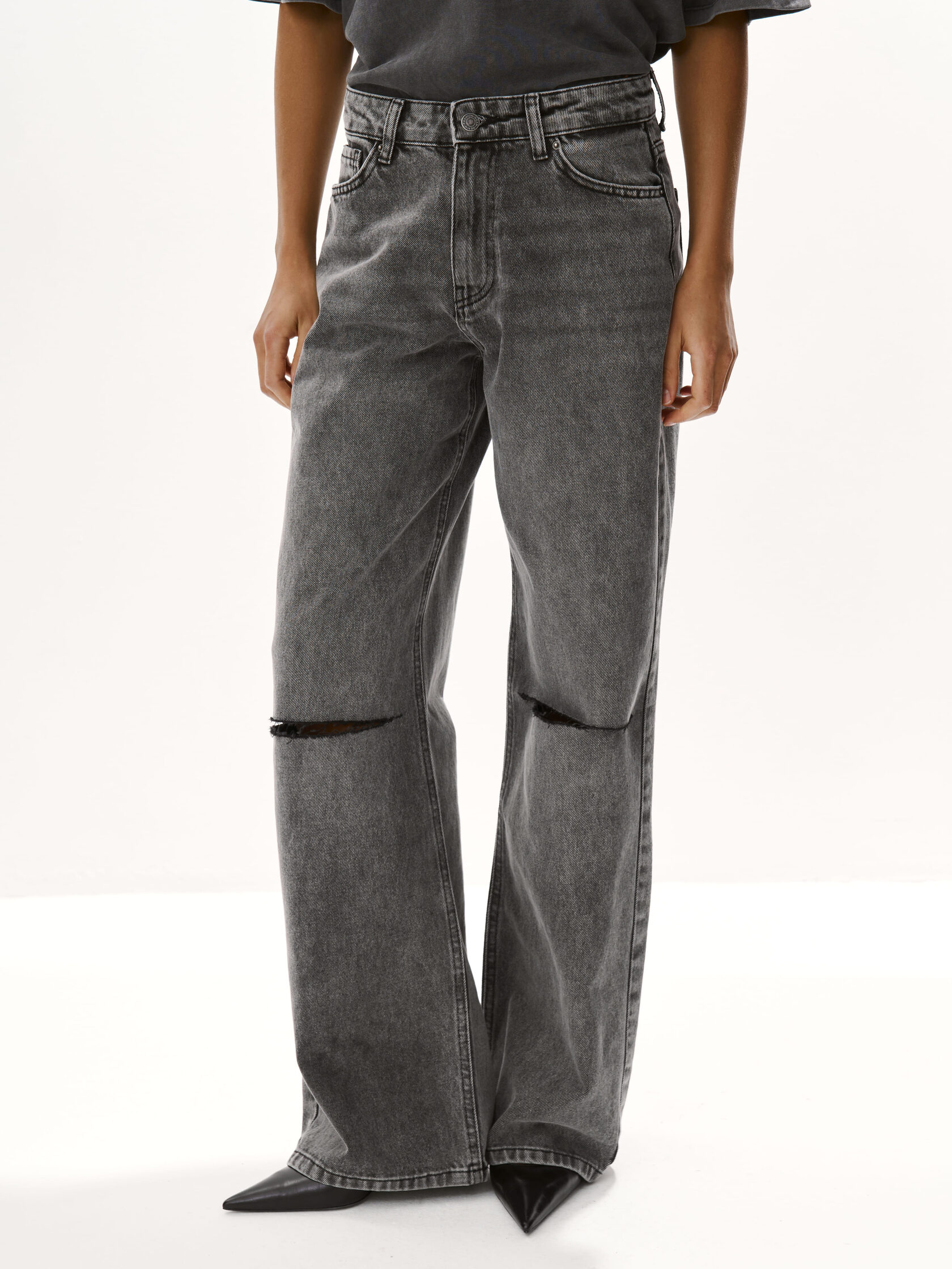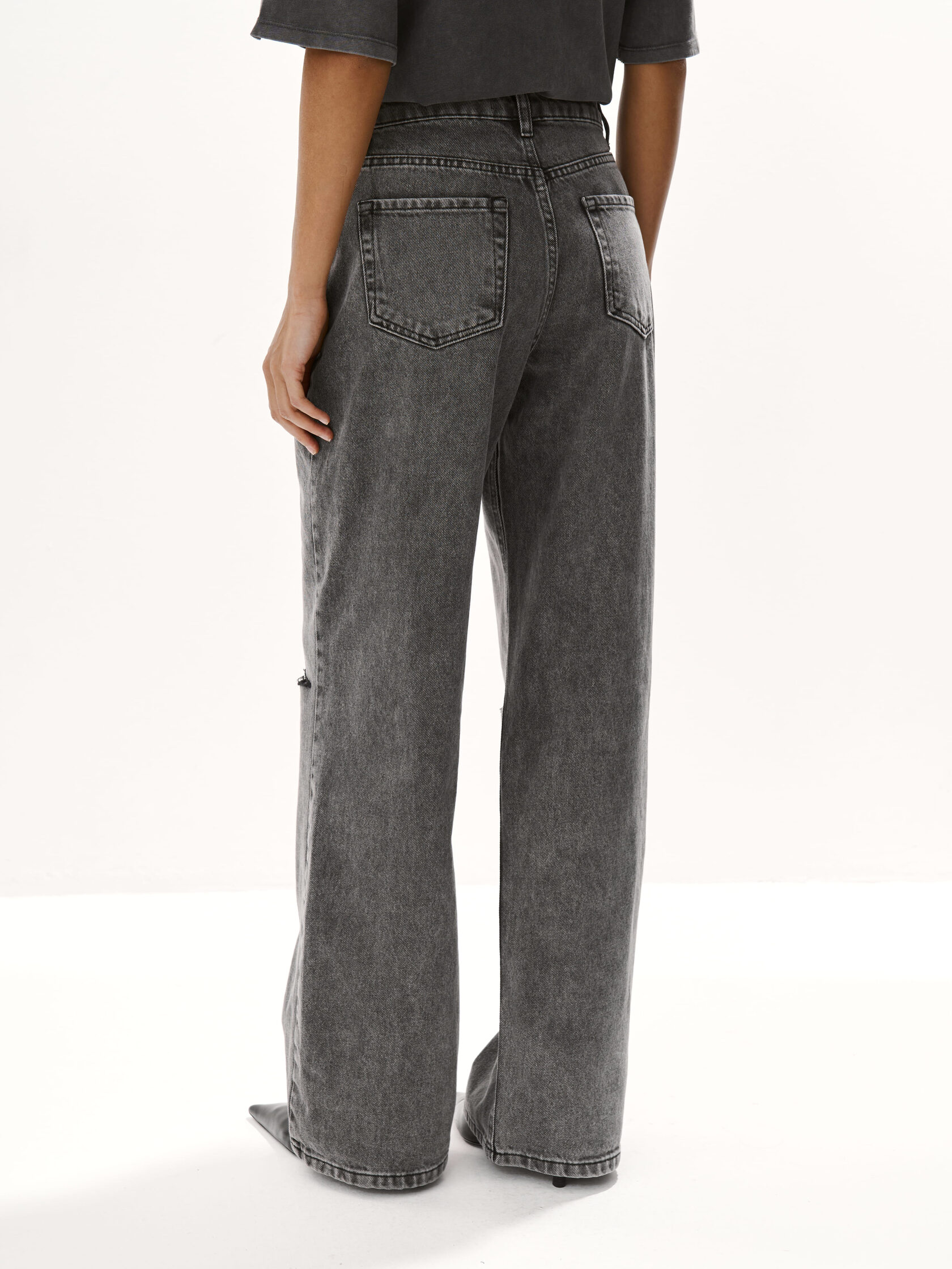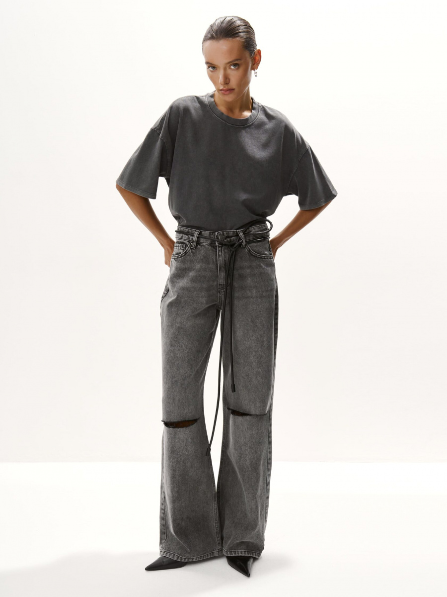 Наш бестселлер – прямые широкие джинсы straight классического серого цвета. Посадка чуть ниже талии и аккуратные разрывы на коленях создают расслабленный образ, а потертости и эффекты варки подчеркивают аутентичность модели. Сшиты из плотного денима, застегиваются на молнию и пуговицу.