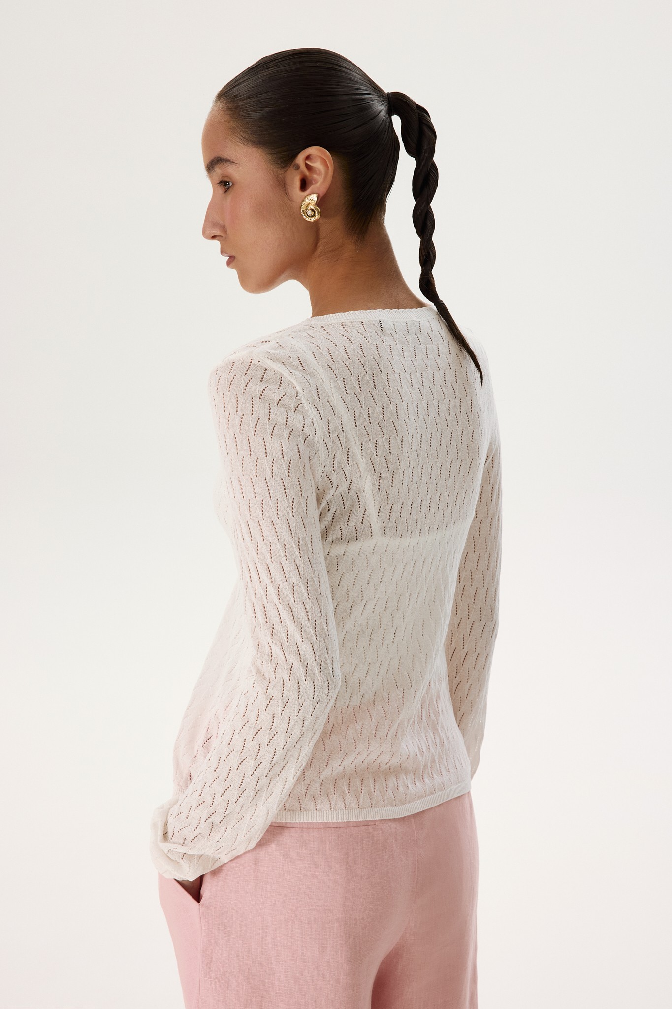 Объектом желания модель делает ажурный узор, выполненный с помощью перфорации, а также изящная окантовка в рубчик. Свободный крой с длинным рукавом и V-образным вырезом добавляют образу элегантной небрежности.