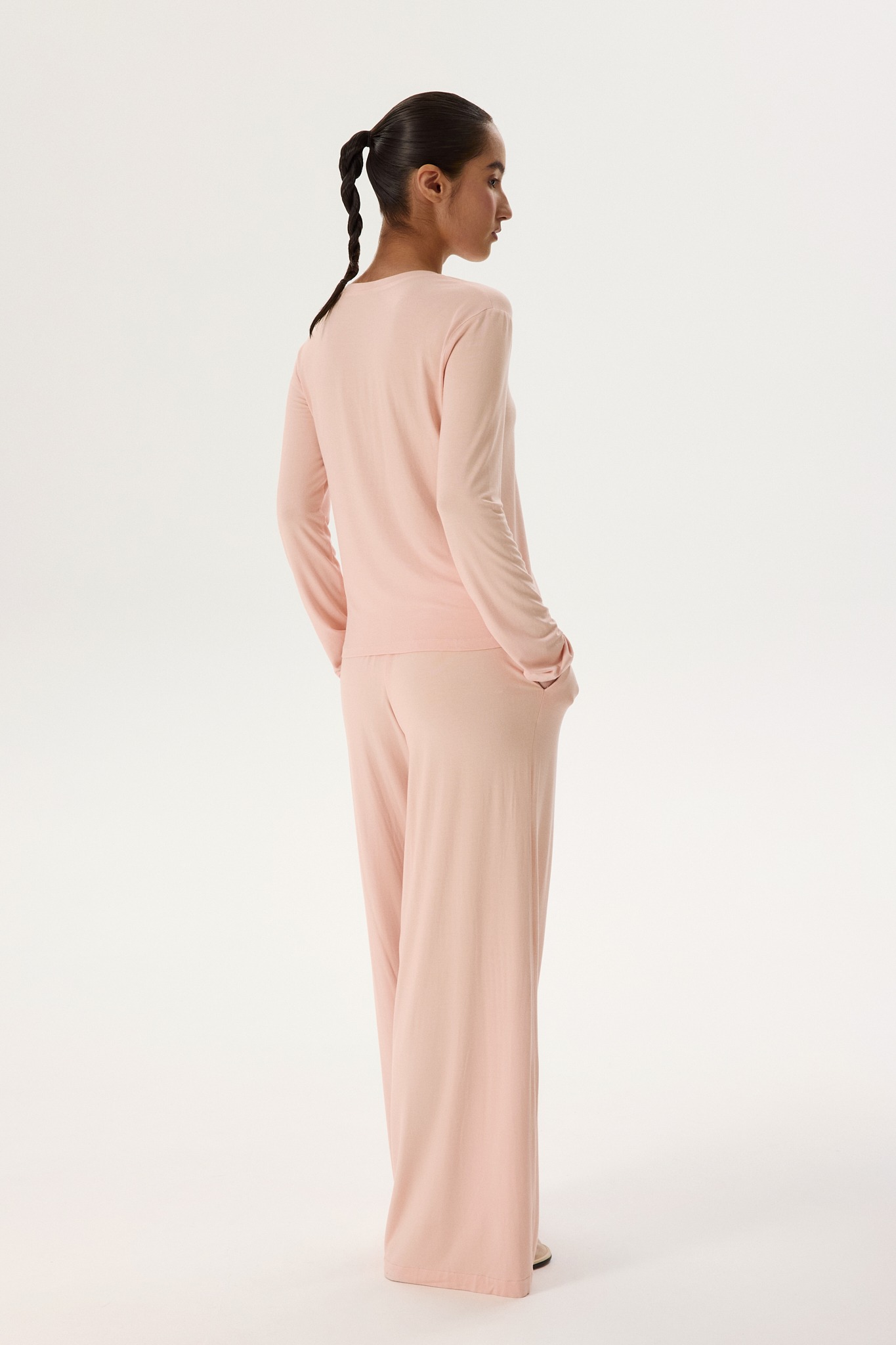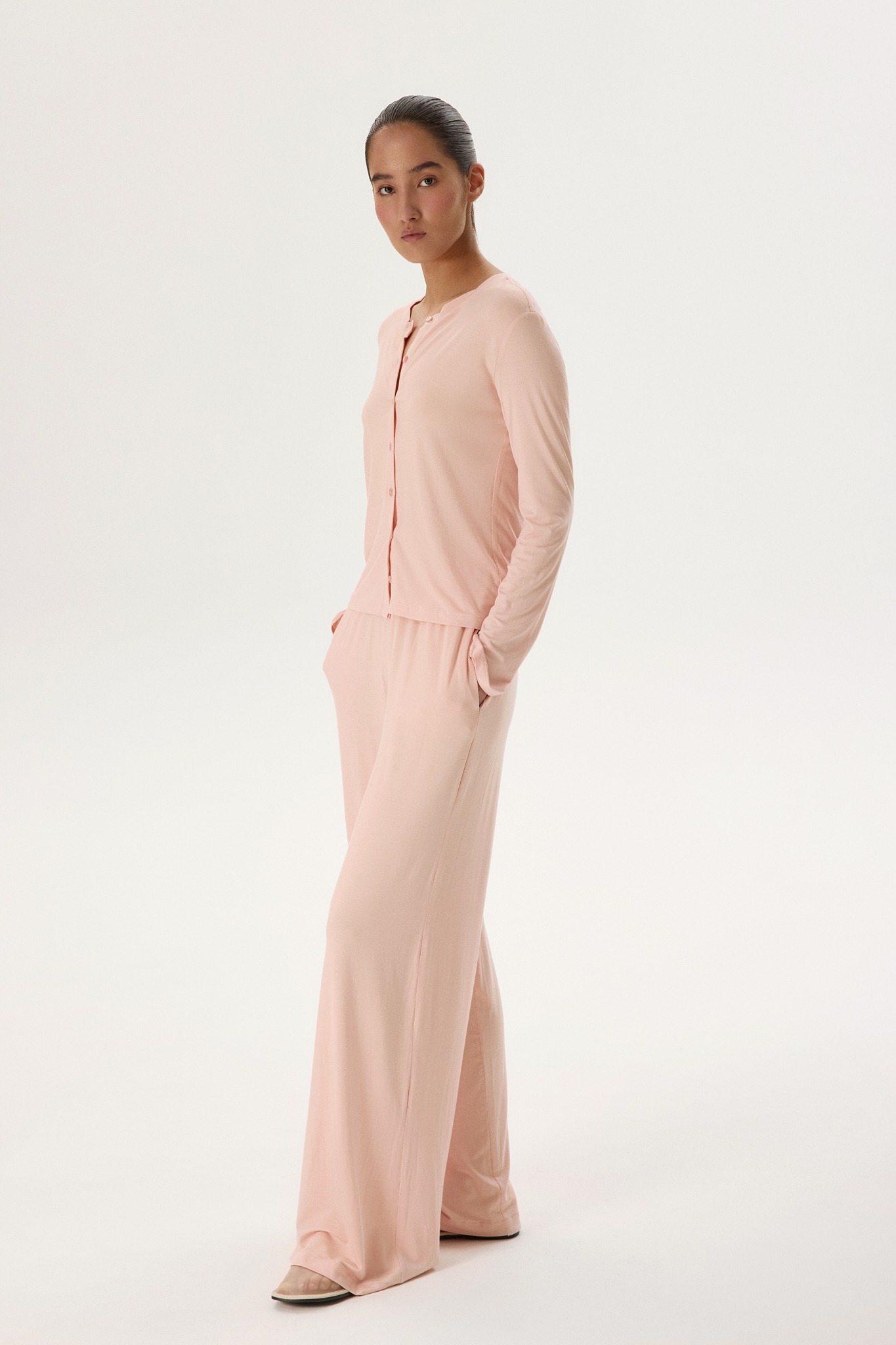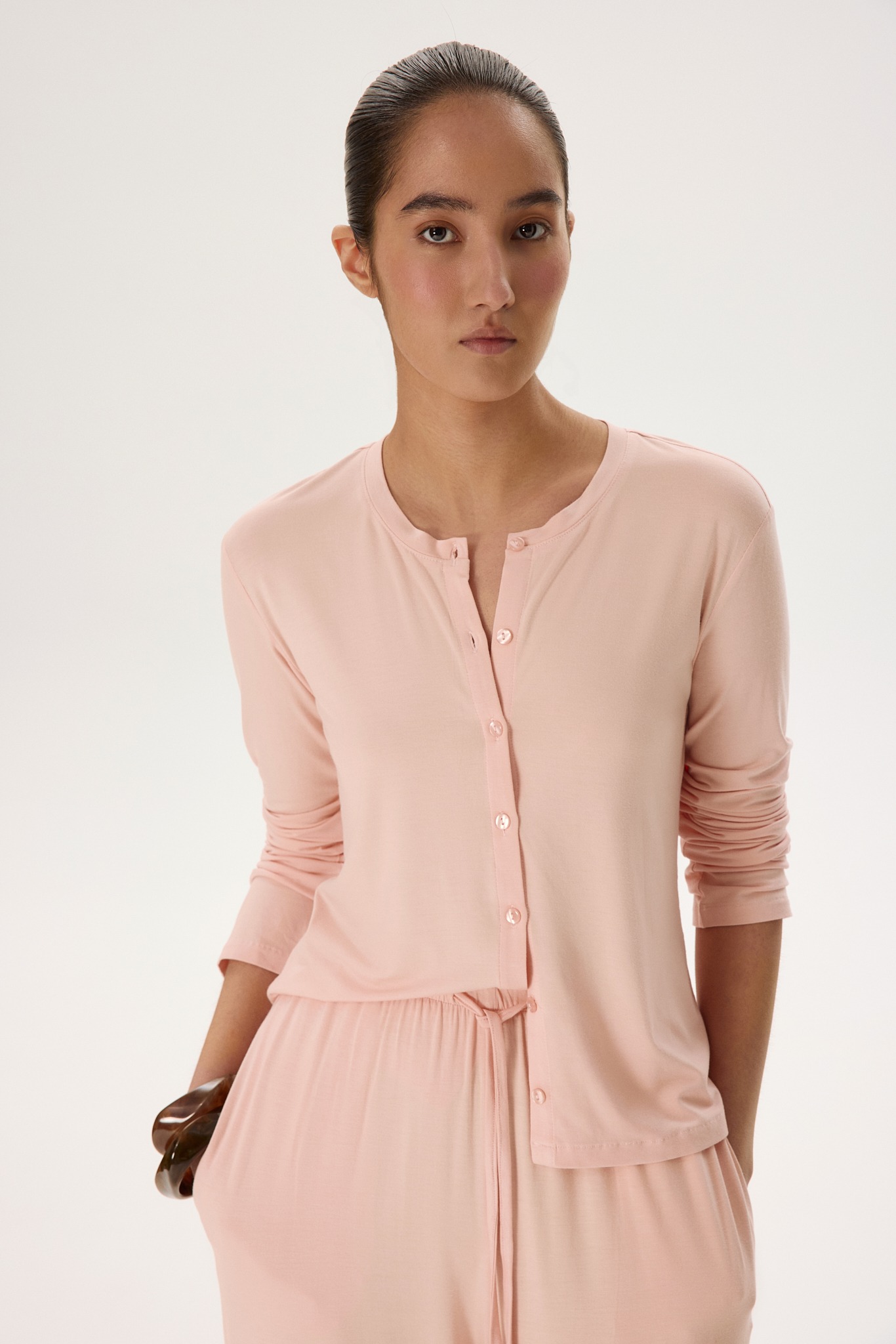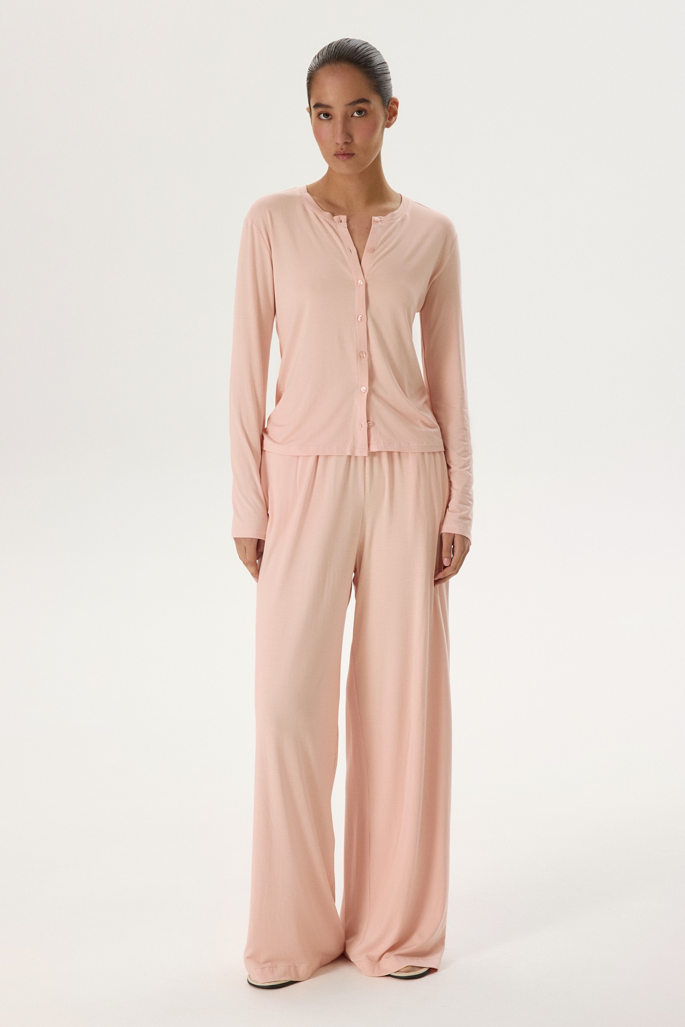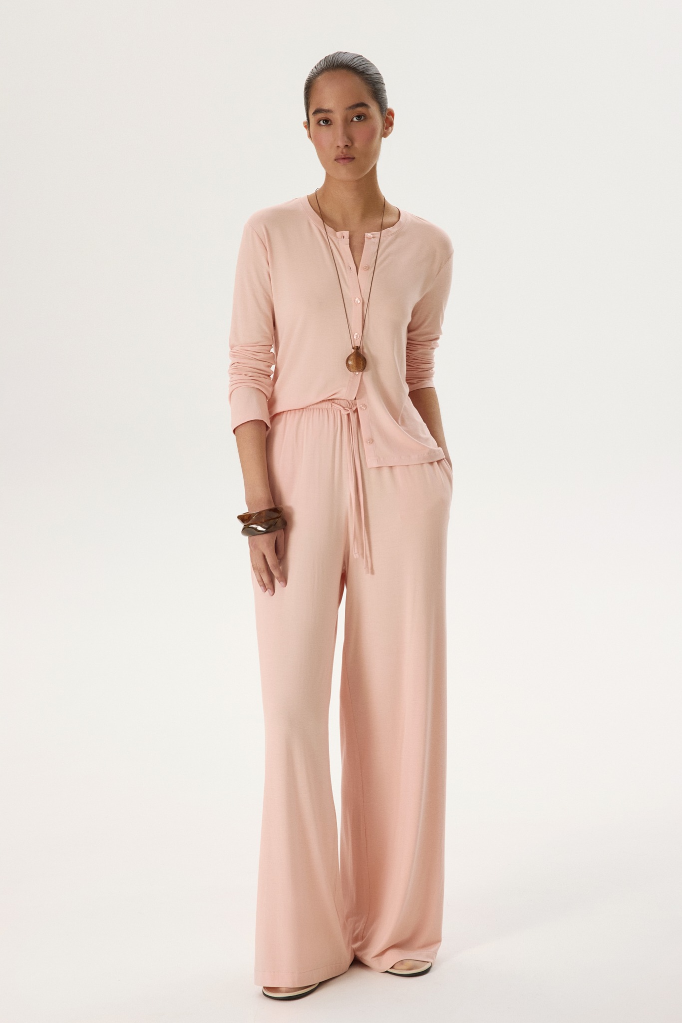 Изделие представлено в двух оттенках — нежно-розовом и mocha mousse. Рекомендуем носить один кардиган поверх другого и сочетать с брюками из нашей коллекции.