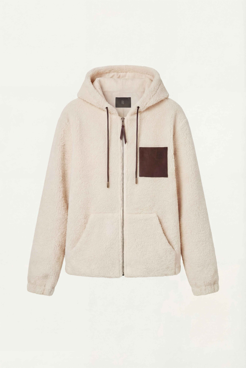 2. Натуральная замша на нагрудном кармане и шнурках капюшона контрастирует основному материалу, добавляя фактуры и цвета.