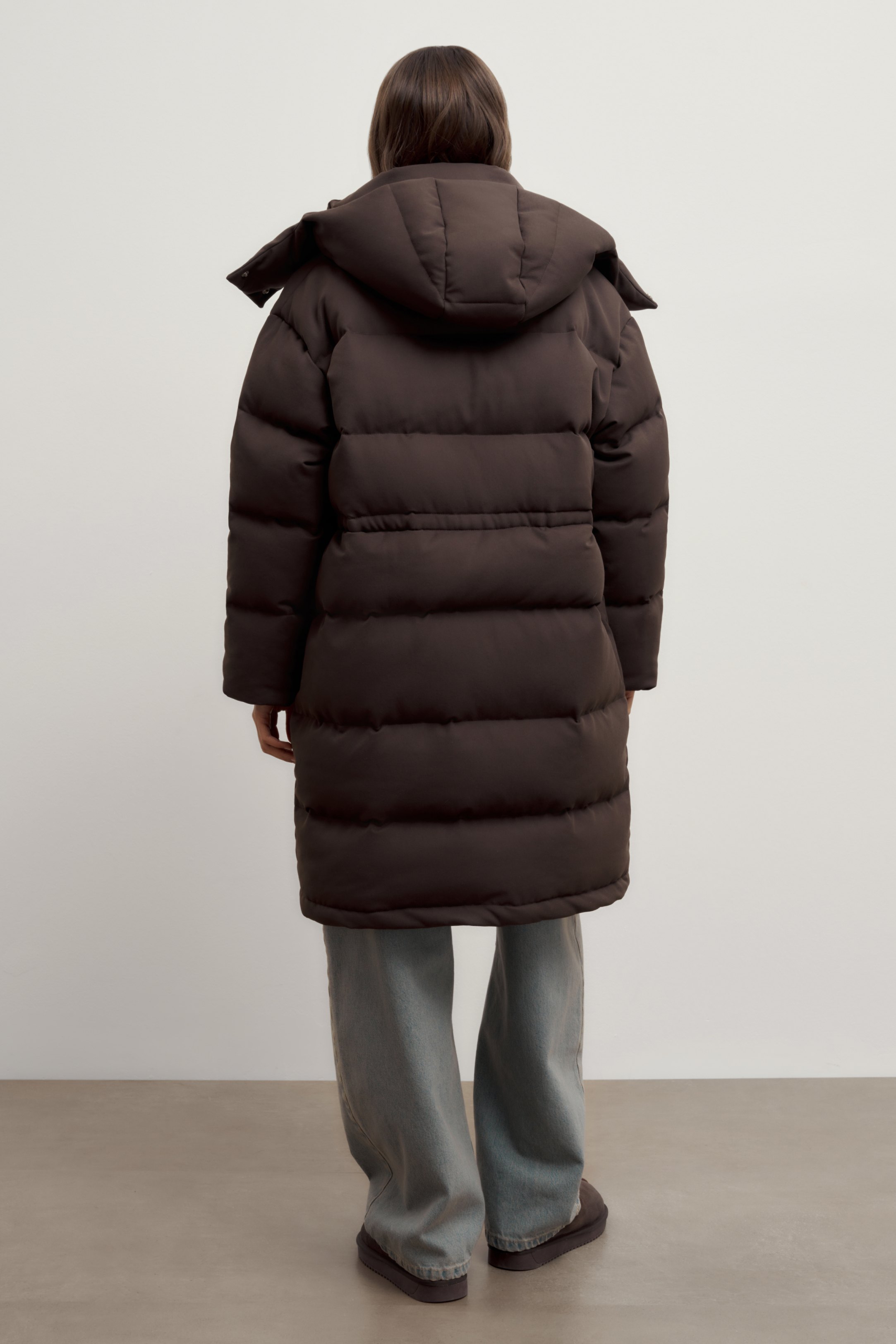Эта модель подойдет для морозов до -30°C: удлиненный крой пуховика согреет в зимнюю погоду, а капюшон и воротник-стойка на кнопках обеспечат дополнительную защиту от ветра.