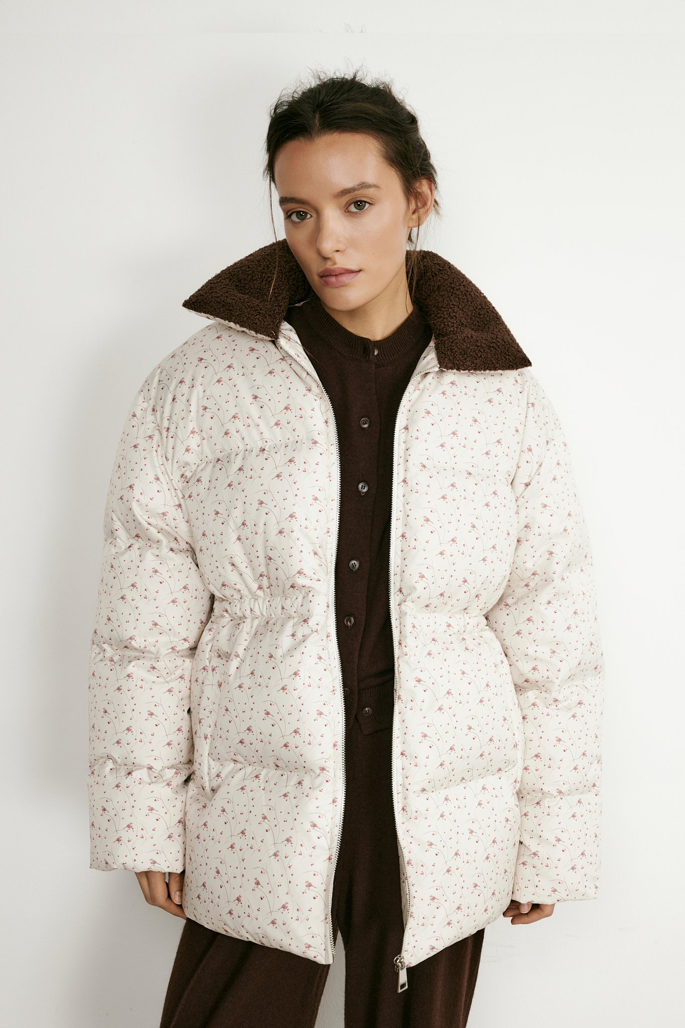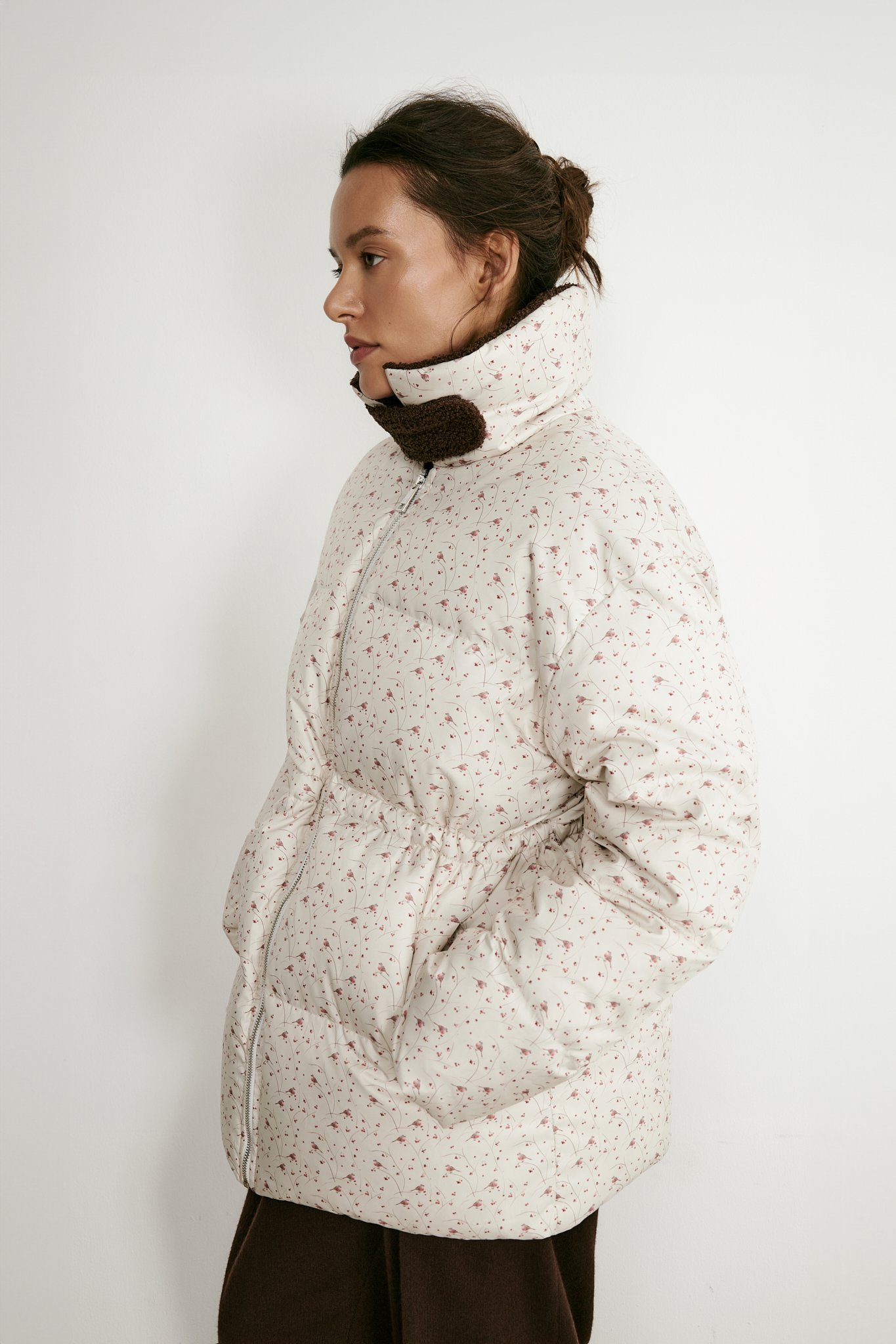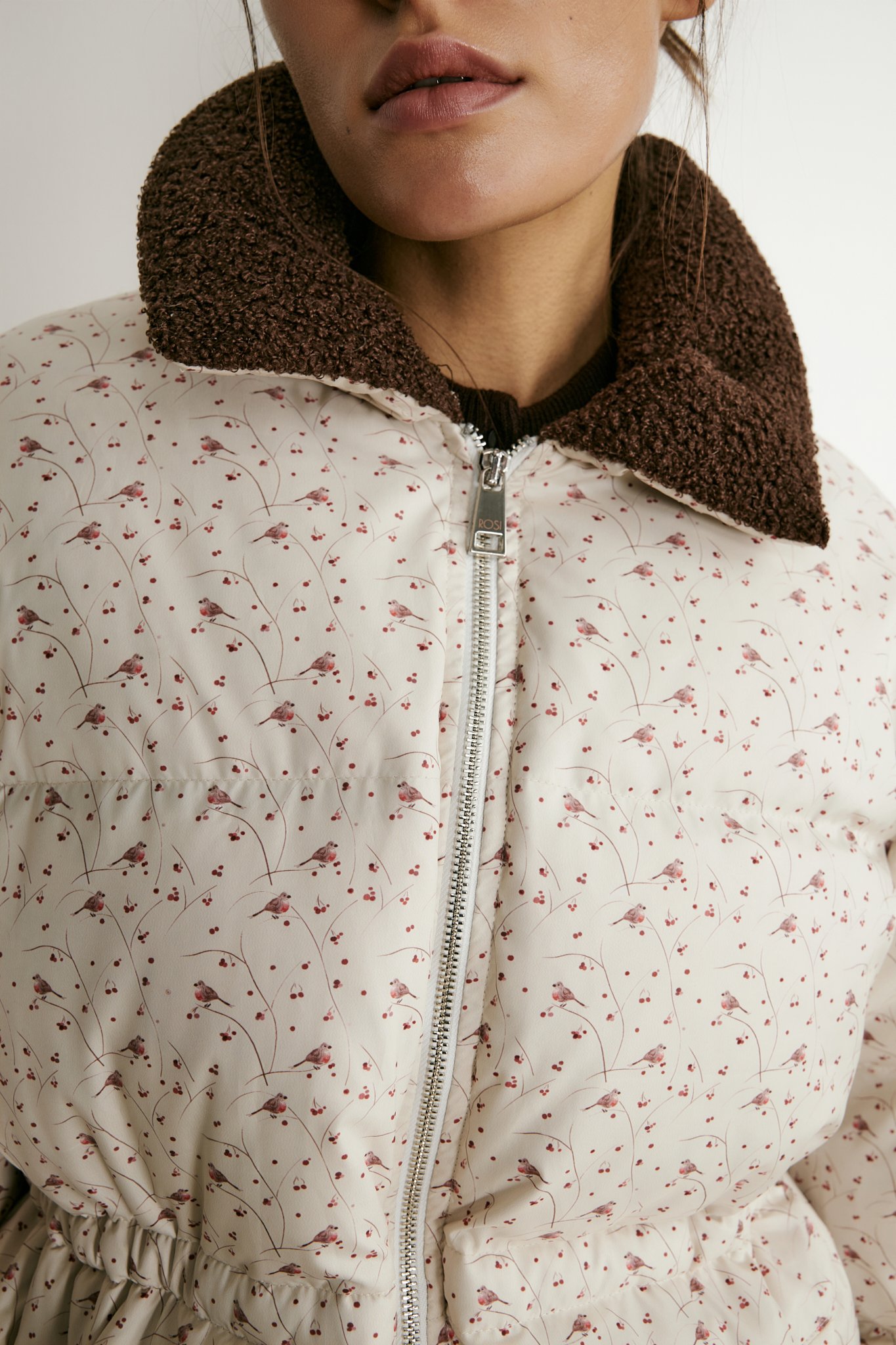 Стеганый пуховик с миниатюрными снегирями на ветках рябины скрасит морозные зимние дни.