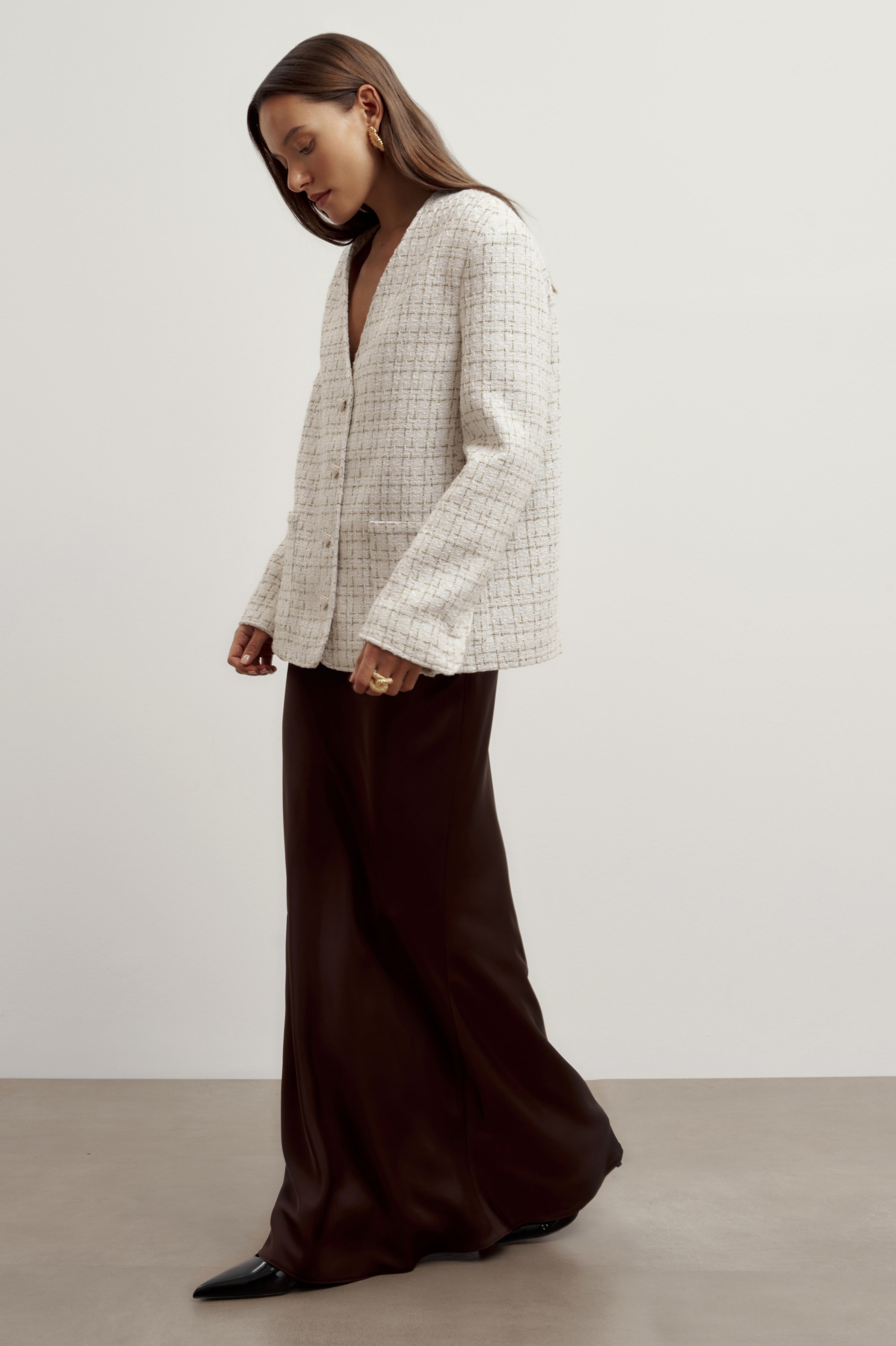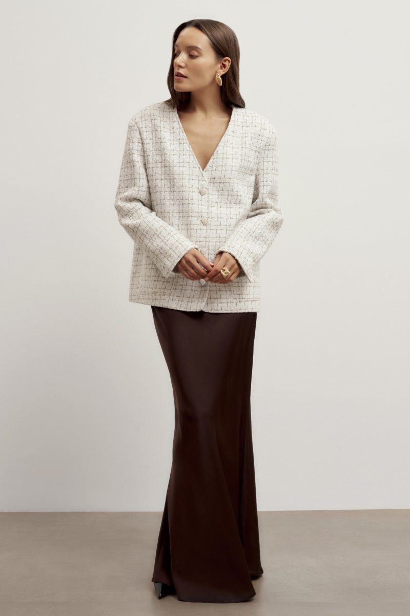 Новинка выполнена из премиальной вискозы, по тактильным ощущениям напоминающей шелк. Струящаяся ткань ниспадает мягкими складками по фигуре и переливается сатиновым блеском.