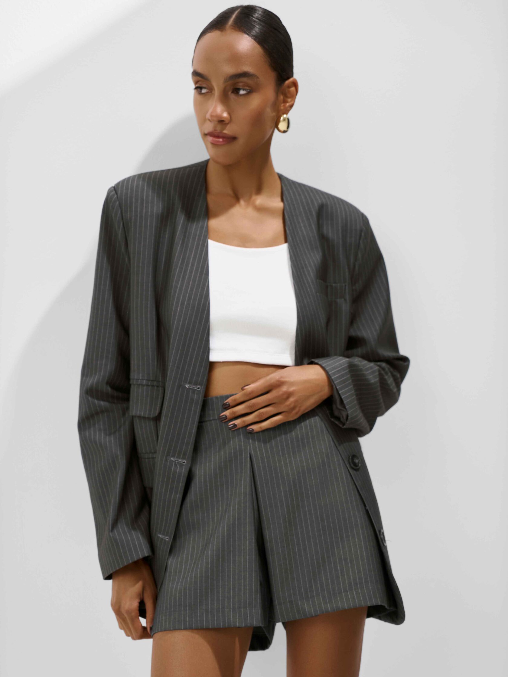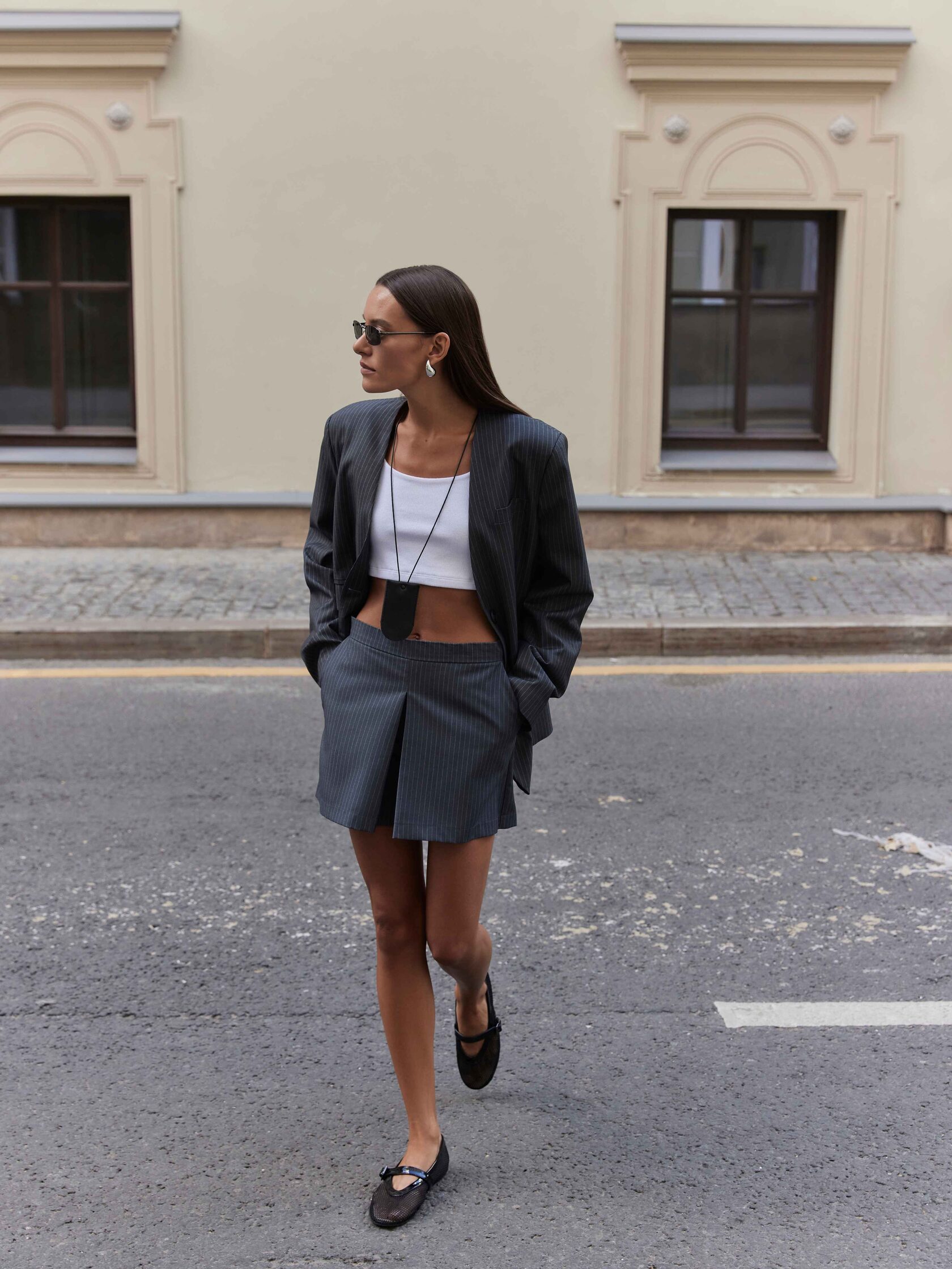 Носите шорты в составе костюма — в паре с жакетом без лацканов из нашей коллекции.