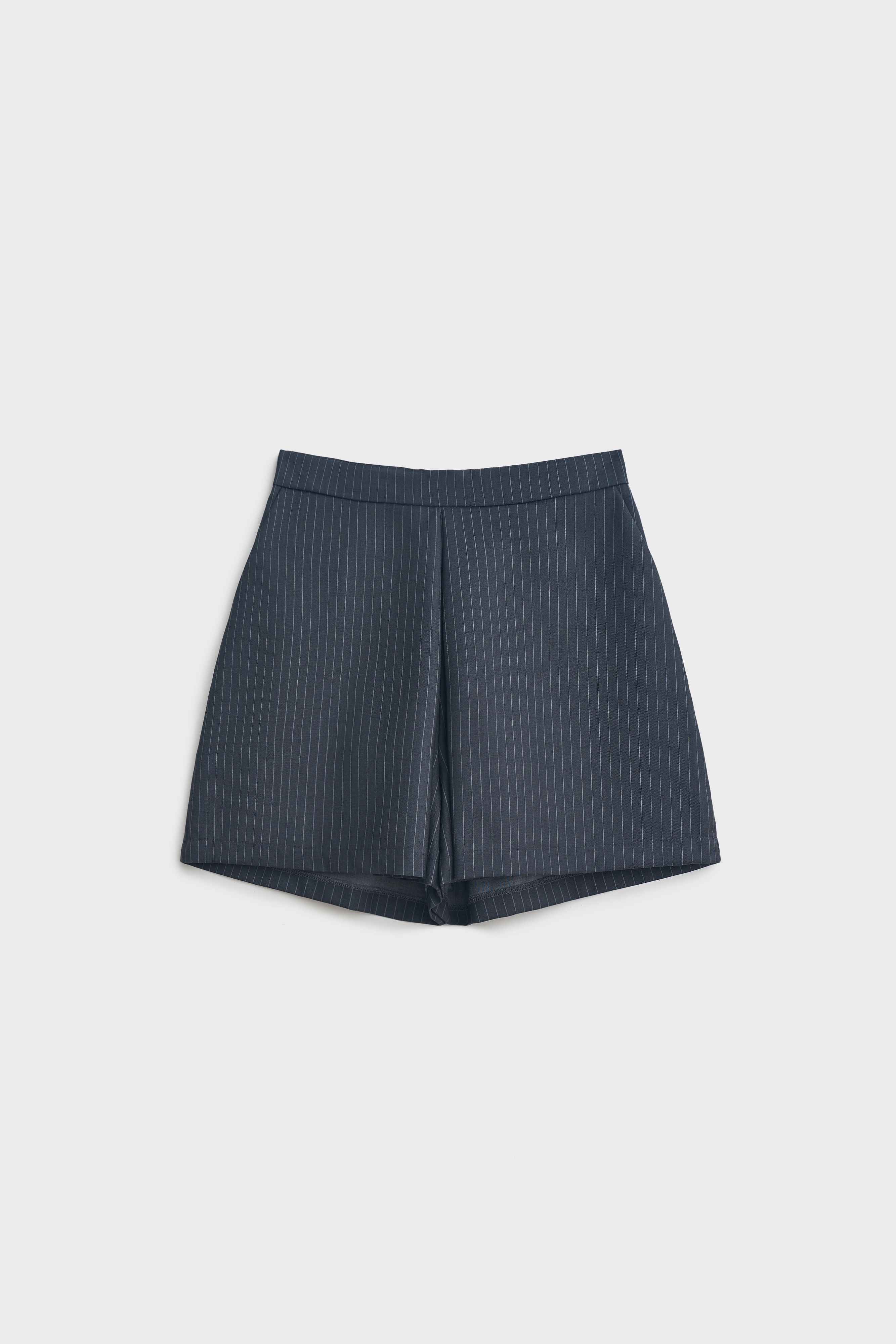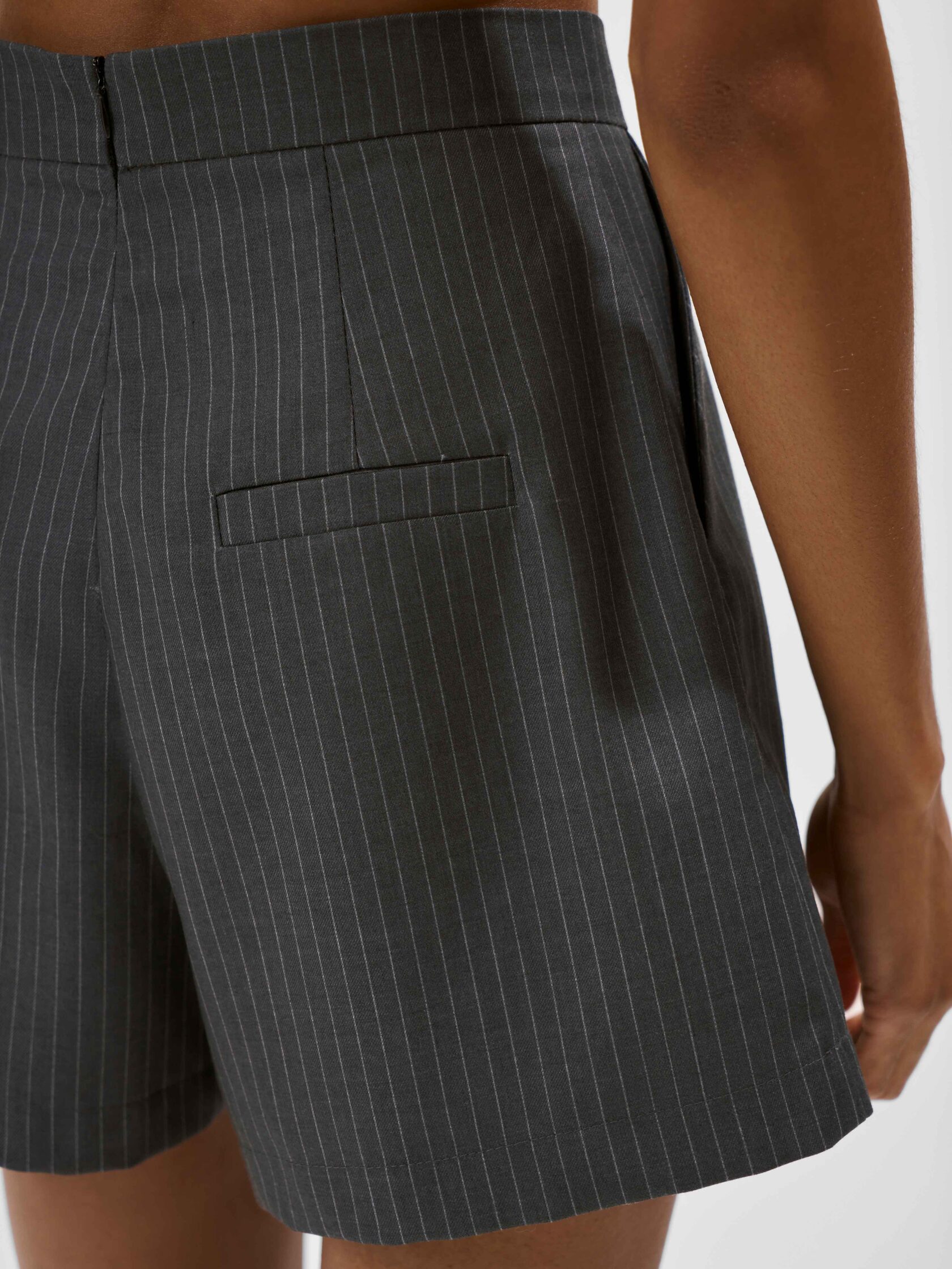 Шорты в тонкую вертикальную полоску — вместо брюк в теплую раннюю осень.
