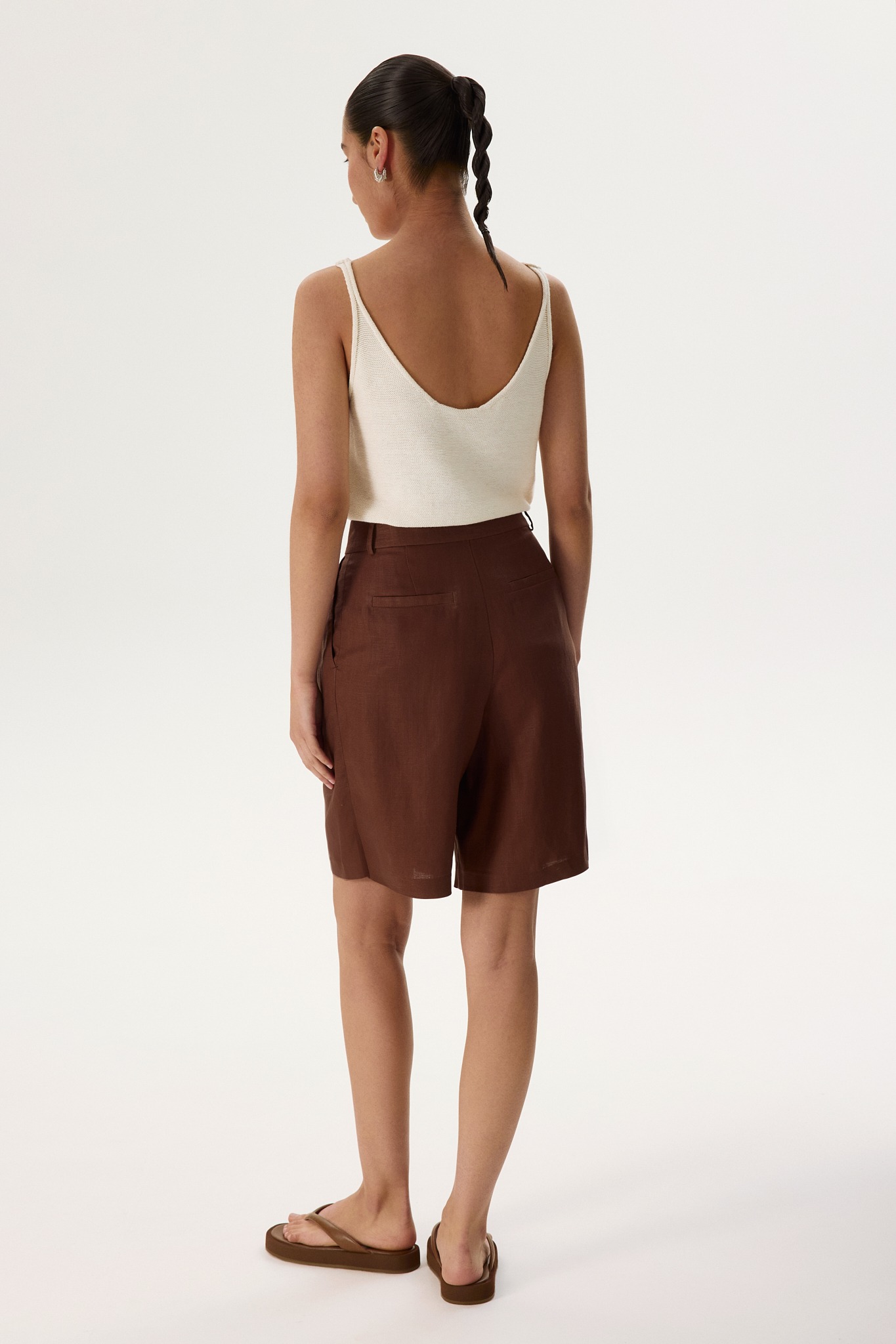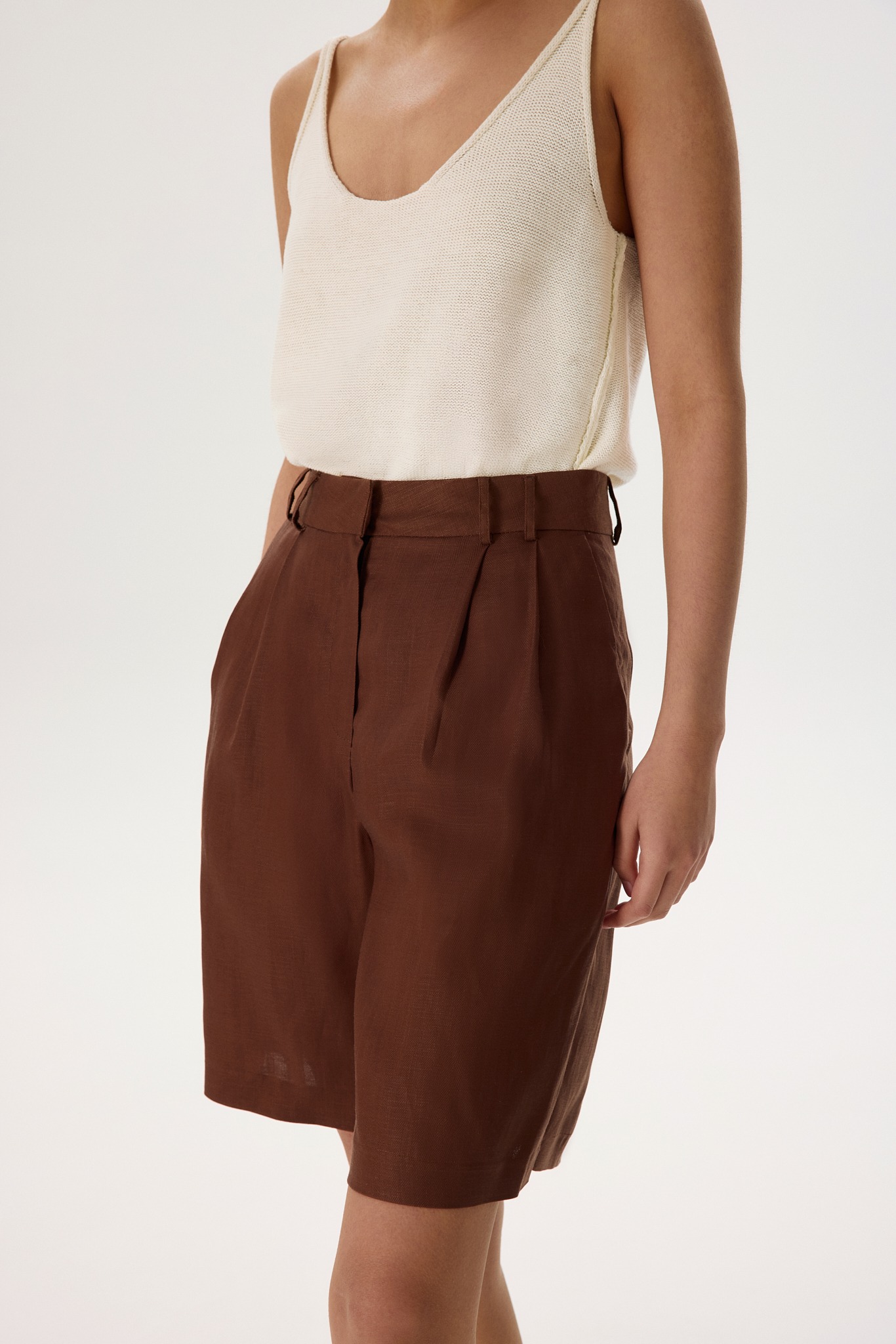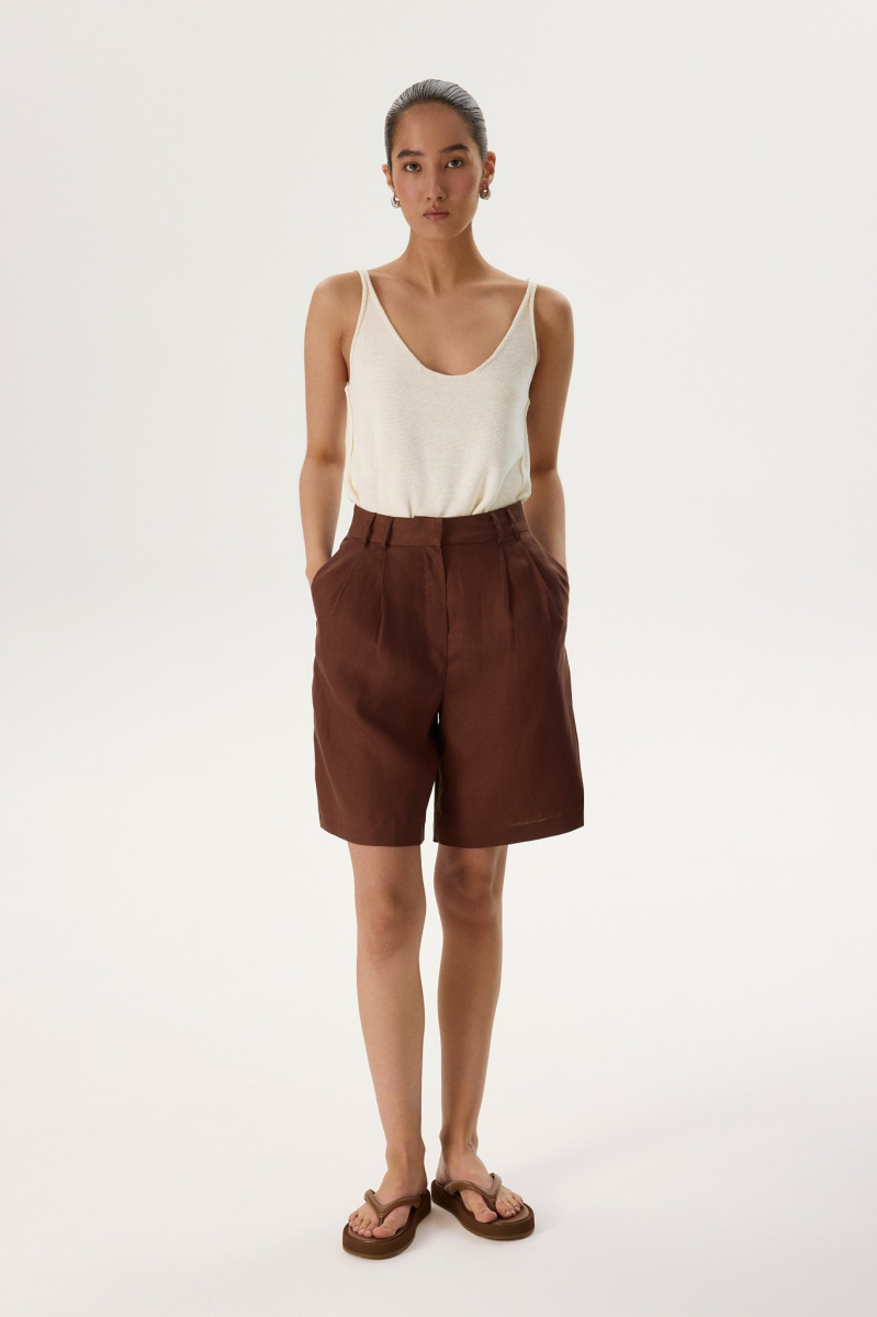 Новинка выполнена изо льна с фактурой «елочка» — такой материал отлично пропускает воздух и отводит влагу, а также ощущается на теле приятной прохладой. Для подкладки в виде потайных шортиков был выбран 100% натуральный хлопок, чтобы обеспечить дополнительную мягкость и комфорт.