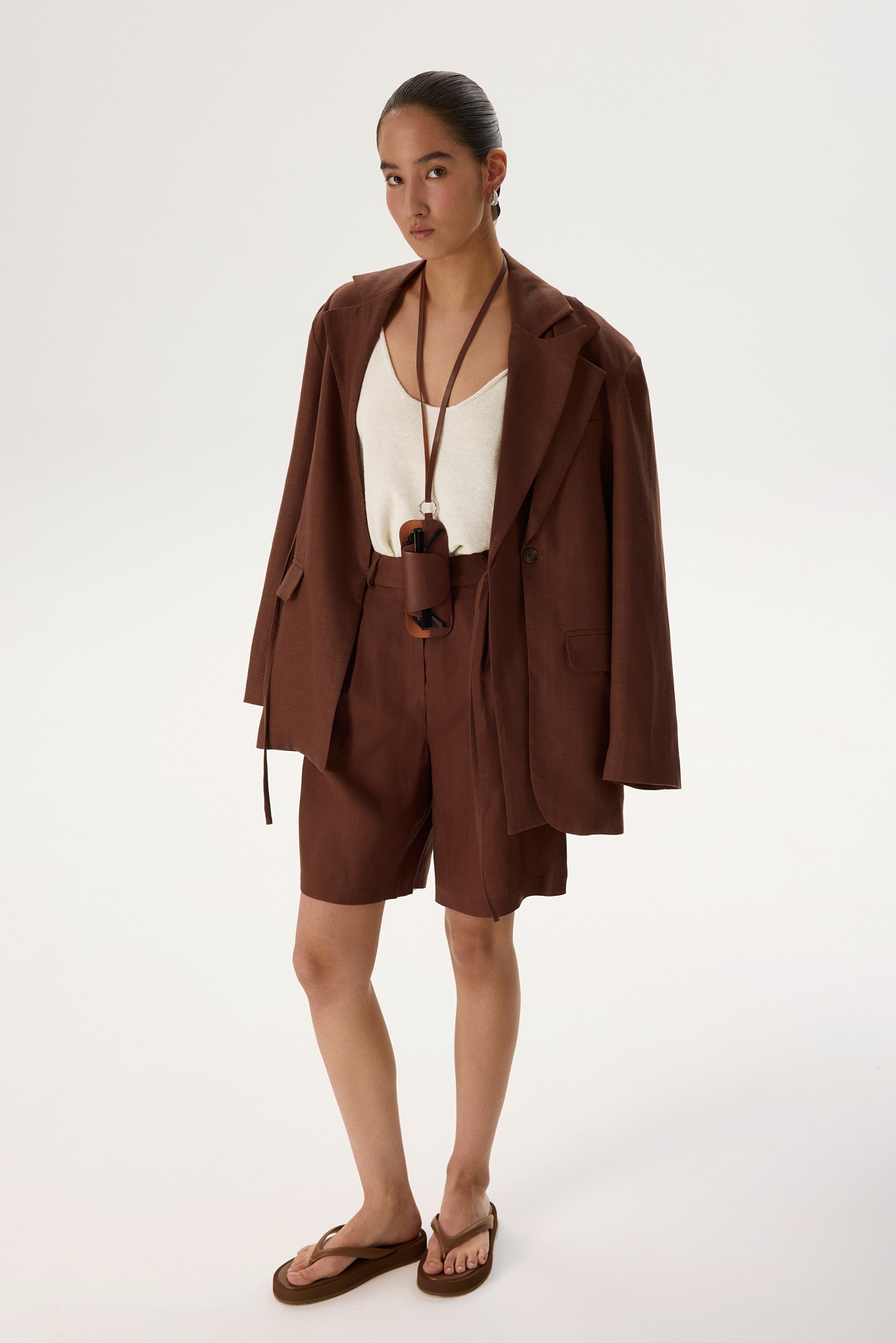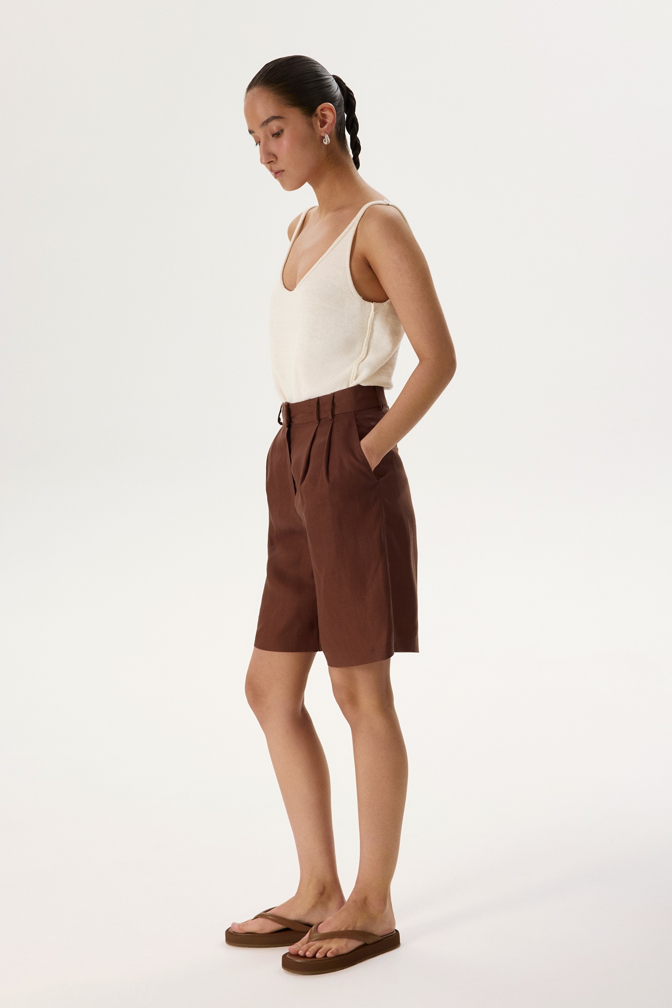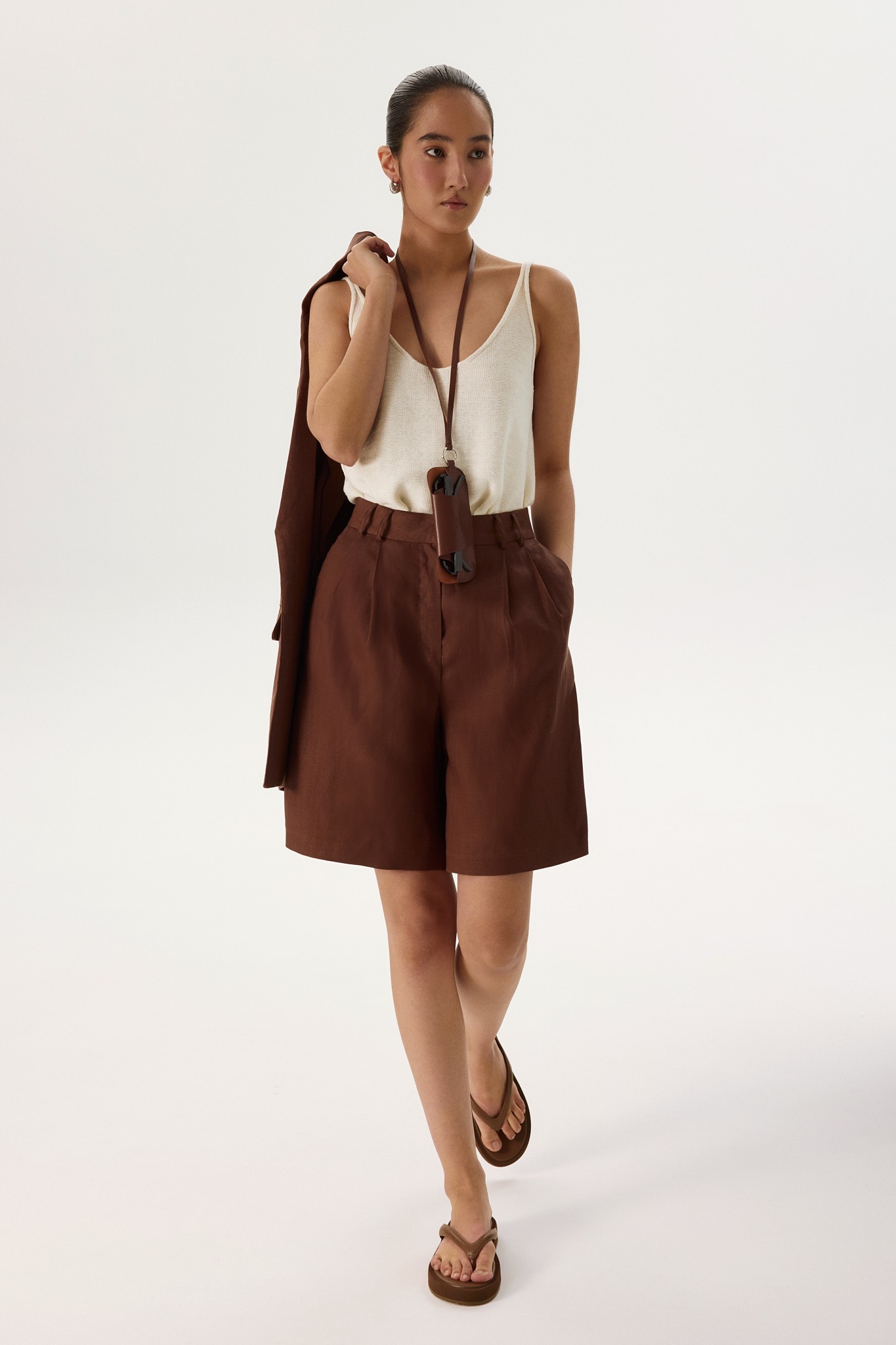 Новинка выполнена изо льна с фактурой «елочка» — такой материал отлично пропускает воздух и отводит влагу, а также ощущается на теле приятной прохладой. Для подкладки в виде потайных шортиков был выбран 100% натуральный хлопок, чтобы обеспечить дополнительную мягкость и комфорт.