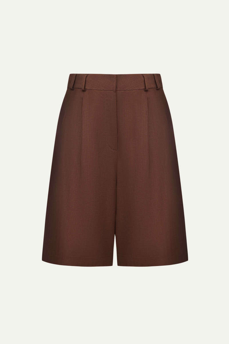 Модель выполнена в лучших традициях «бермуд»: прямой и широкий силуэт, высокая посадка, защипы в области талии.
