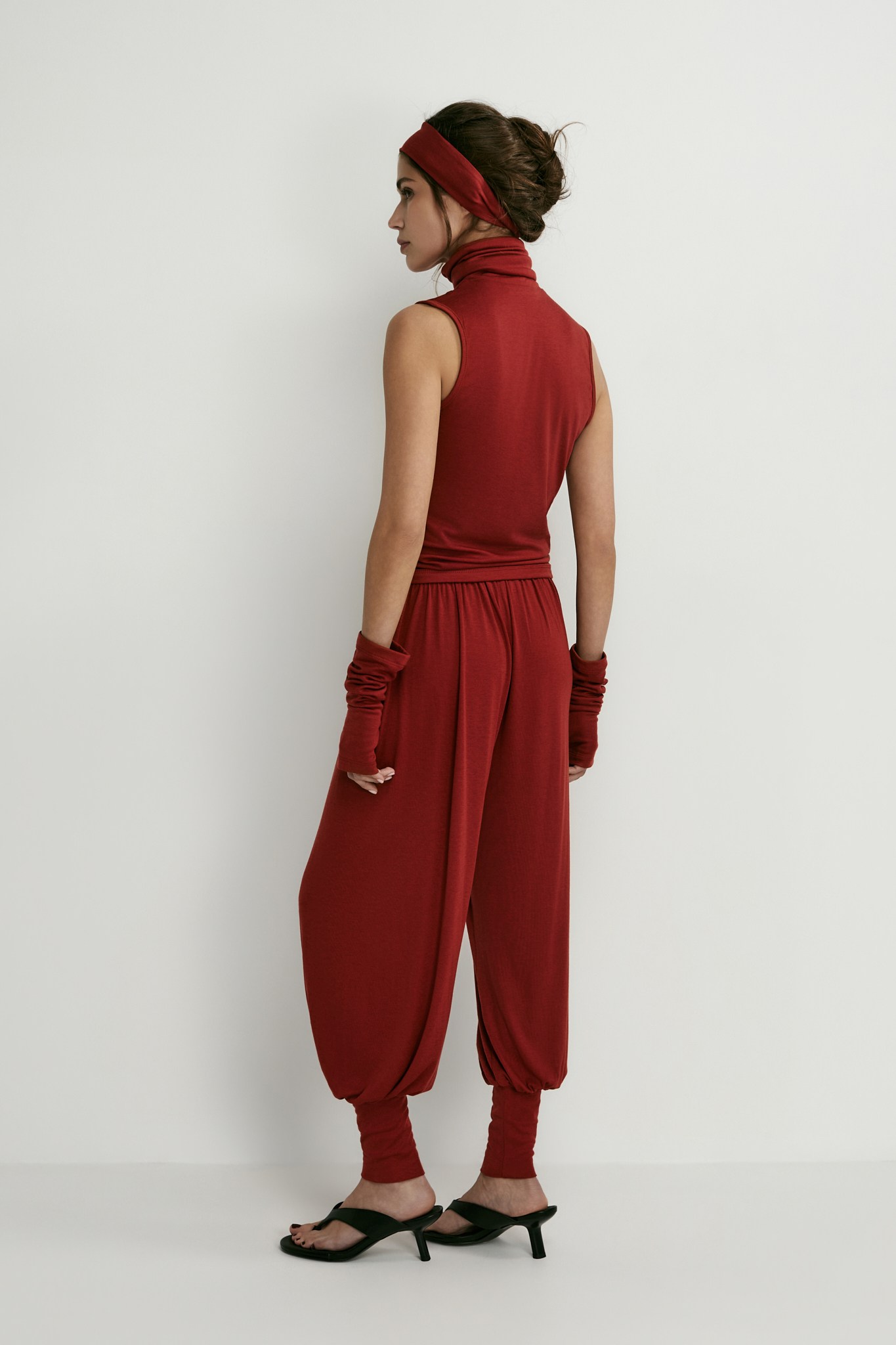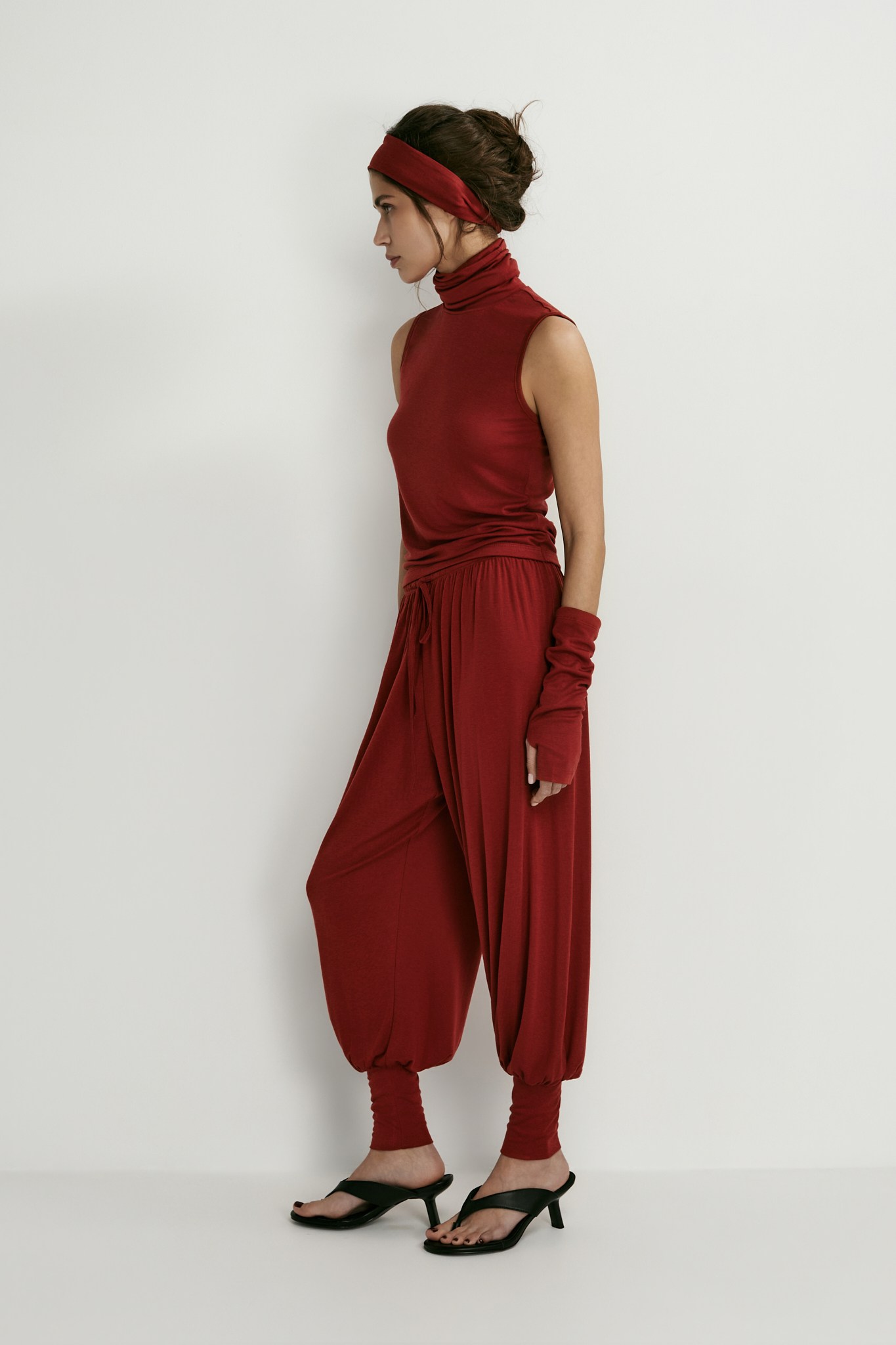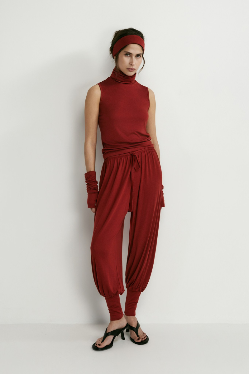 Струящиеся брюки-алладины зададут расслабленное настроение образу и позволят чувствовать себя комфортно до самого вечера.