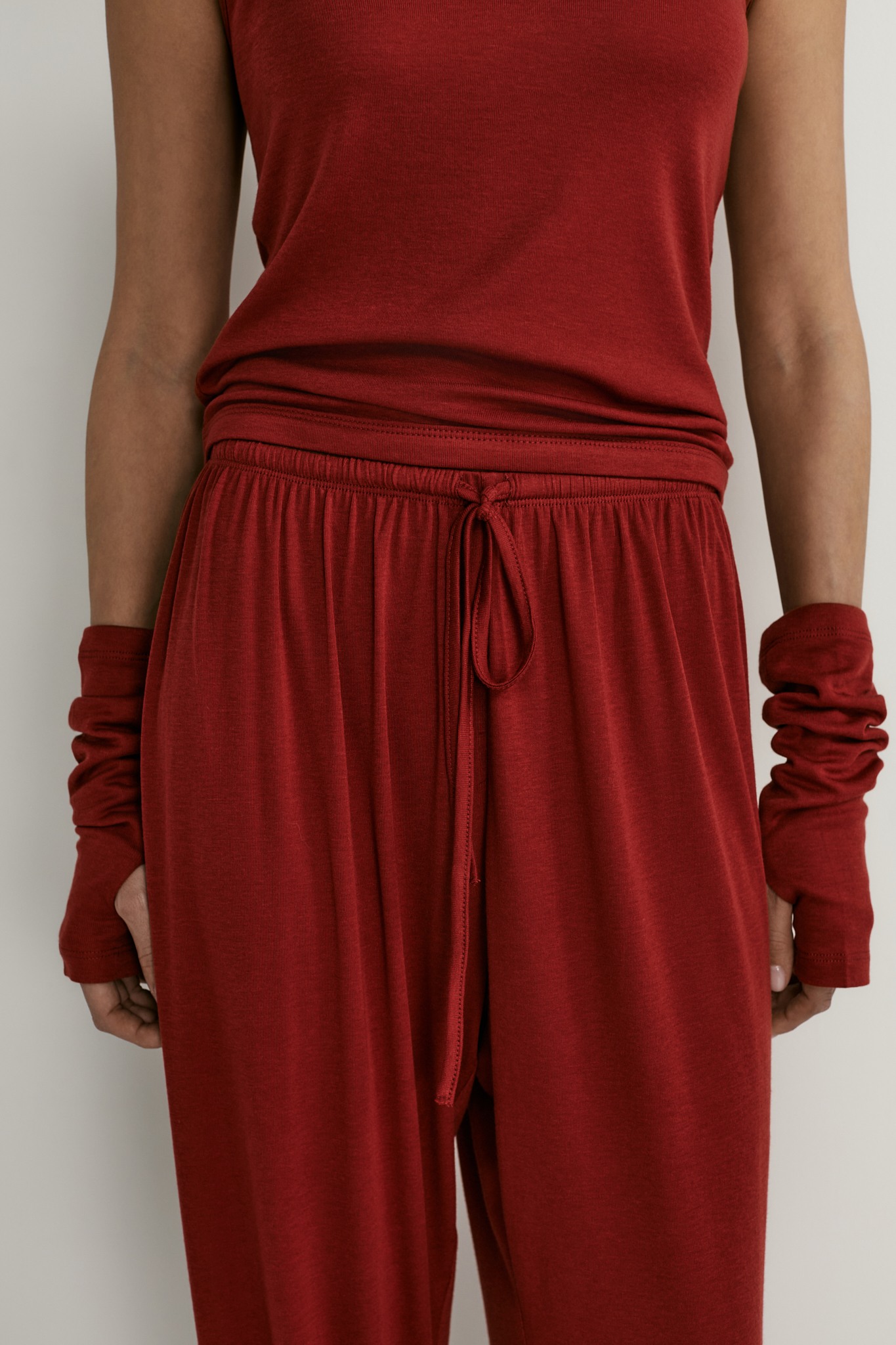 1. Выполнены из тонкого трикотажа на основе лиоцелла — нежного на ощупь волокна из древесной целлюлозы. В составе есть шерсть, поэтому изделие согревает, оставаясь легким и невесомым.