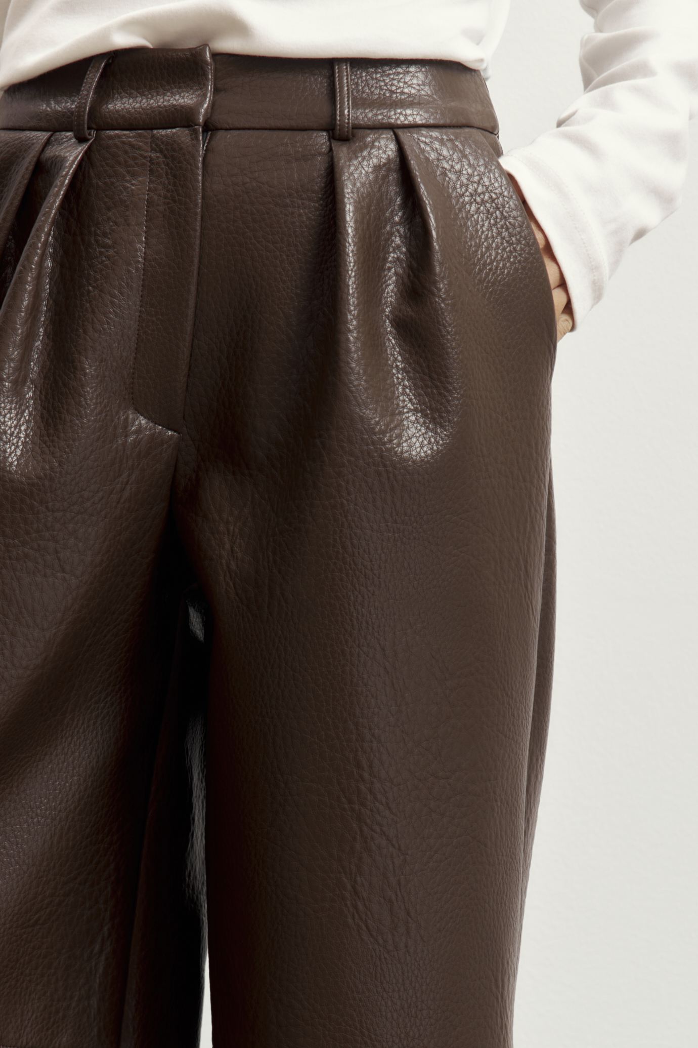 Новинка выполнена из фактурной экокожи с зернистой поверхностью. Текстуру материала подчеркивает насыщенный шоколадный оттенок.