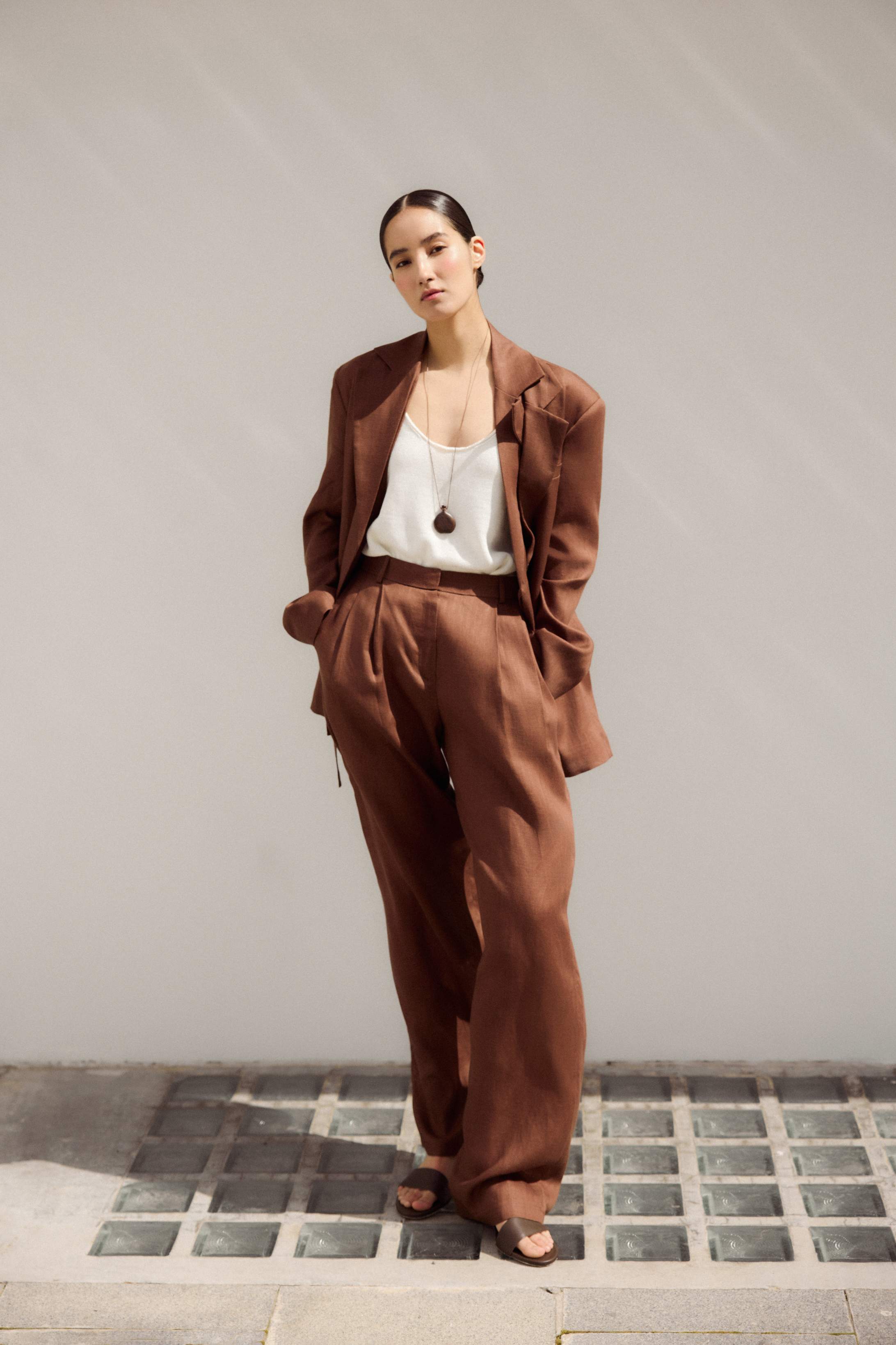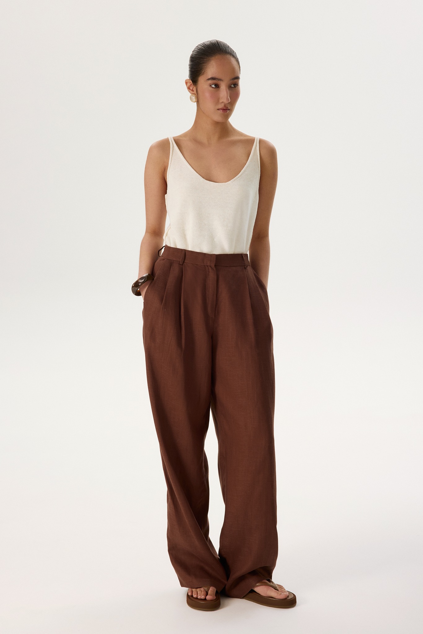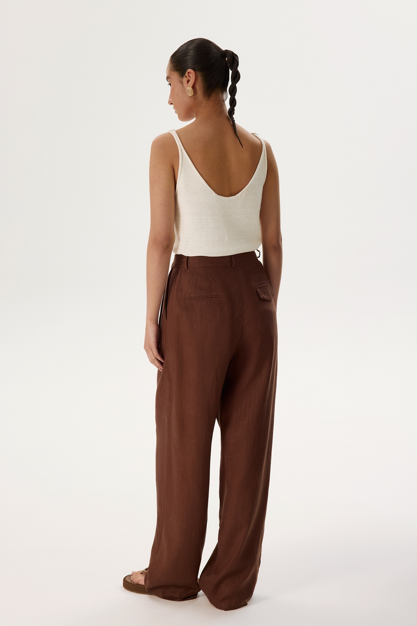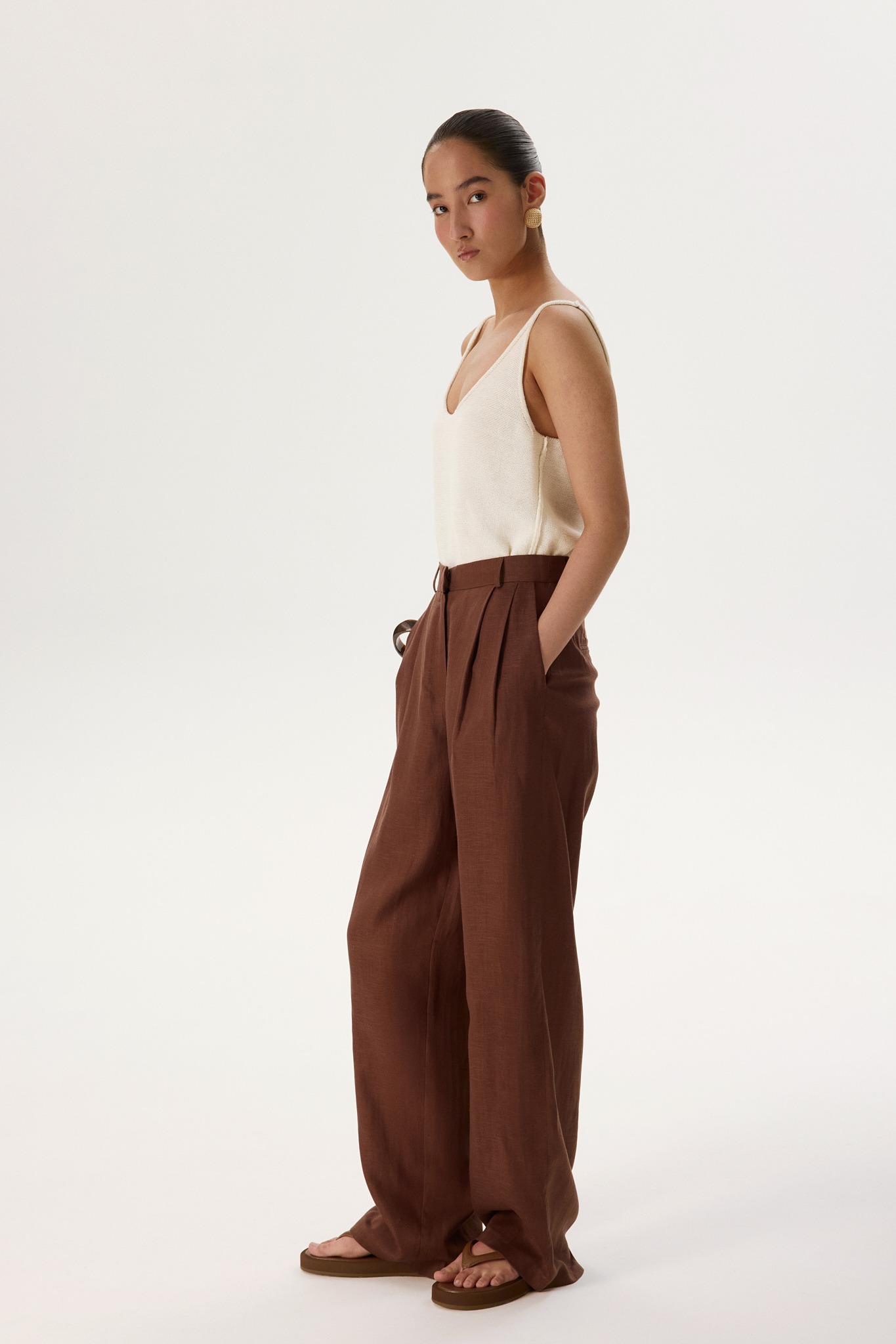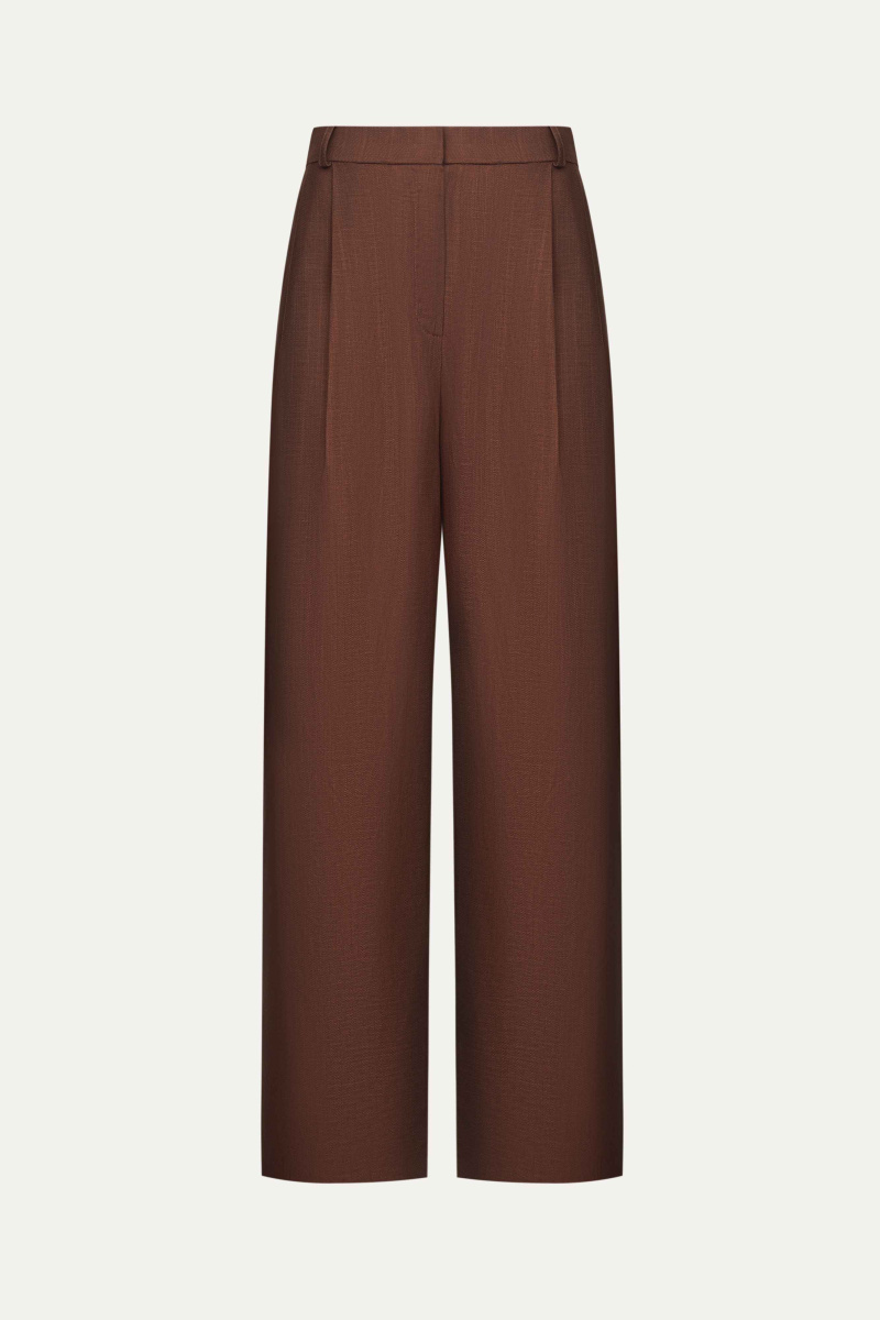 Прямые и широкие, с высокой посадкой и защипами, переходящими в стрелки, — брюки визуально подчеркнут талию и вытянут силуэт. Корсажный пояс можно вывернуть, чтобы сделать образ более интересным.