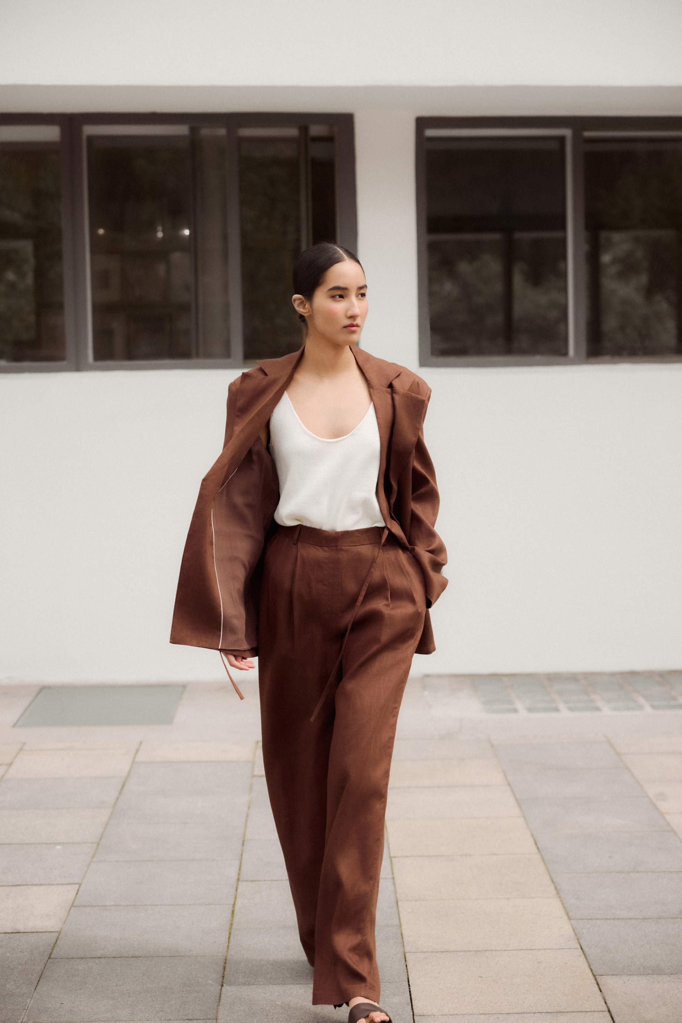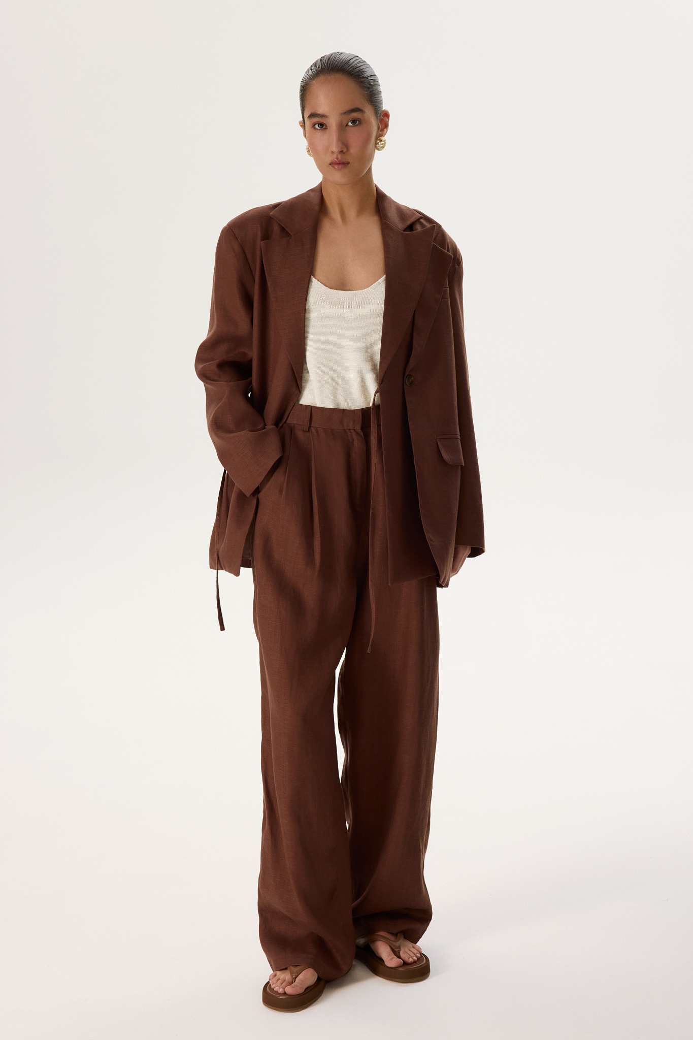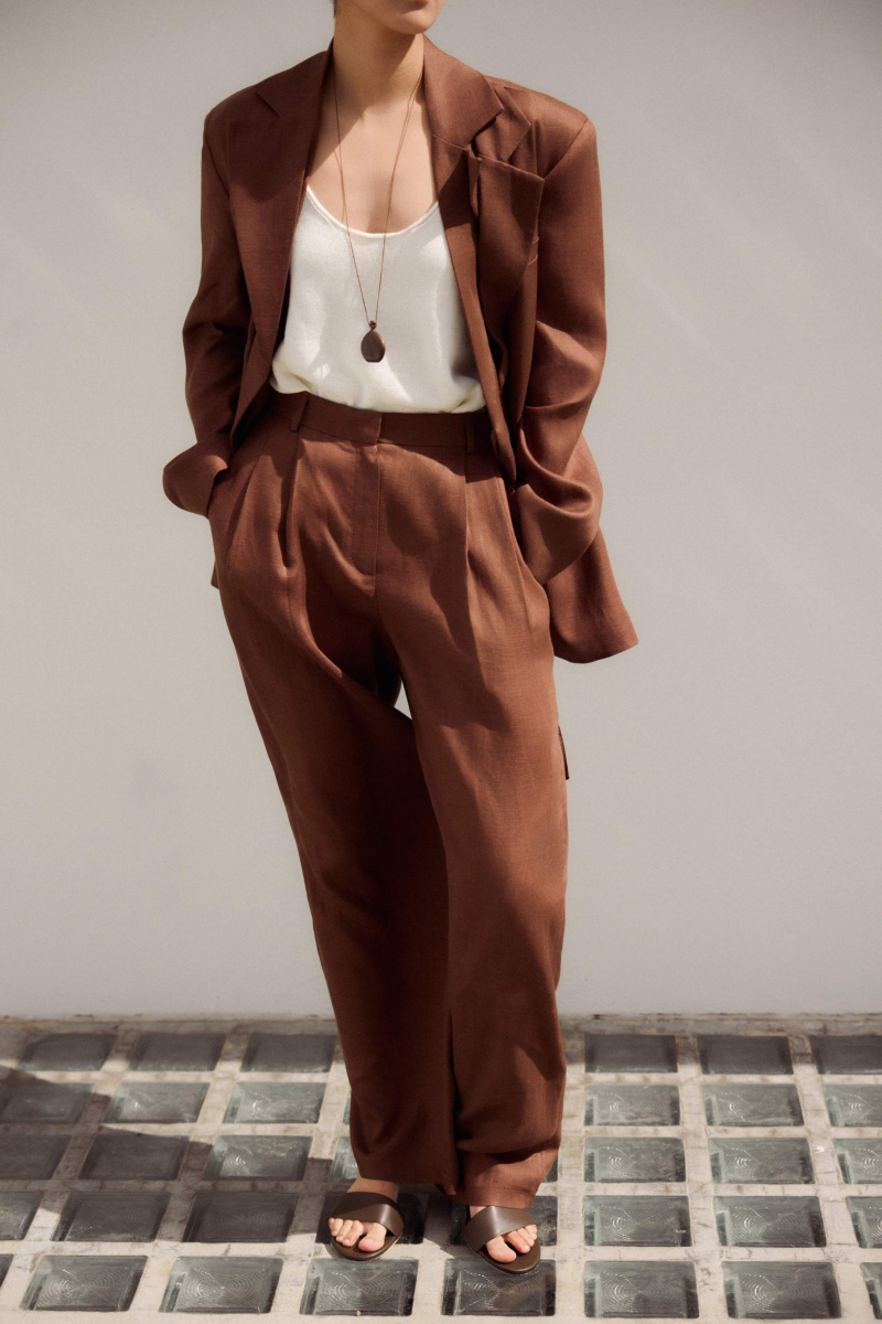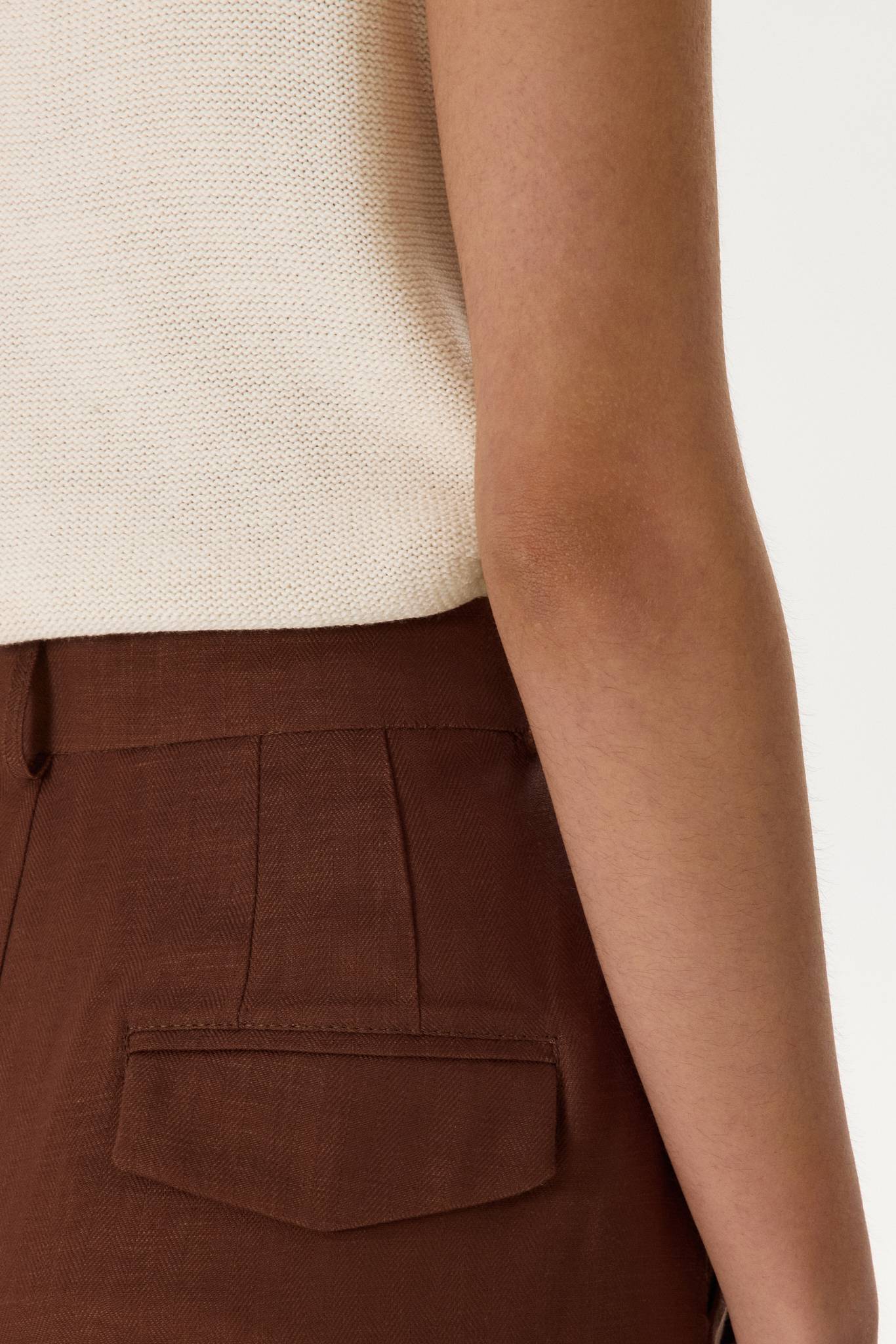 Новинка выполнена изо льна с фактурой «елочка» — такой материал отлично пропускает воздух и отводит влагу, а также ощущается на теле приятной прохладой.