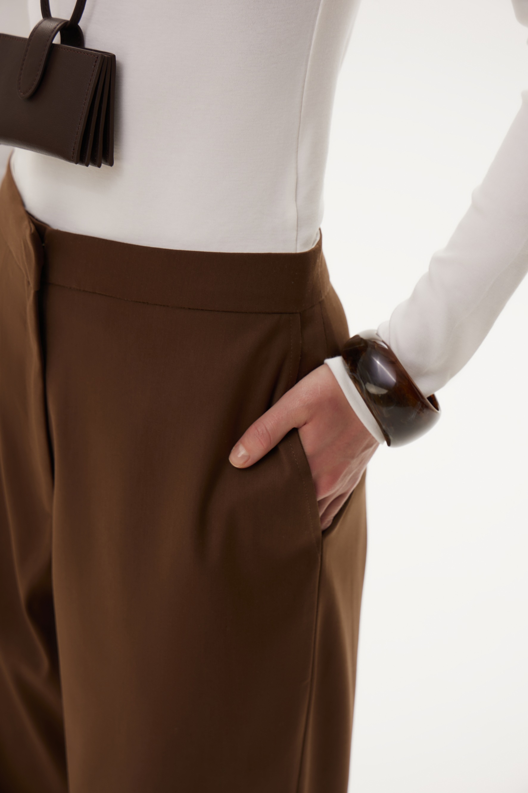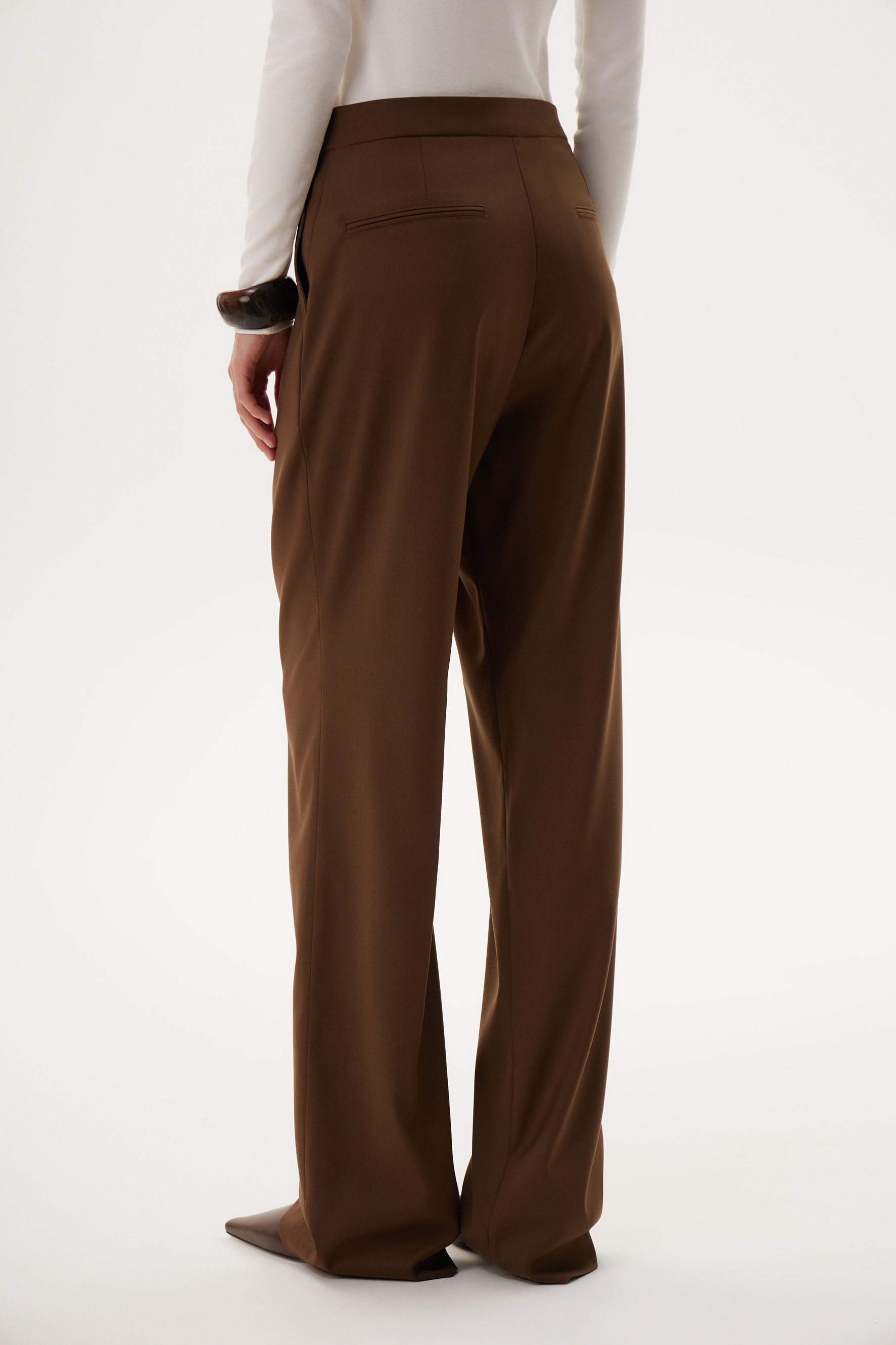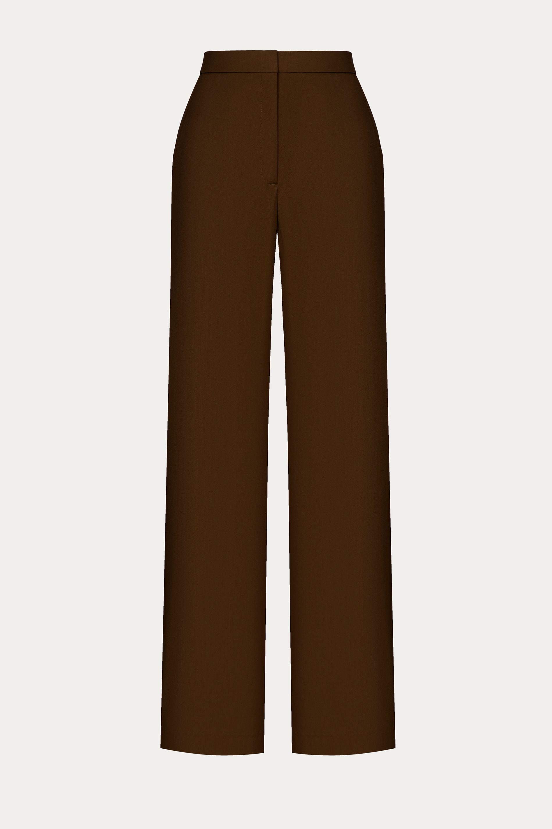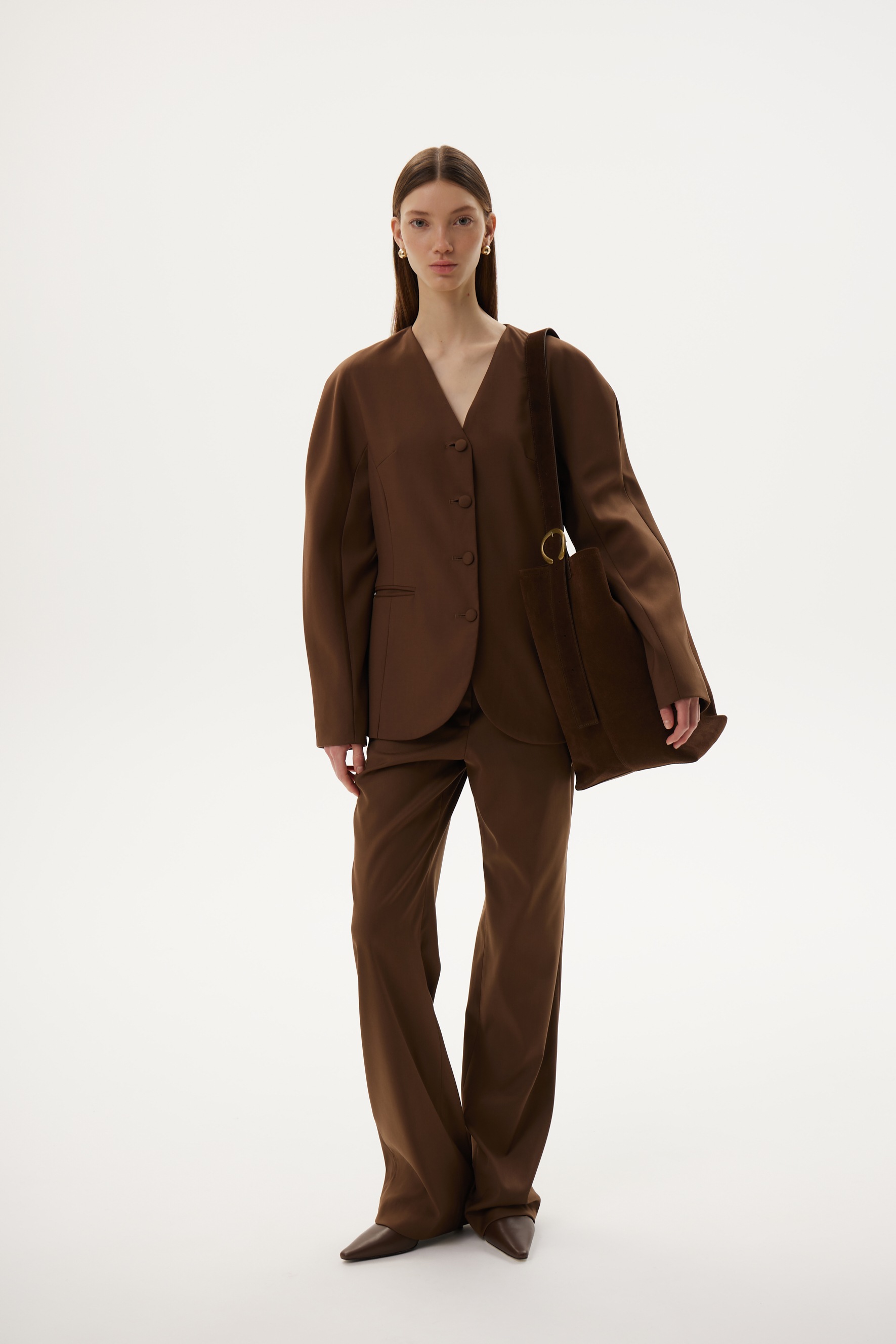 Новинка выполнена из гладкой костюмной ткани шоколадного цвета.