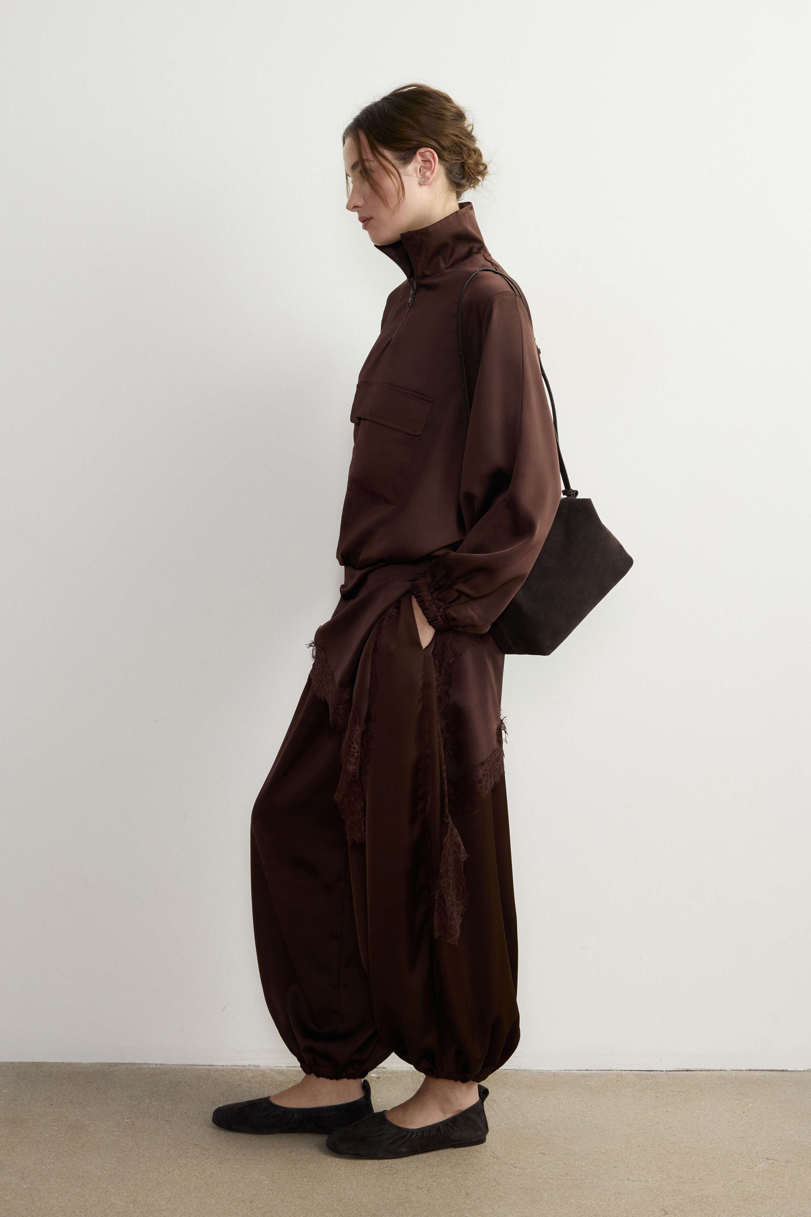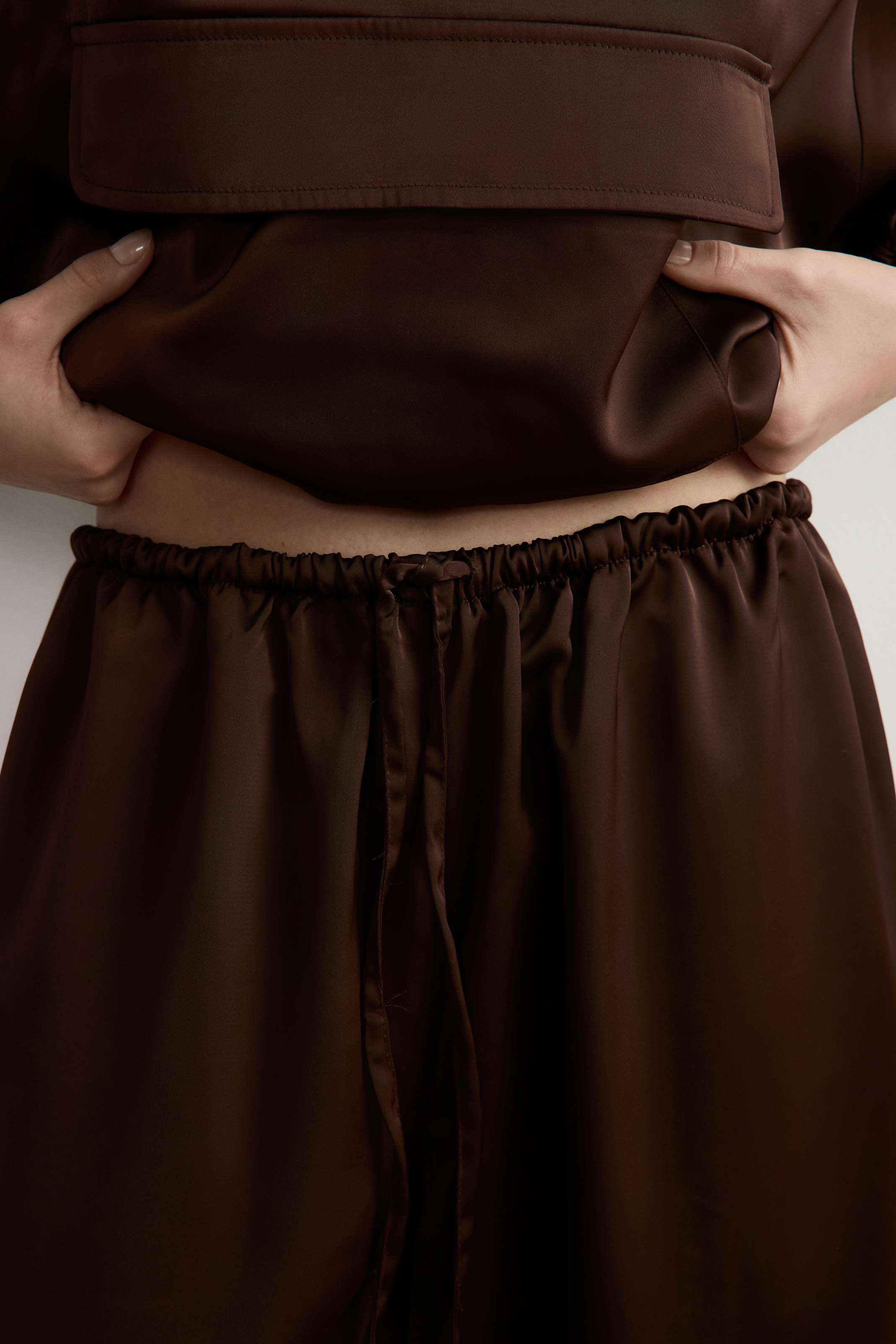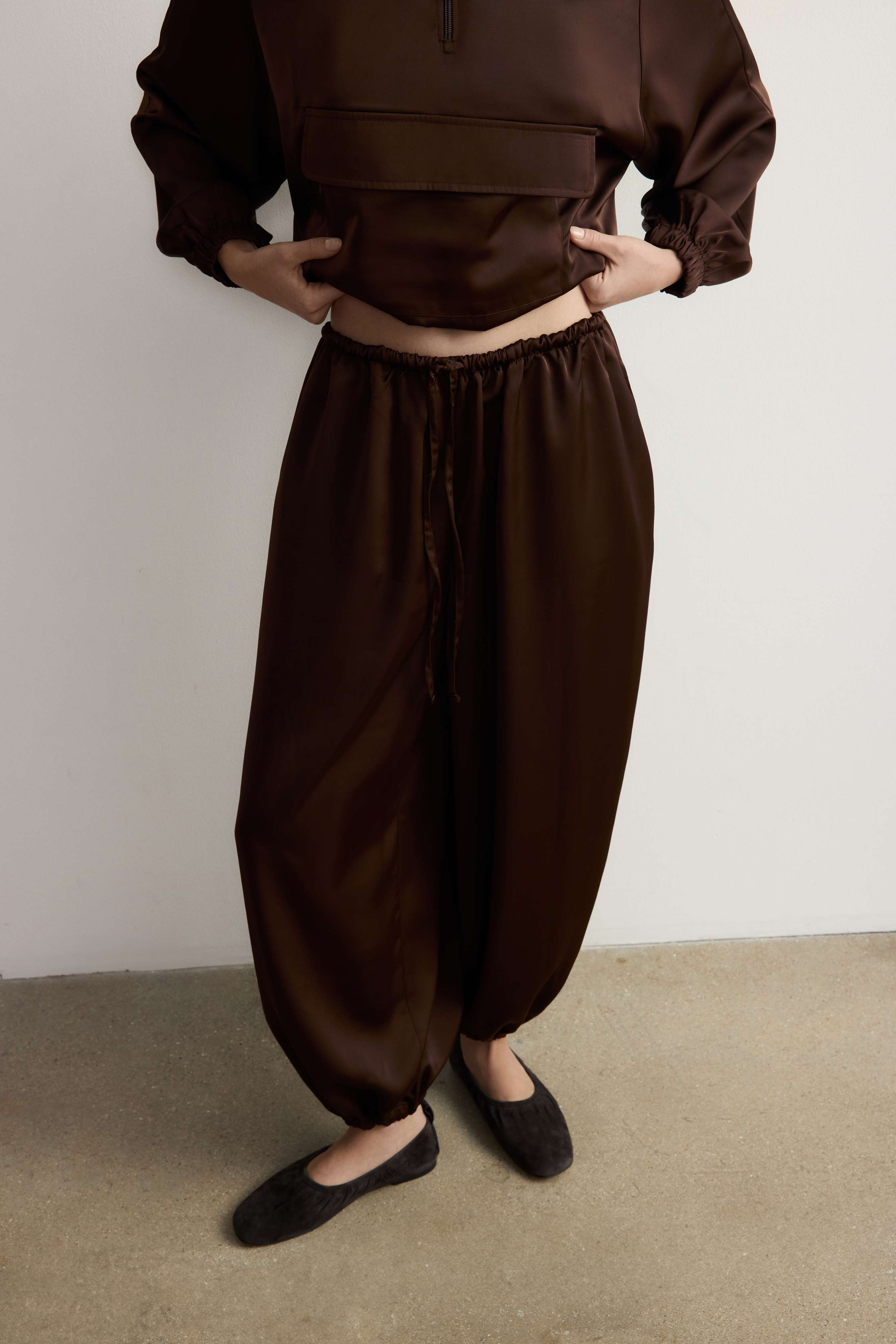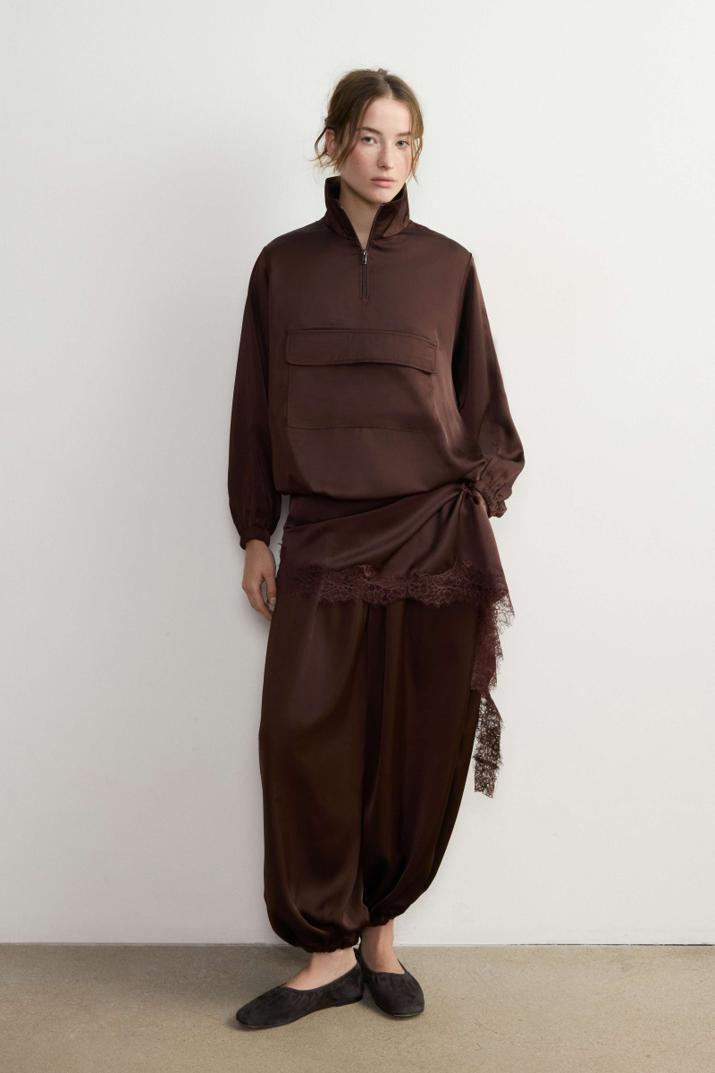 Шаровары на эластичном поясе со шнурком — одна из самых желанных моделей брюк прямо сейчас. Насыщенный оттенок горького шоколада позволит вписать их в осенний гардероб, а плотный атлас подойдет и к дневным, и к вечерним образам. Для большего удобства мы дополнили пару карманами в боковых швах. Рифмуйте с анораком из коллекции ROSI или играйте на контрастах — «алладины» будут выглядеть в тему и в деловых образах с приталенными жакетами и лодочками.