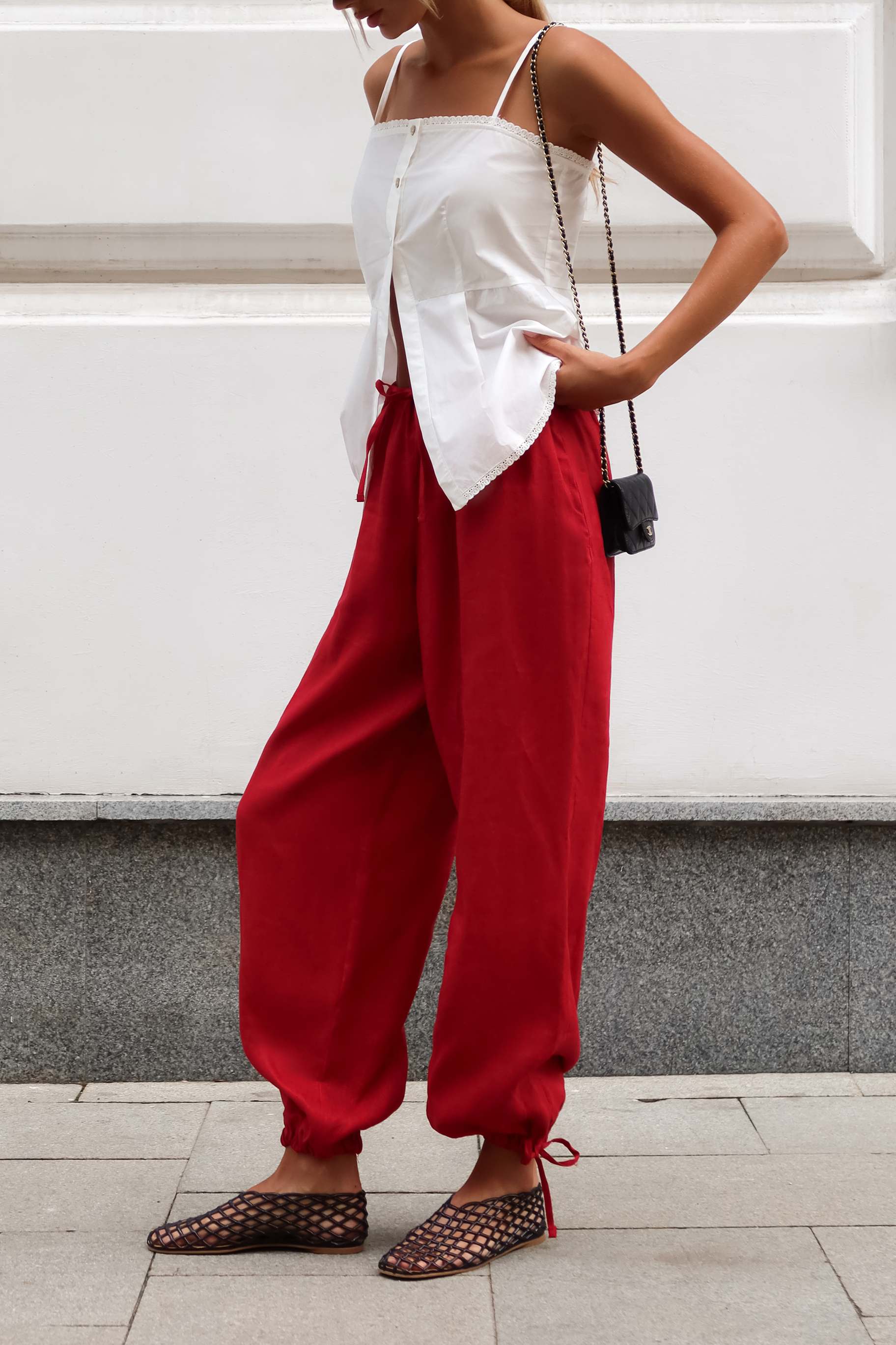 Эластичный пояс со шнурком позволяет регулировать посадку на талии, а кулиска по низу брюк — экспериментировать с силуэтом.