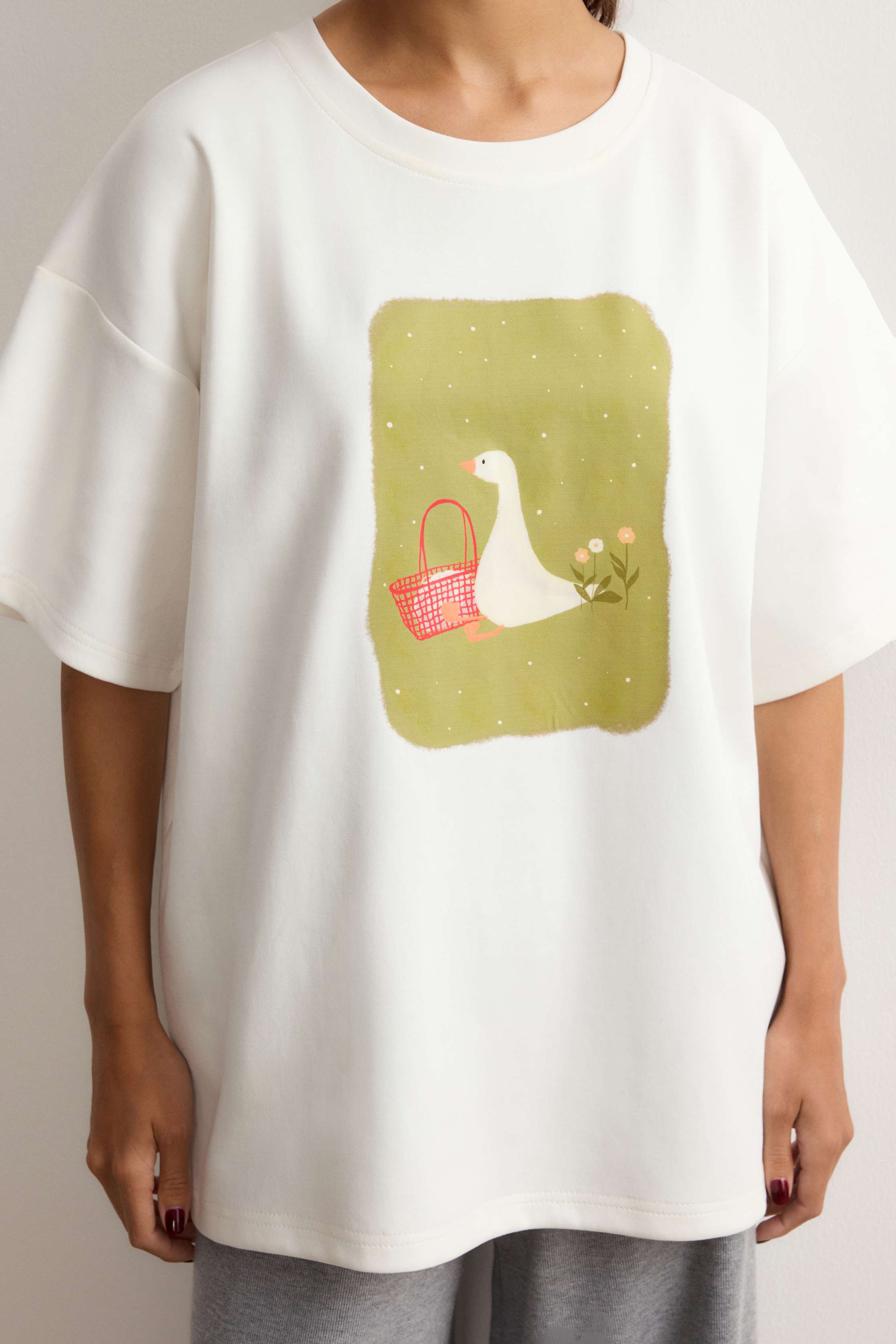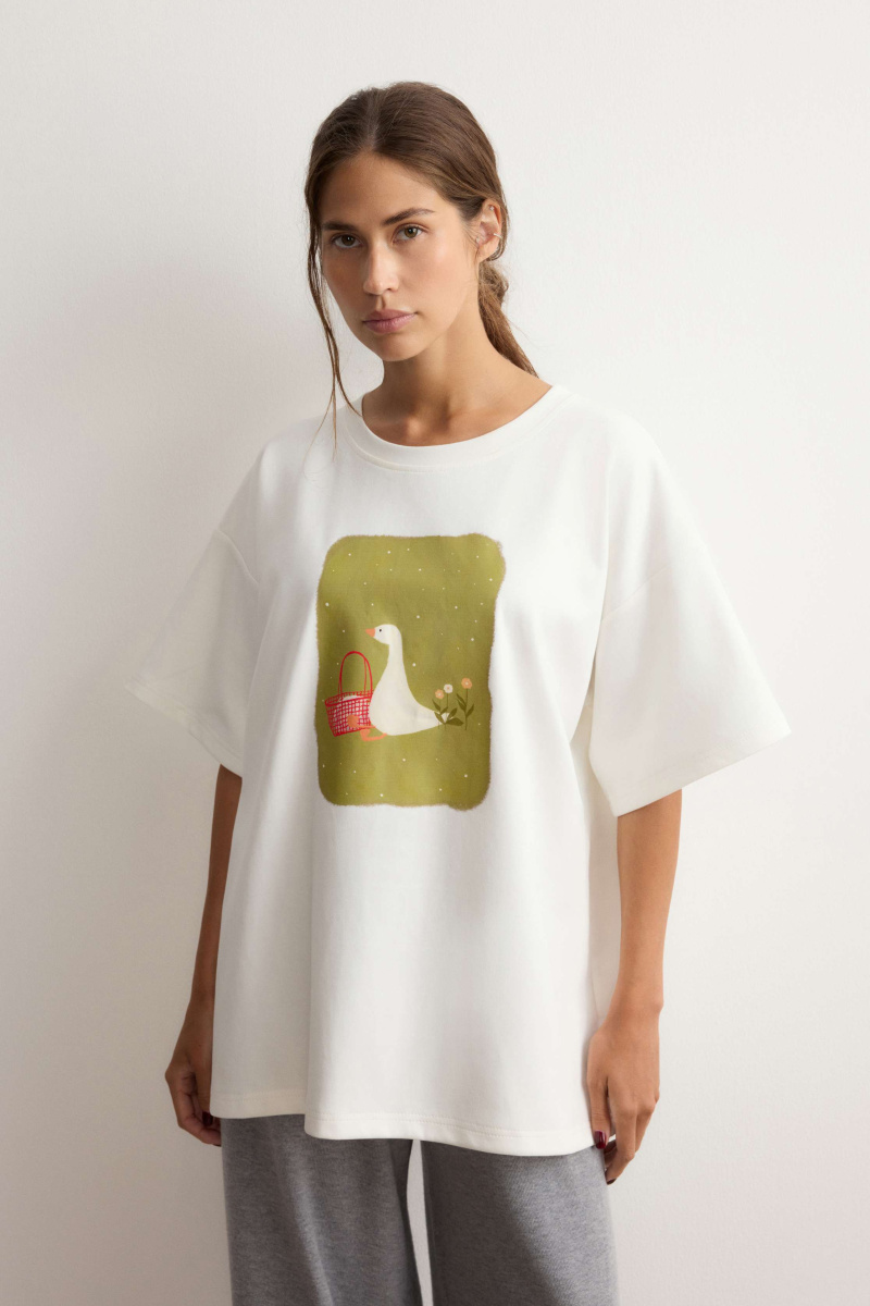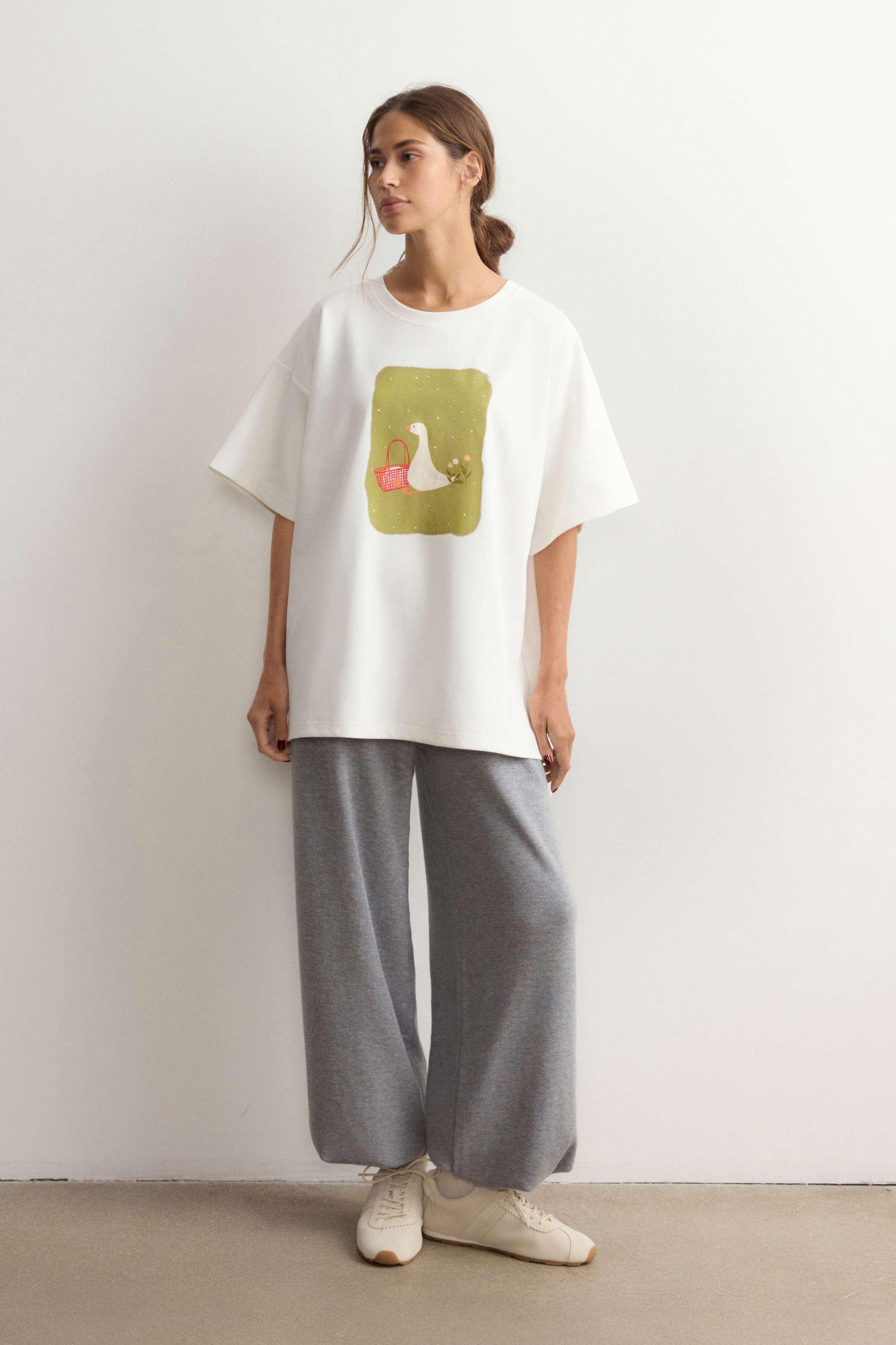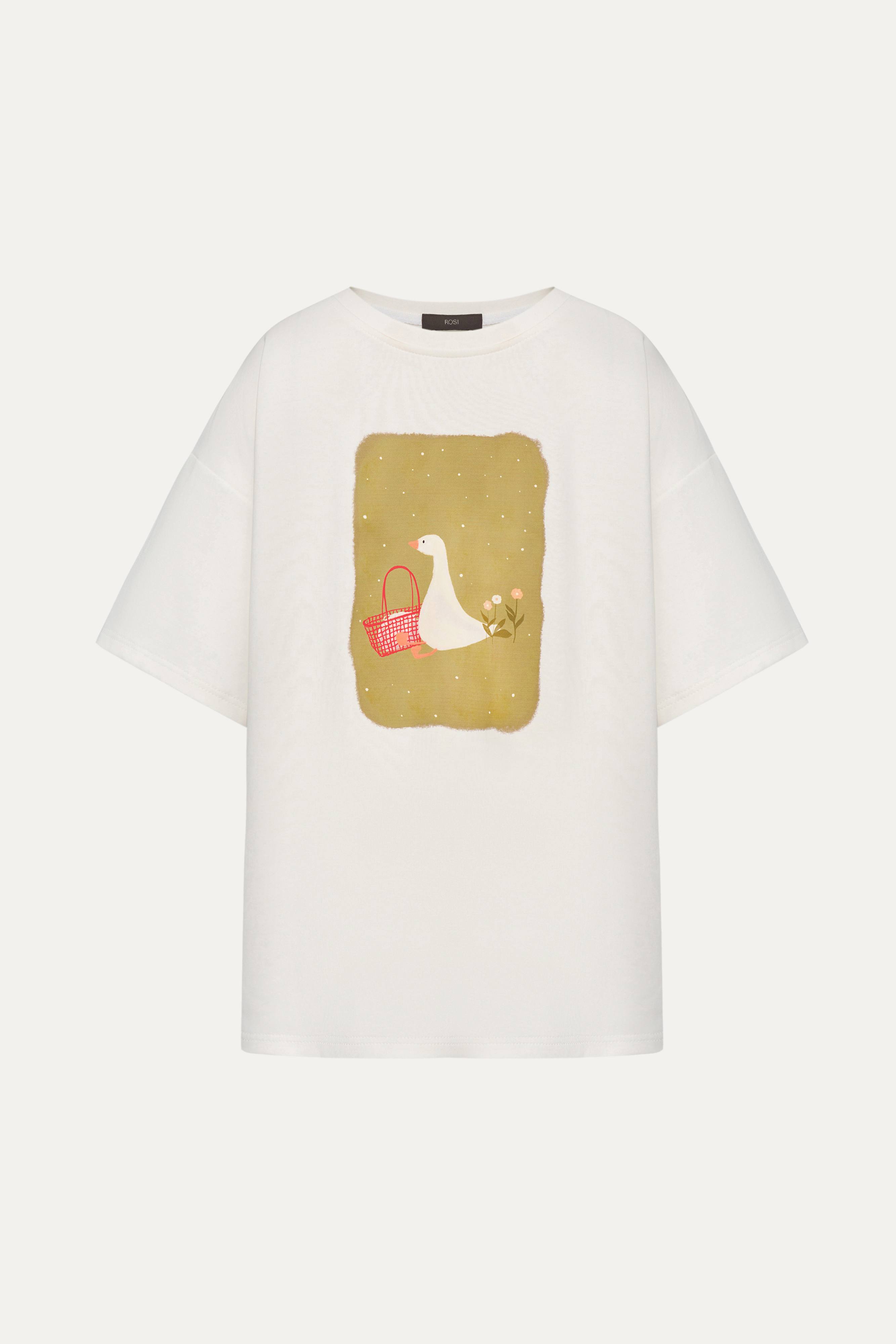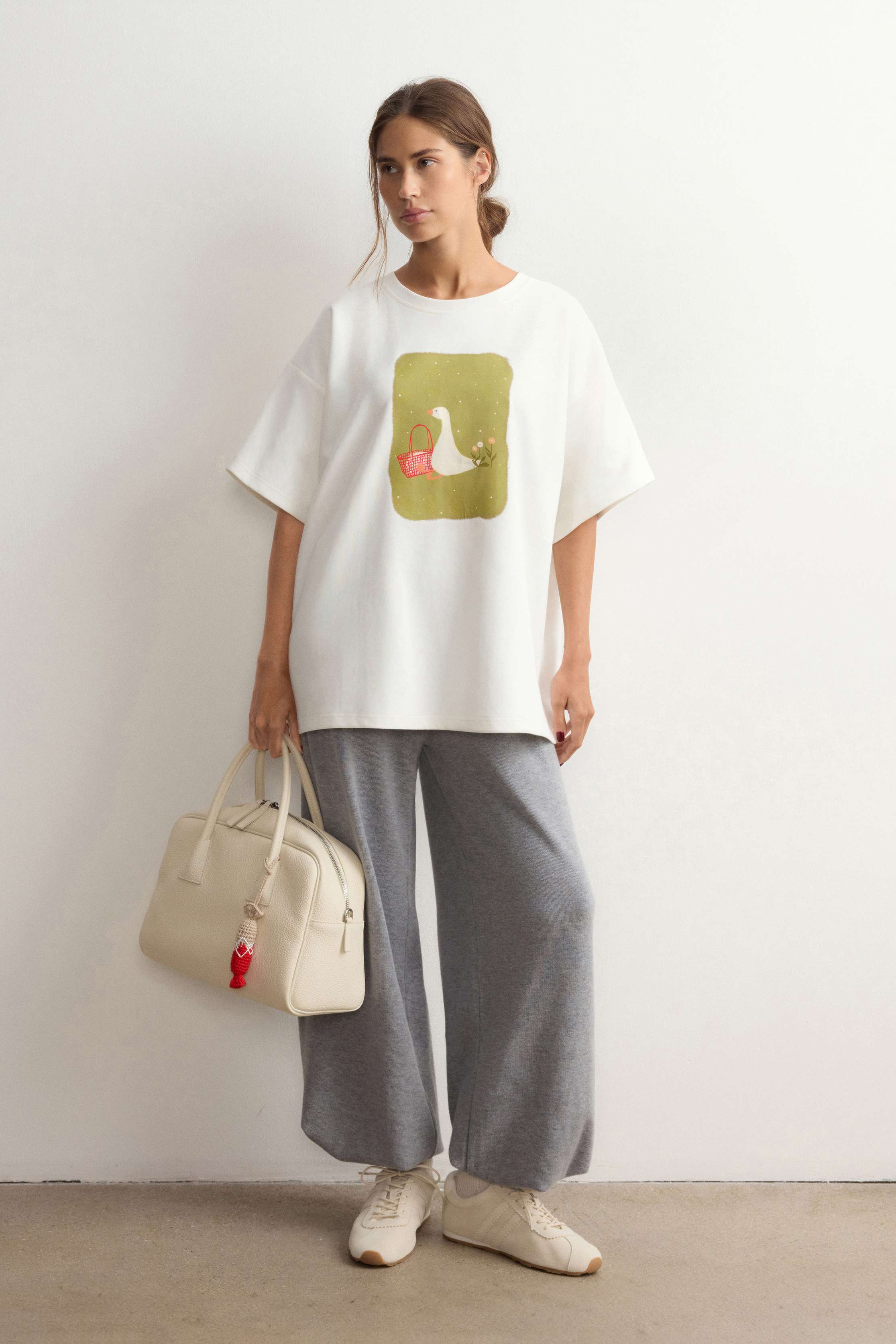 Прежде чем украсить футболку, принт был отрисован художником на бумаге. На нем, помимо очаровательного гуся, — точная копия плетеной сумки из нашей коллекции.