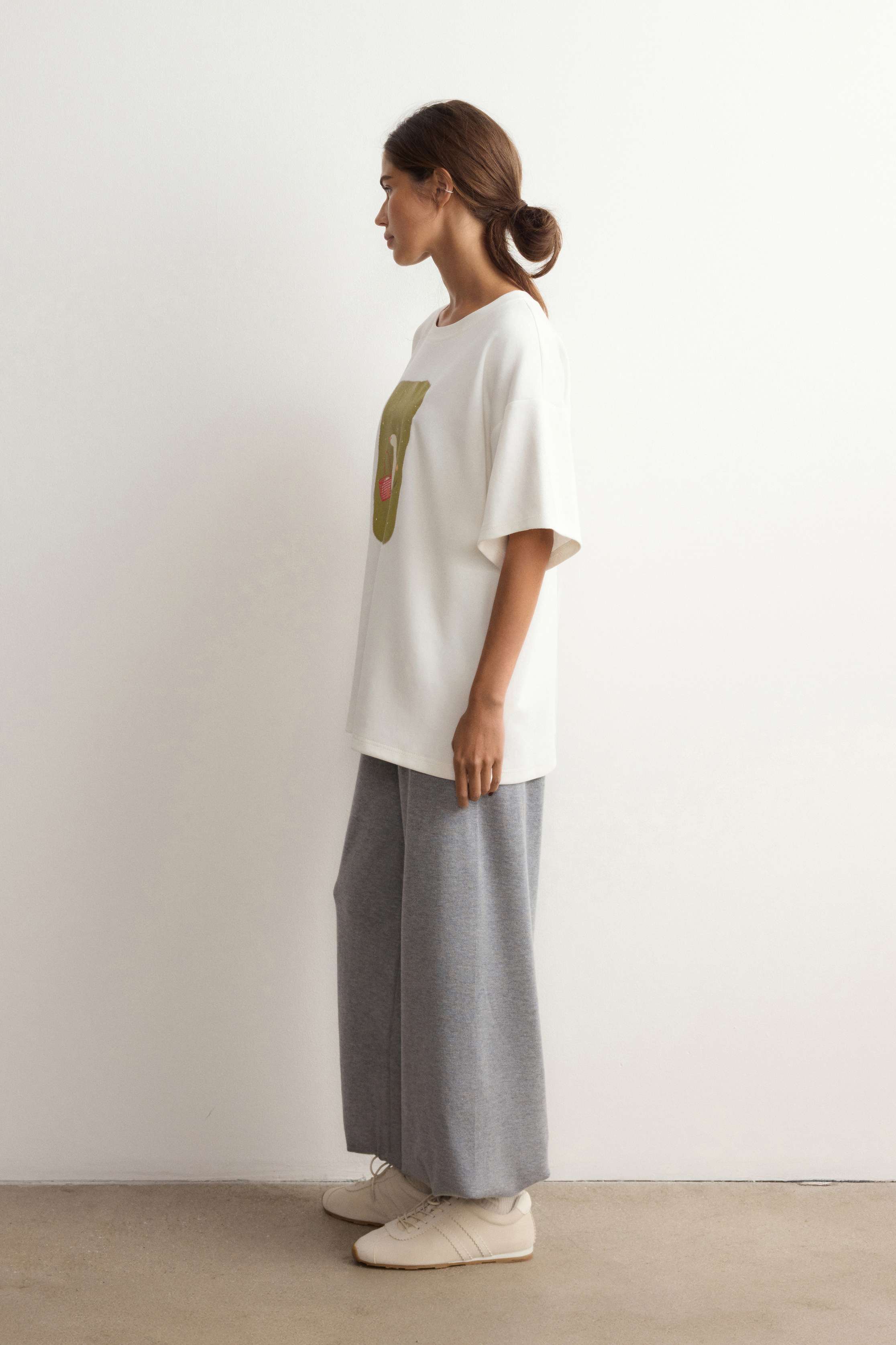 Сочетайте футболку с брюками из премиального льна, дополняя образ плетеными балетками и той самой сумкой.