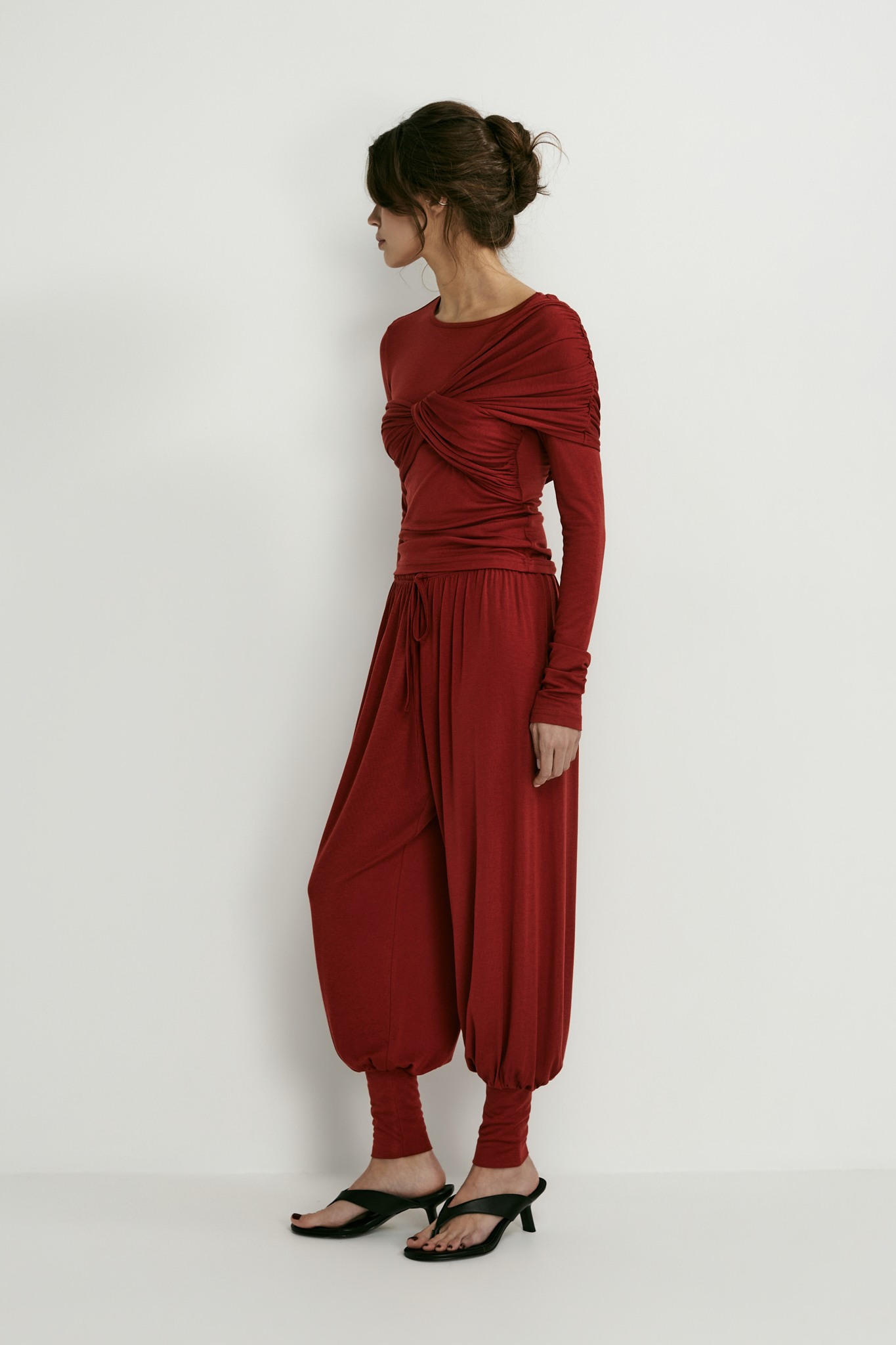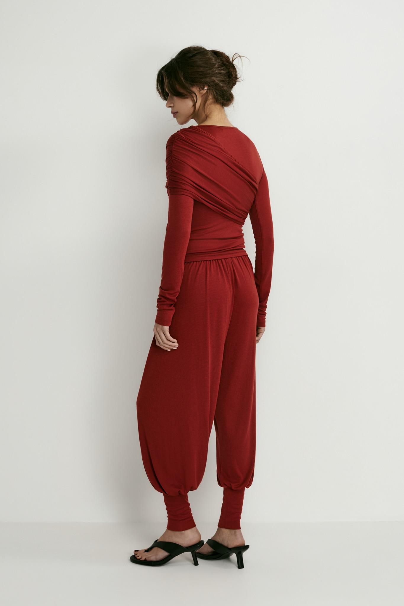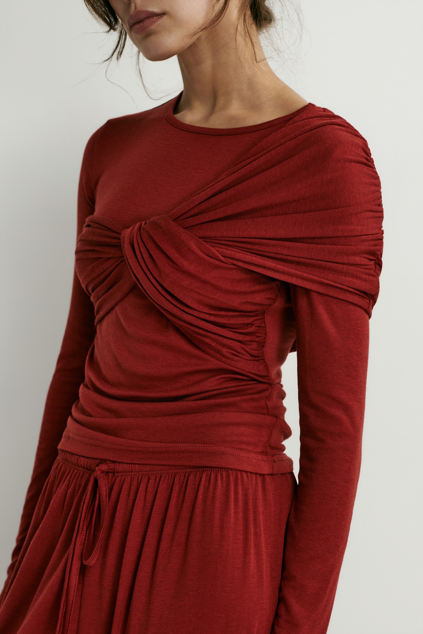 Лонгслив с аккуратным круглым вырезом идеален не только в качестве нижнего слоя под жакет — перекрут на груди превращает его в самостоятельный верх и делает изящным акцентом в образе.