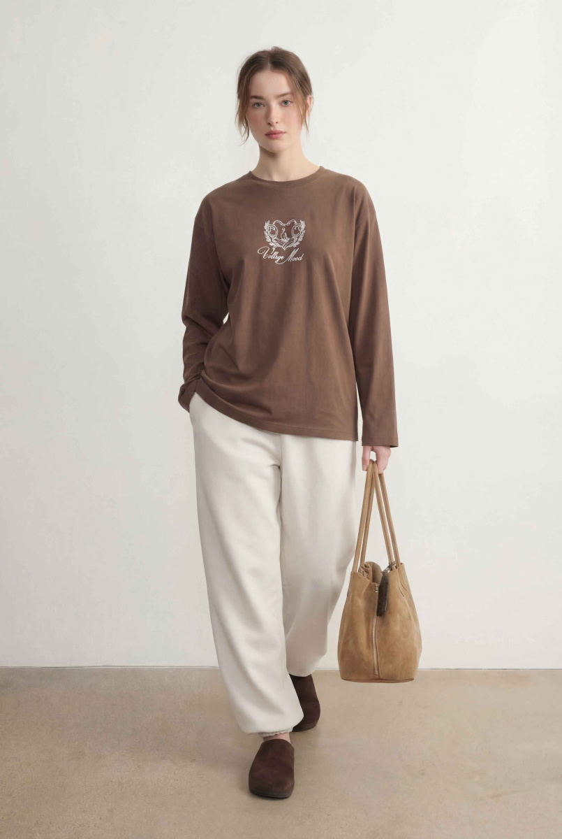 Базовый лонгслив в шоколадном оттенке — украсили его авторской вышивкой, напоминающей о детстве в деревне у бабушки.
