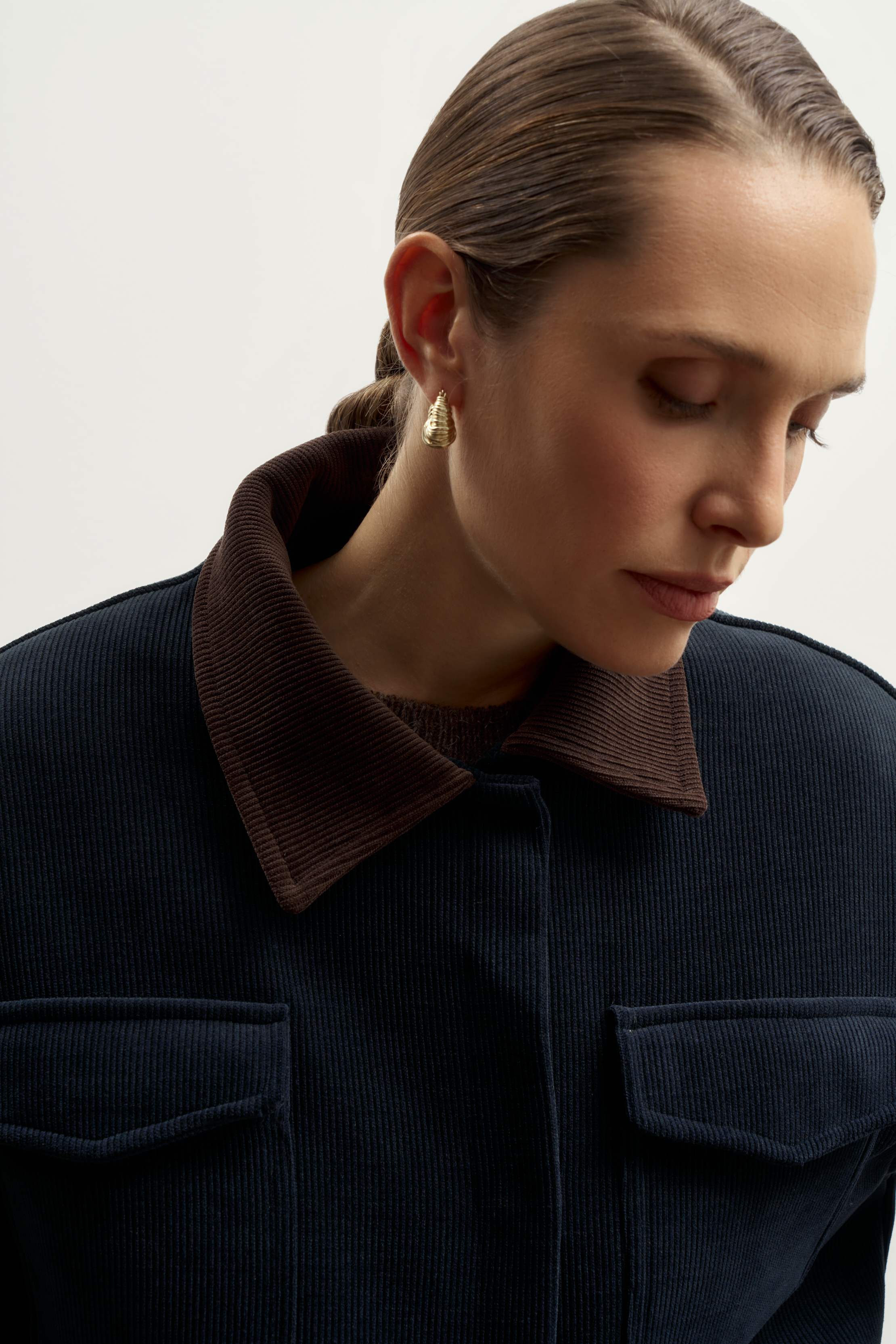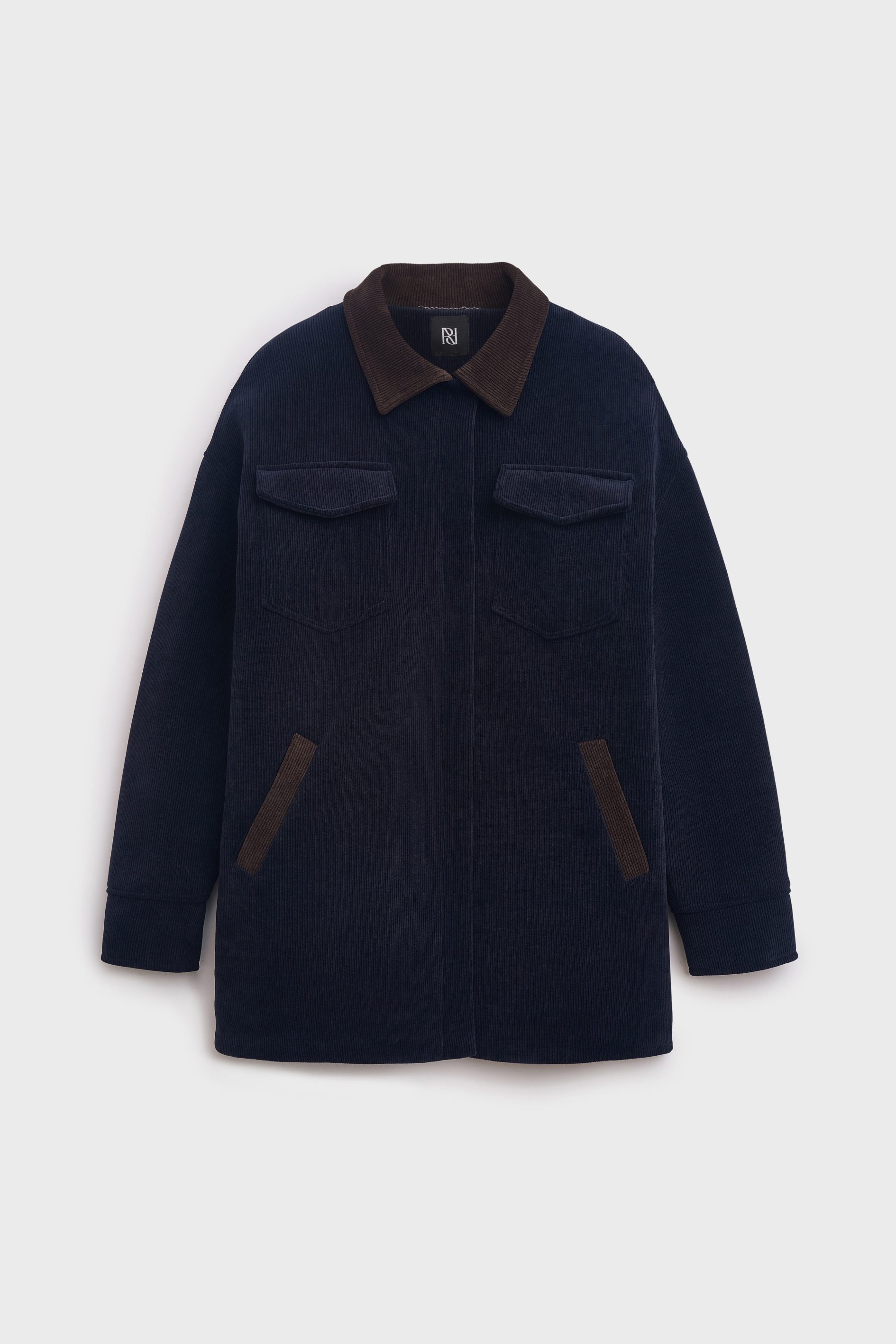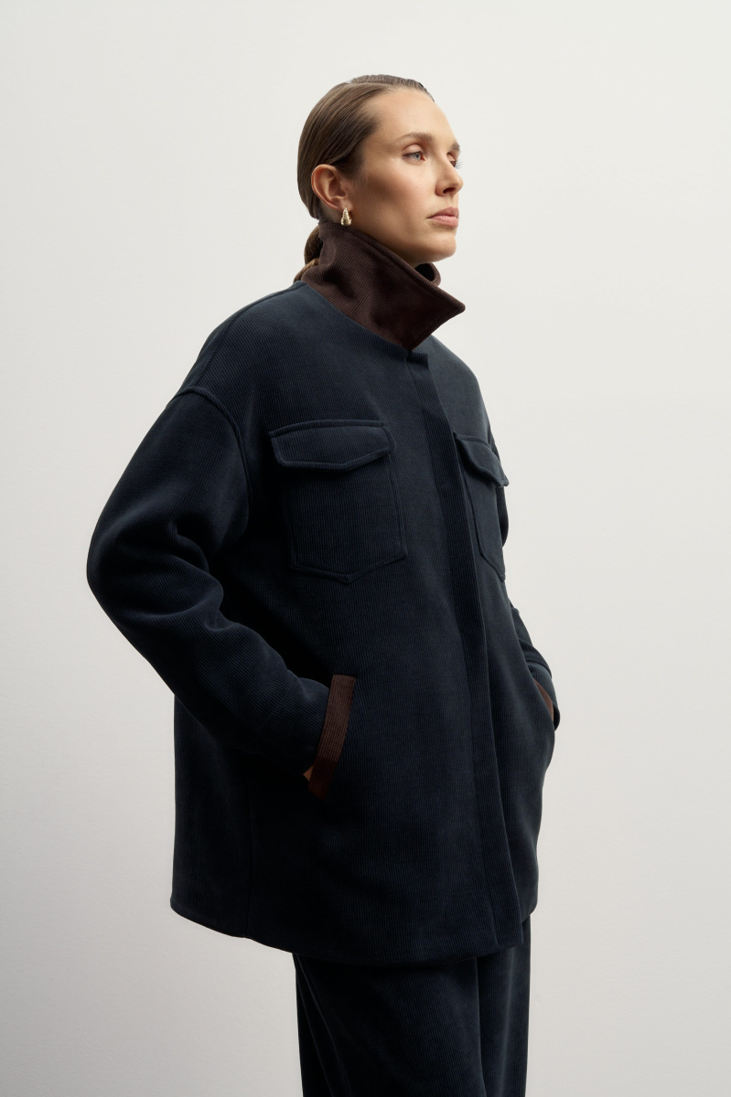 Главная особенность модели — контраст цветов. Насыщенный синий оттенок встречается с шоколадным на воротнике и боковых карманах, рождая неповторимое осеннее сочетание. В этой куртке продумано все, от потайной застежки на кнопки до петельки-цепочки.