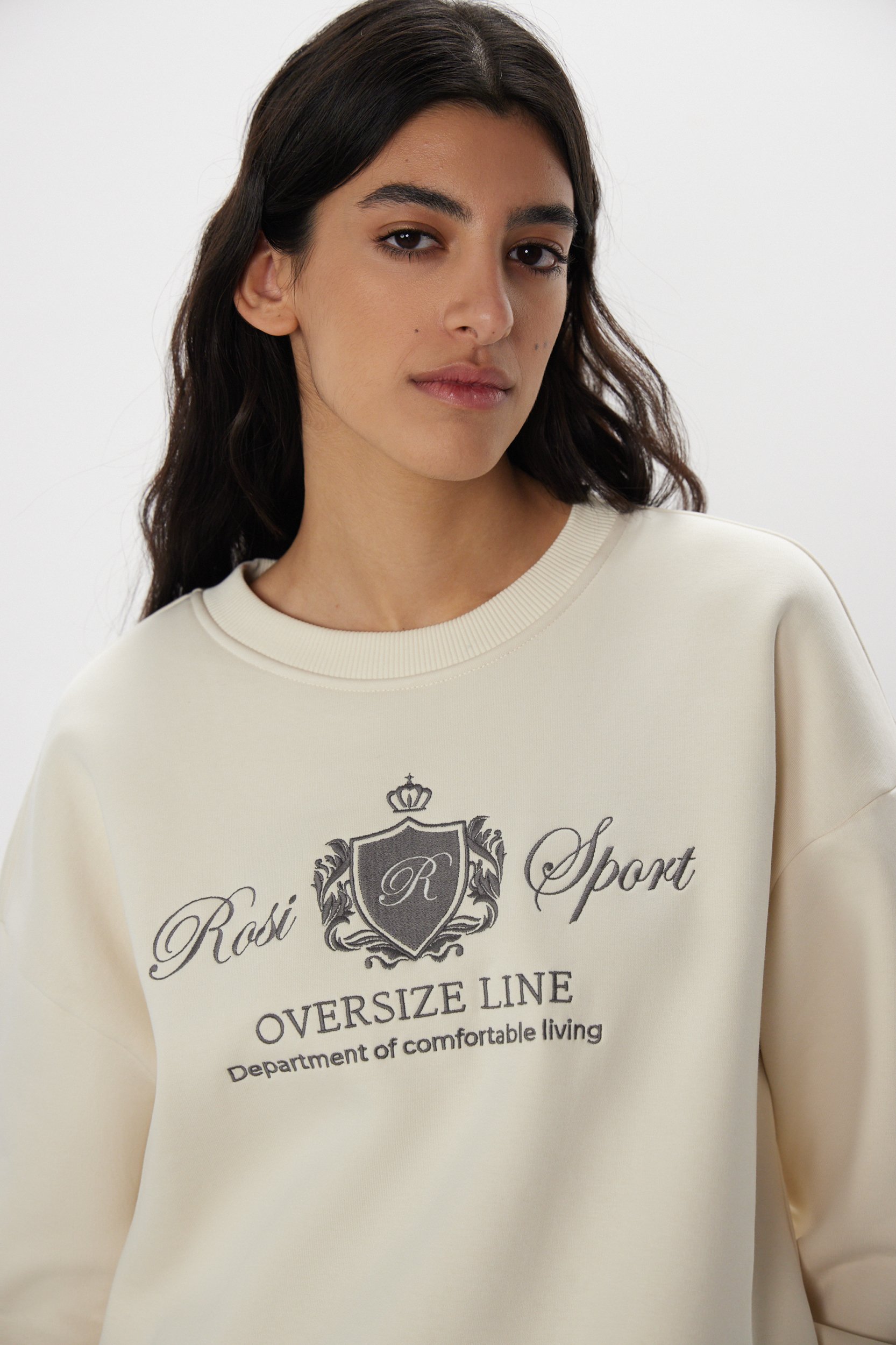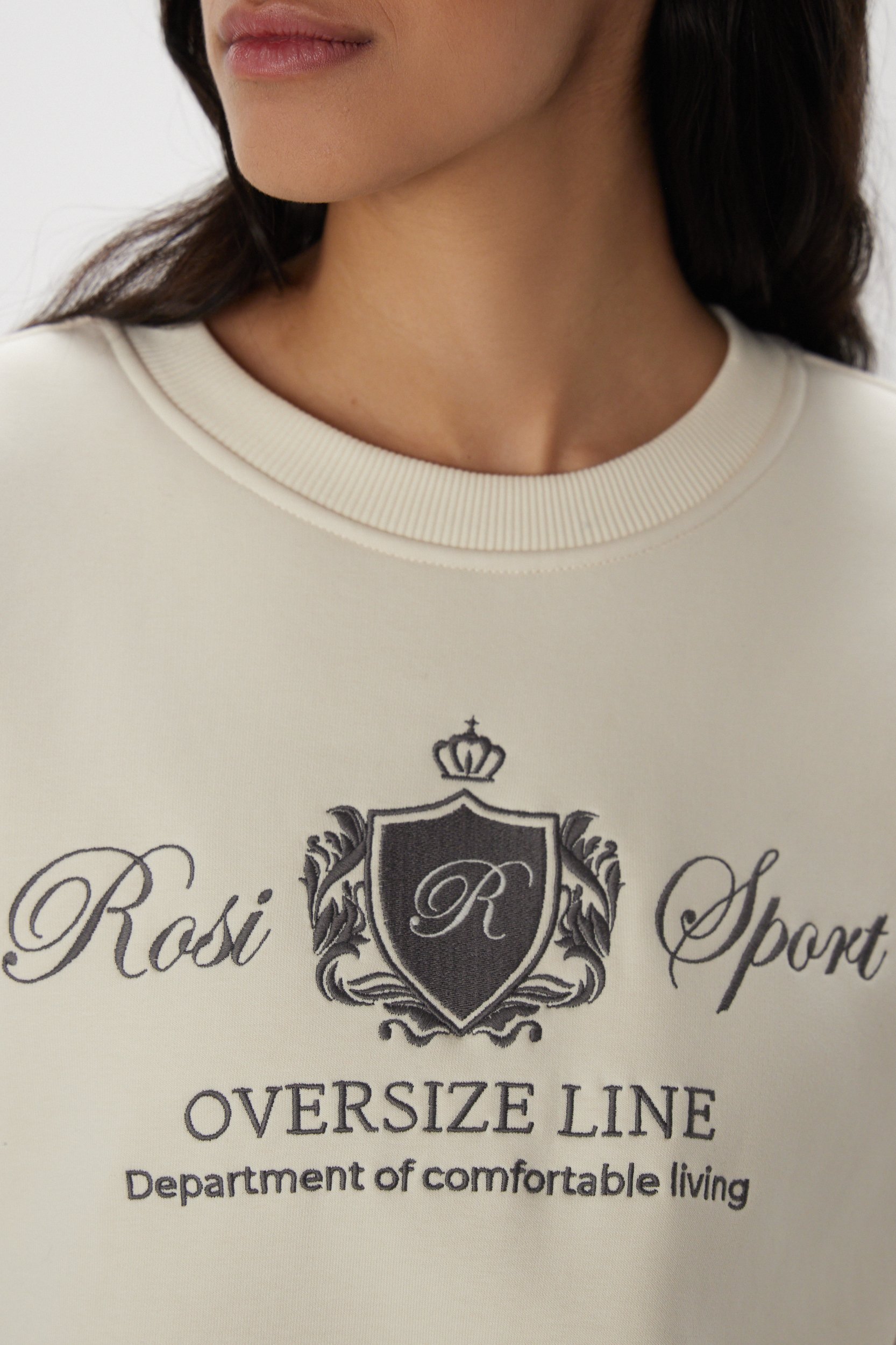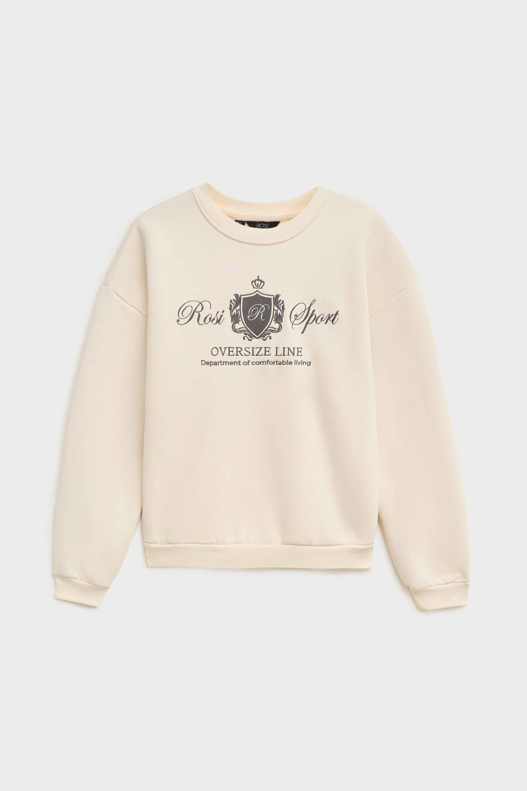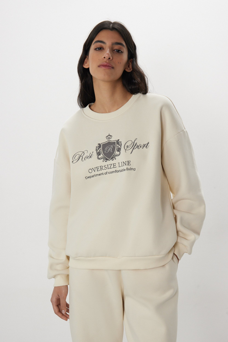 Универсальный свитшот с фирменной вышивкой от команды дизайнеров ROSI. Круглый вырез, свободный крой, мягкие резинки на горловине, манжетах и по нижнему краю и универсальный сливочный оттенок, который впишется в любой гардероб.