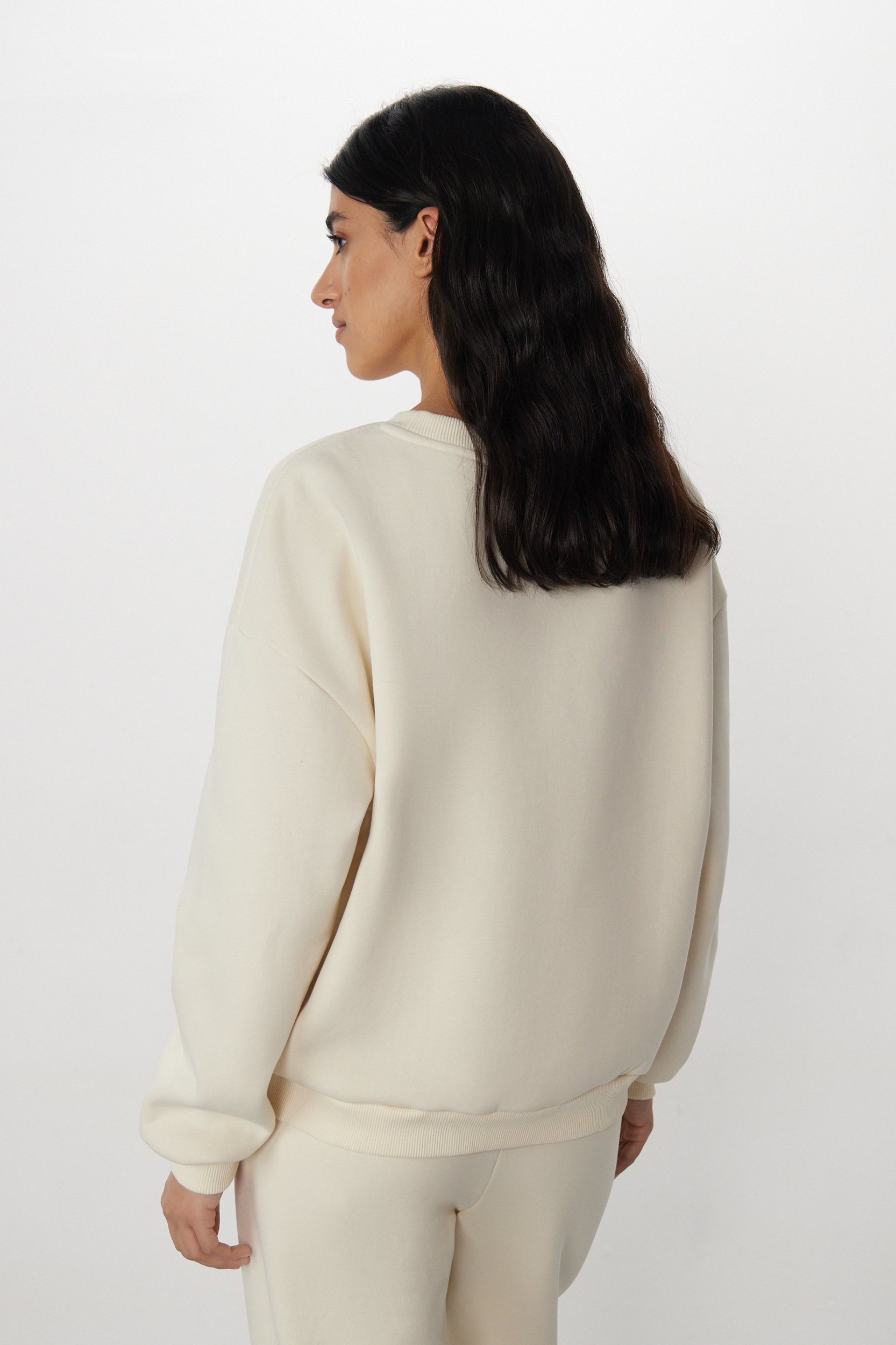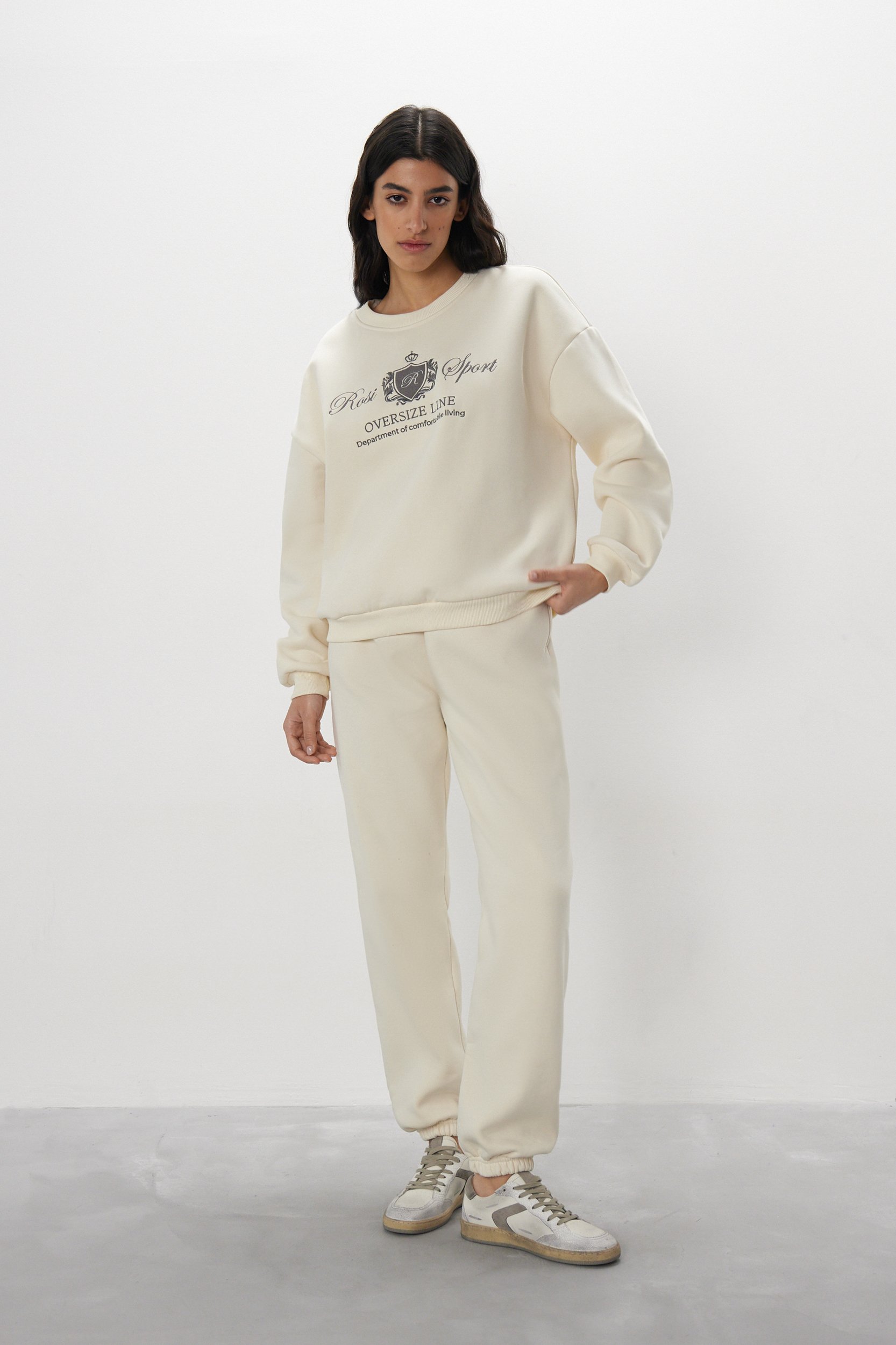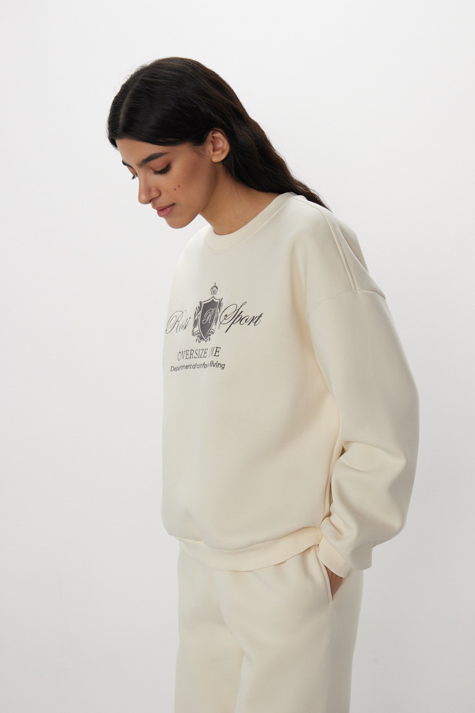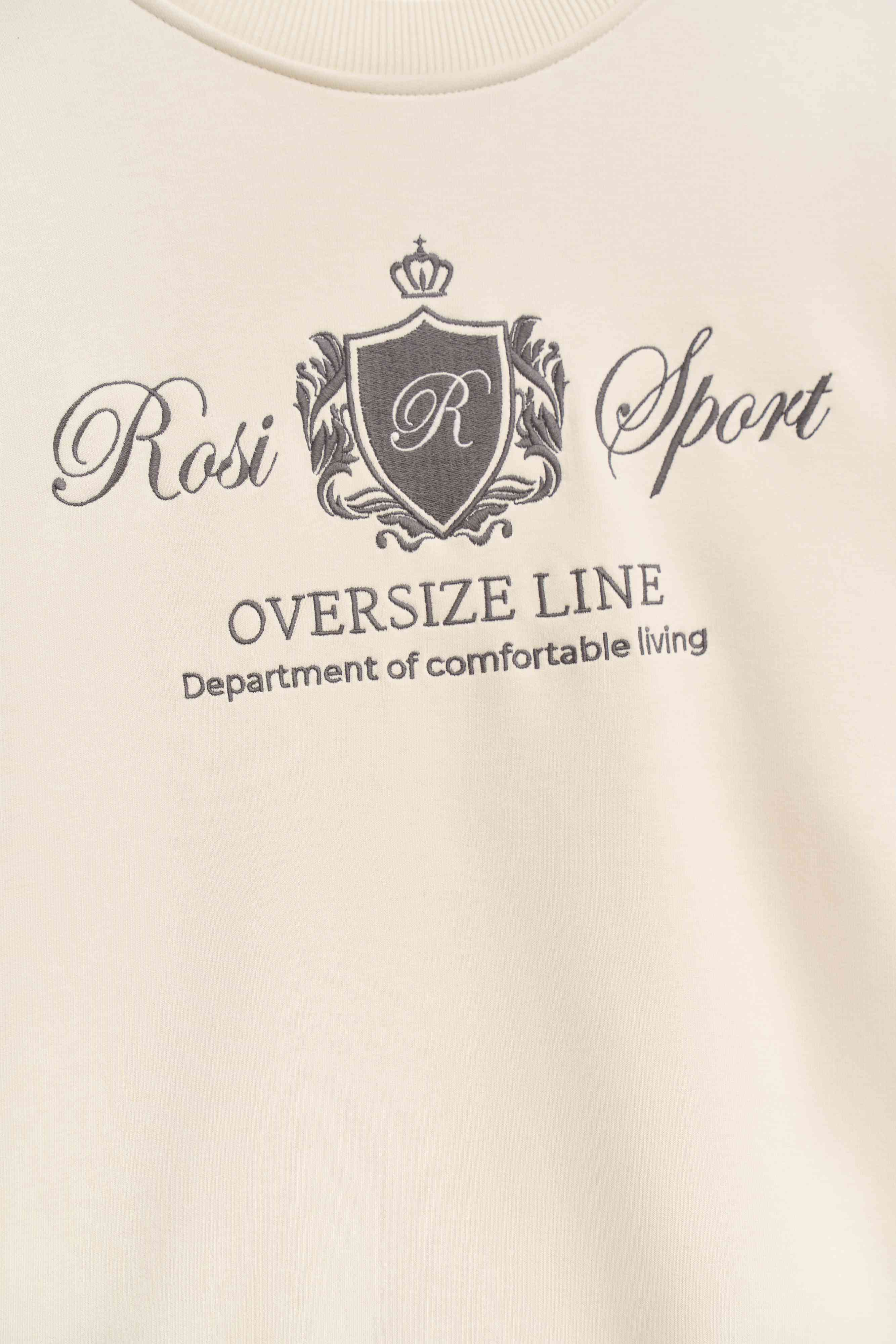 Универсальный свитшот с фирменной вышивкой от команды дизайнеров ROSI. Круглый вырез, свободный крой, мягкие резинки на горловине, манжетах и по нижнему краю и универсальный сливочный оттенок, который впишется в любой гардероб.
