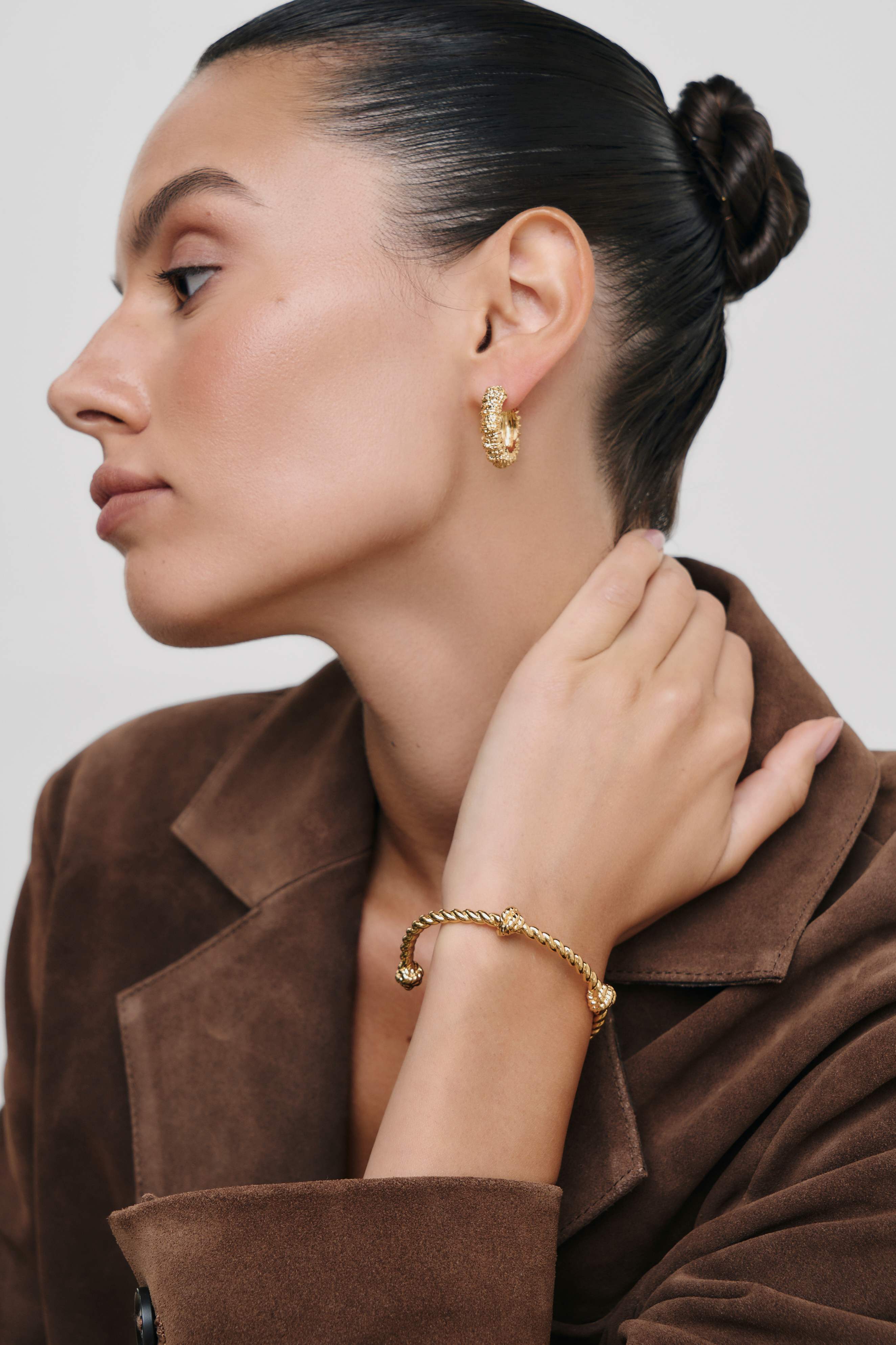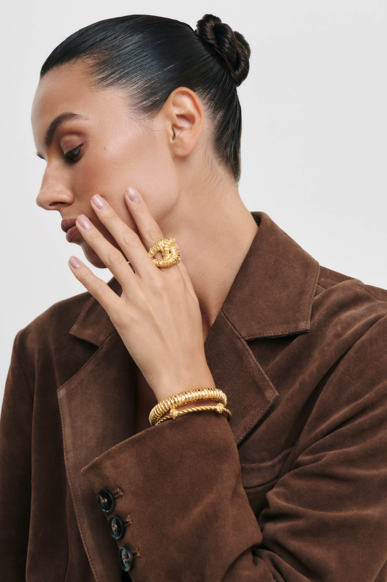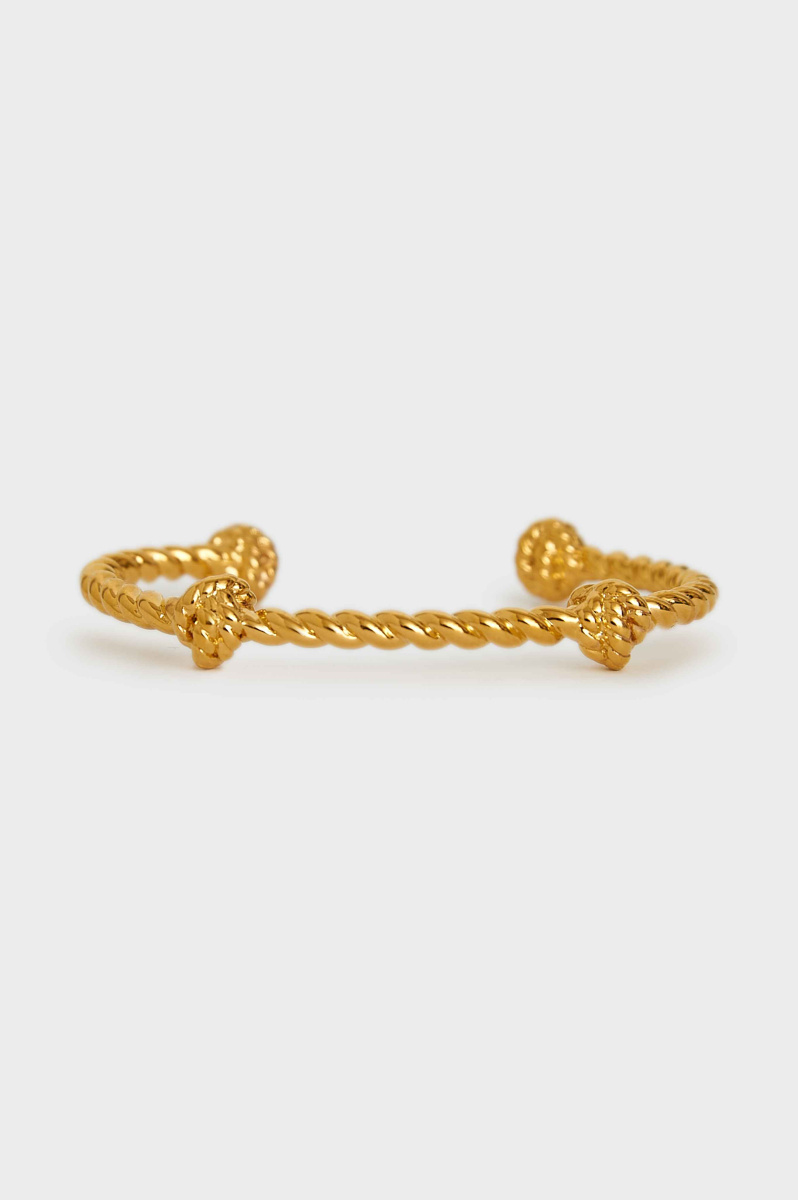 Плетение браслета напоминает туго скрученную веревку с узлами по длине. Незамкнутая конструкция позволяет аксессуару надежно обвить запястье, сохранив ощущение легкости.